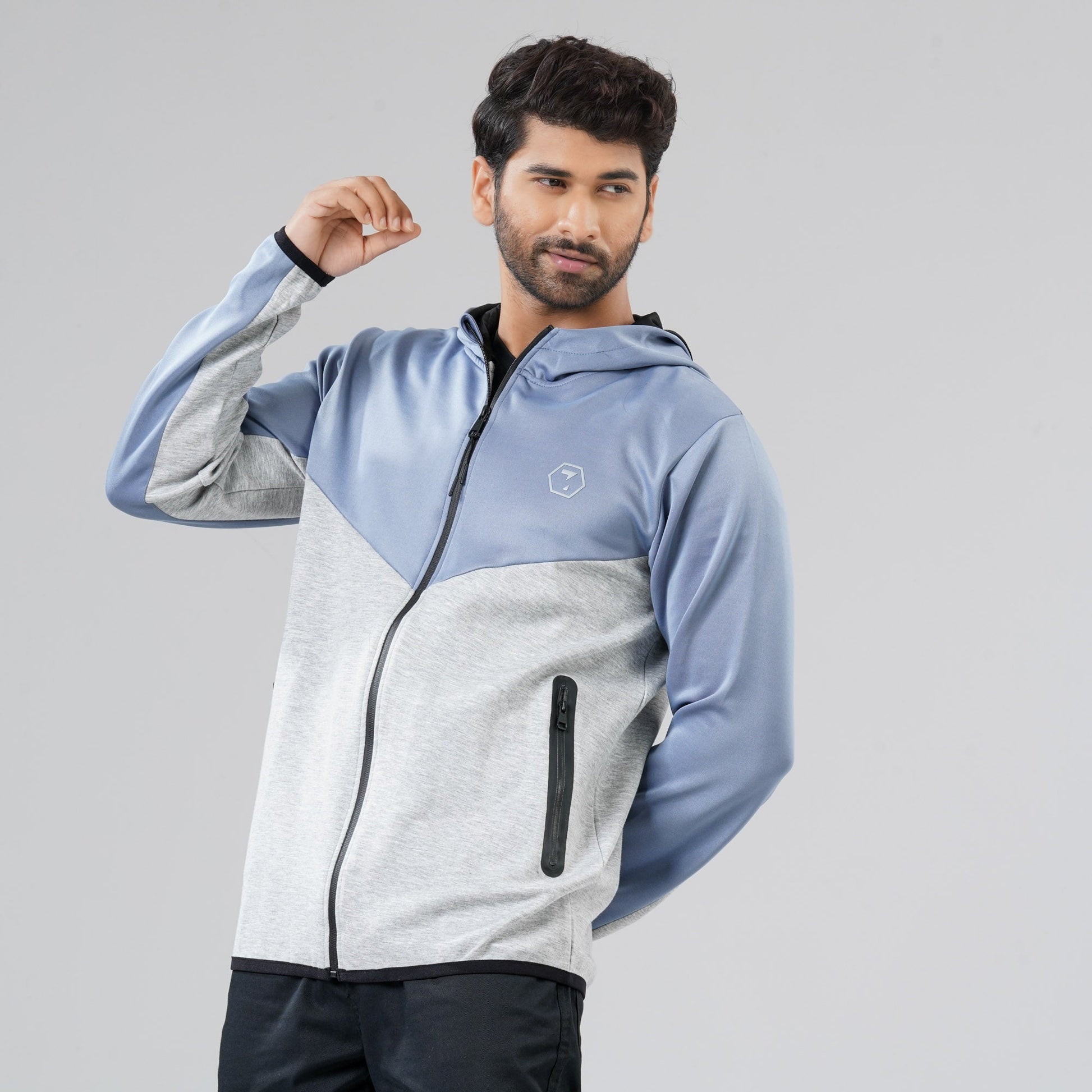 This men’s blue and grey melange hoodie features a regular fit with a front zipper and reflective print for added style. Crafted from soft scuba fabric with cut-and-sew detailing, it offers comfort and durability. Perfect for active wear or casual outings, combining functionality with modern design.