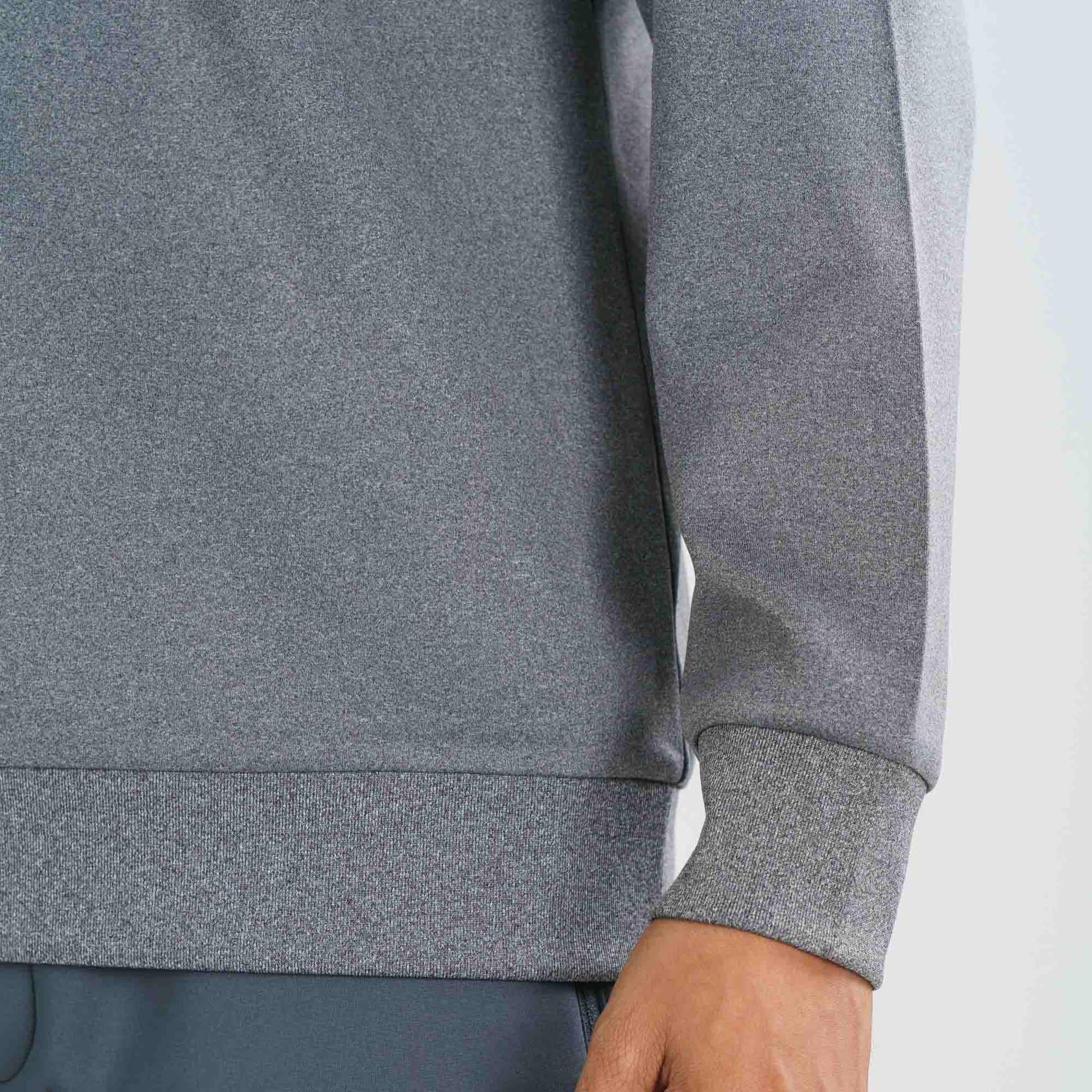 This grey melange sweatshirt for men features a stylish cut-and-sew design on the chest with a bold plastisol print. Made from a durable polyester-spandex scuba blend, it offers a comfortable regular fit, ideal for casual wear with a contemporary touch. A versatile piece for any modern wardrobe.