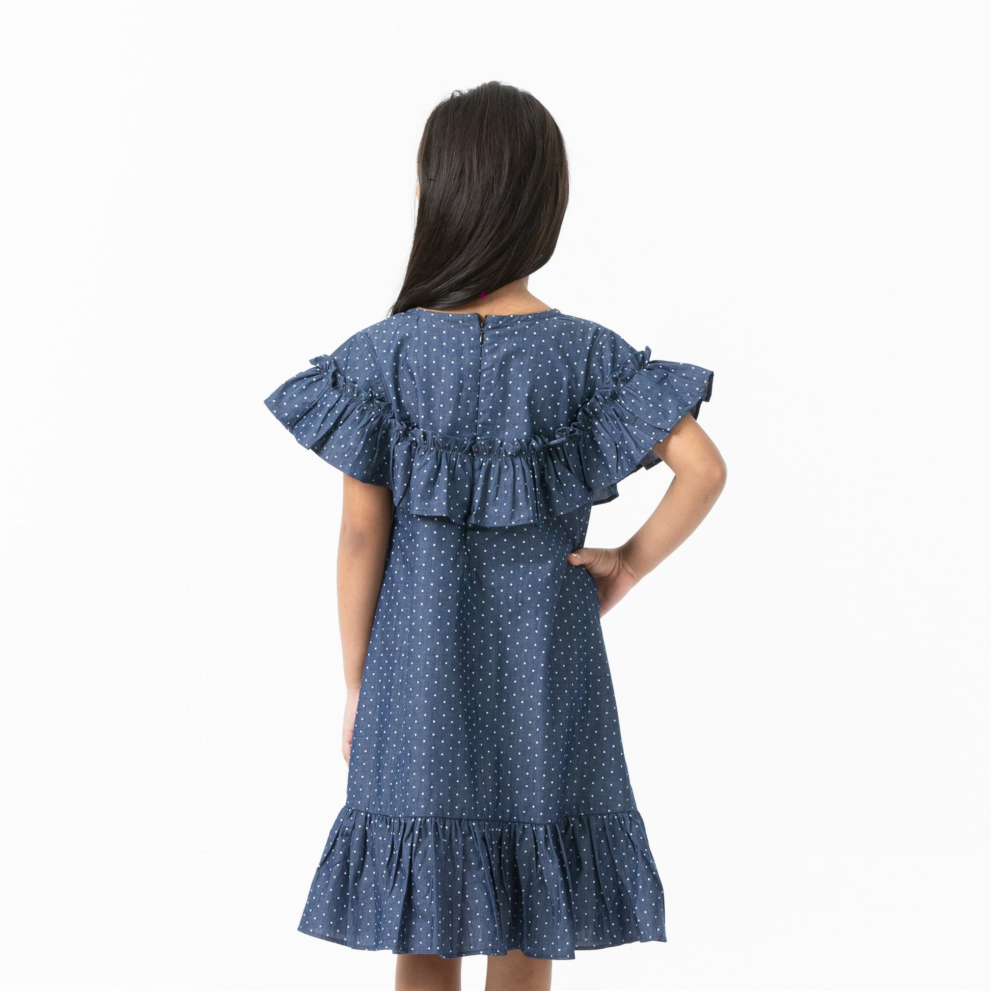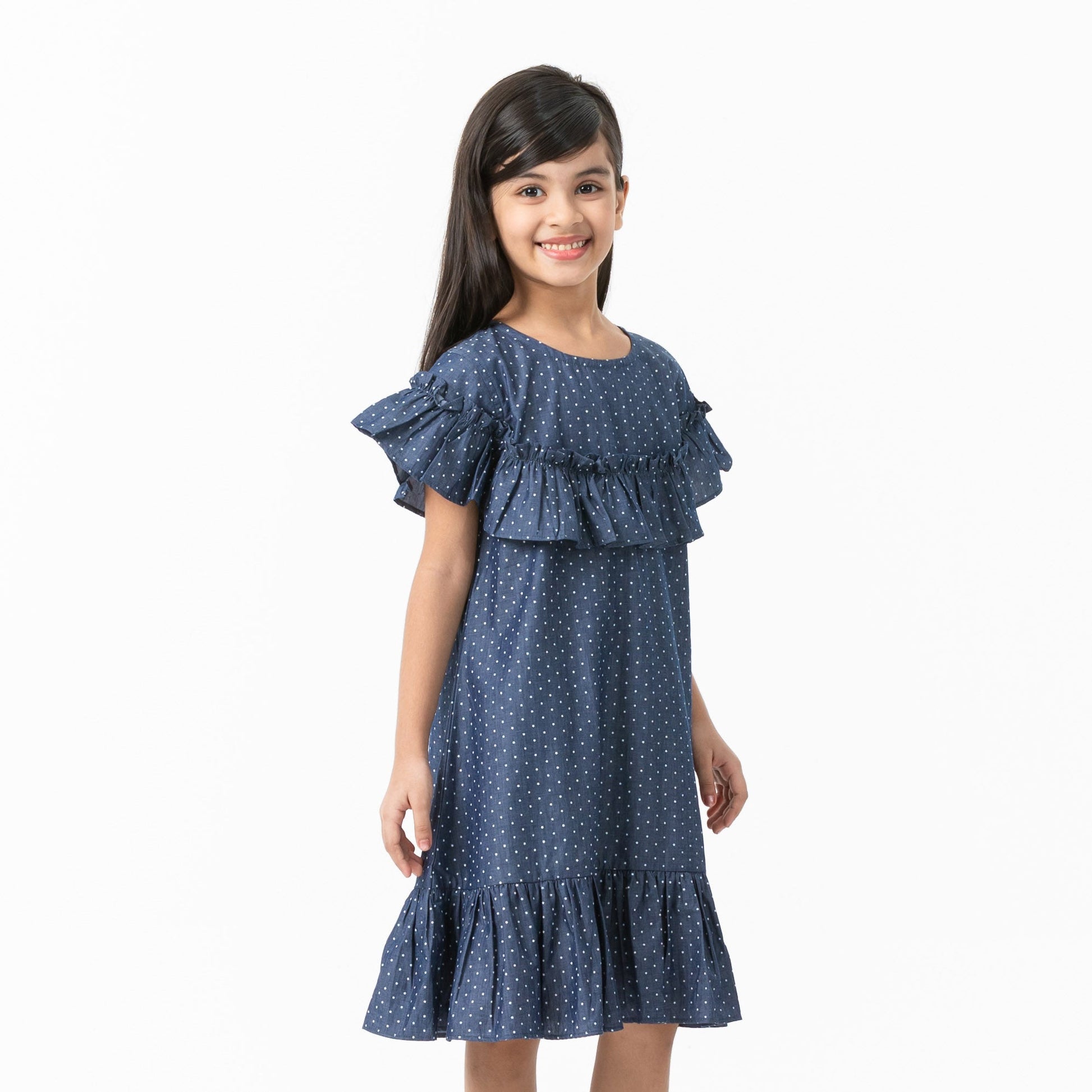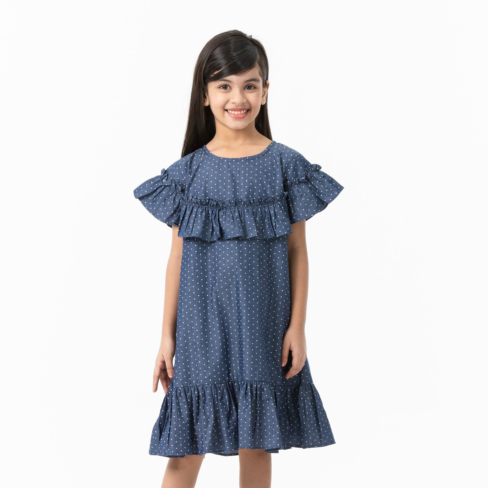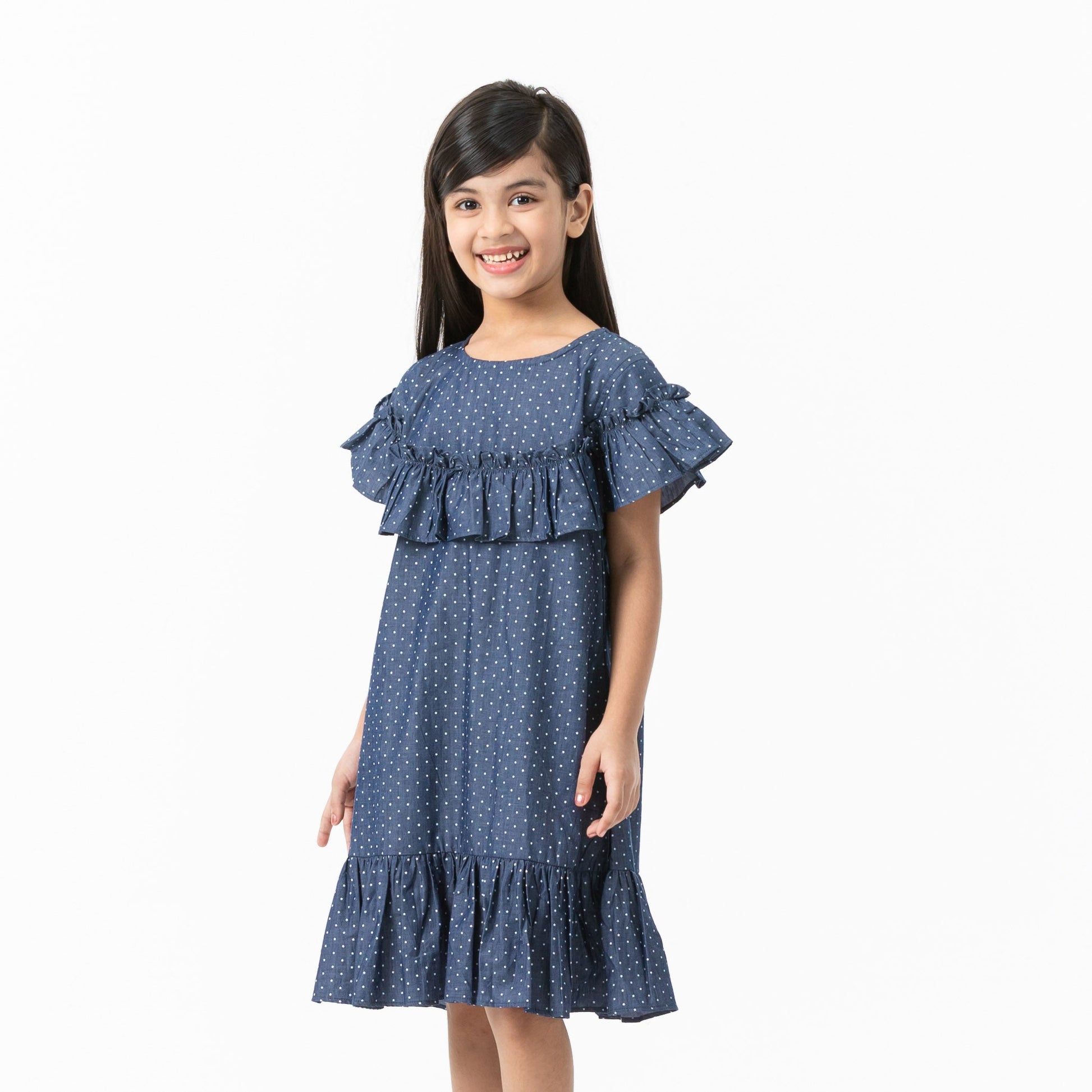This light-black dress for girls features a charming frill with gathers on the top part, adding a playful touch to its classic design. Made from 100% cotton, it offers breathability and comfort, perfect for all-day wear. The soft, lightweight fabric ensures ease of movement, making it a great choice for any casual outing or special occasion.