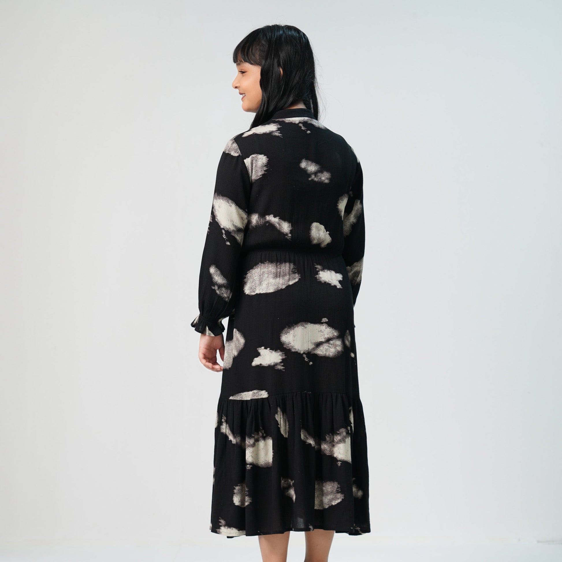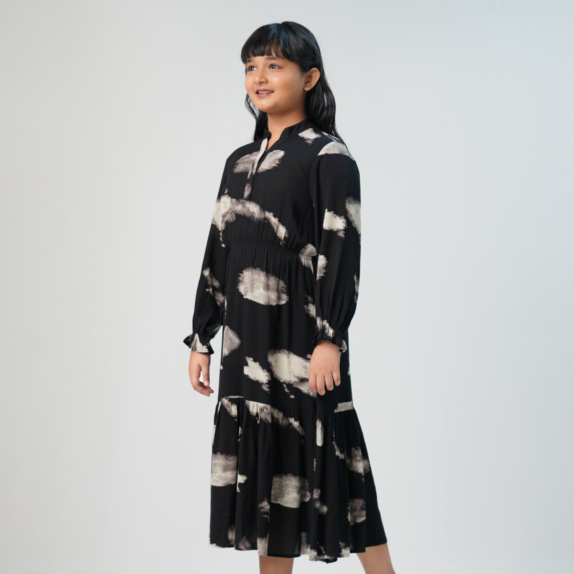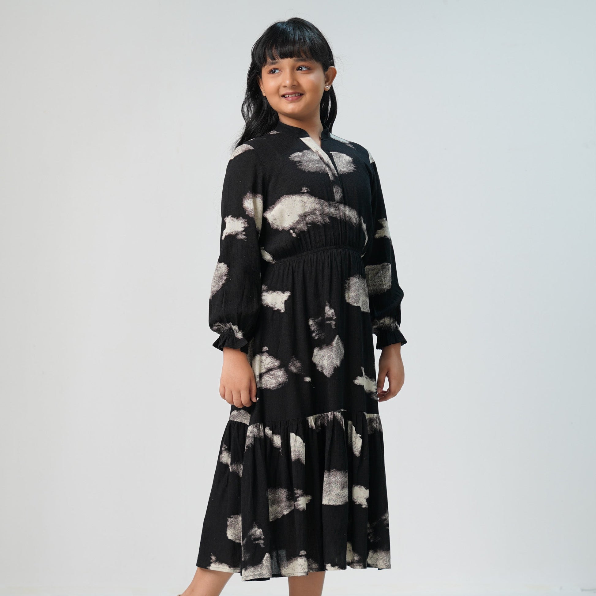 Stylish girls’ dress featuring an all-over print in black. Made from soft, breathable fabric for all-day comfort. Perfect for casual outings or special occasions.