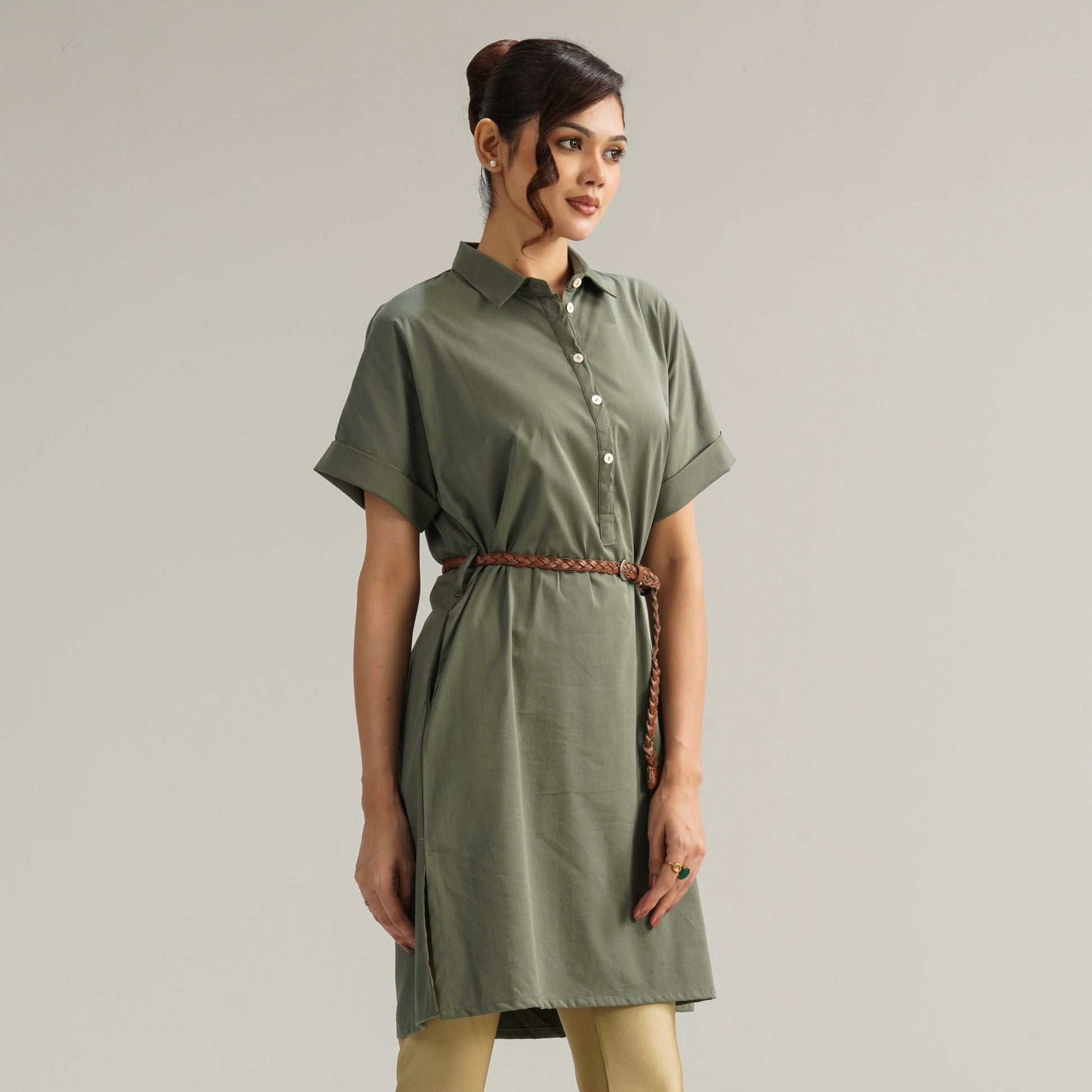 This elegant green shirt dress is designed for both style and comfort. Crafted from premium blended fabric, it features a decorative belt that enhances the silhouette, adding a touch of sophistication. Perfect for casual outings or semi-formal occasions, this regular-fit dress is a must-have for your wardrobe.