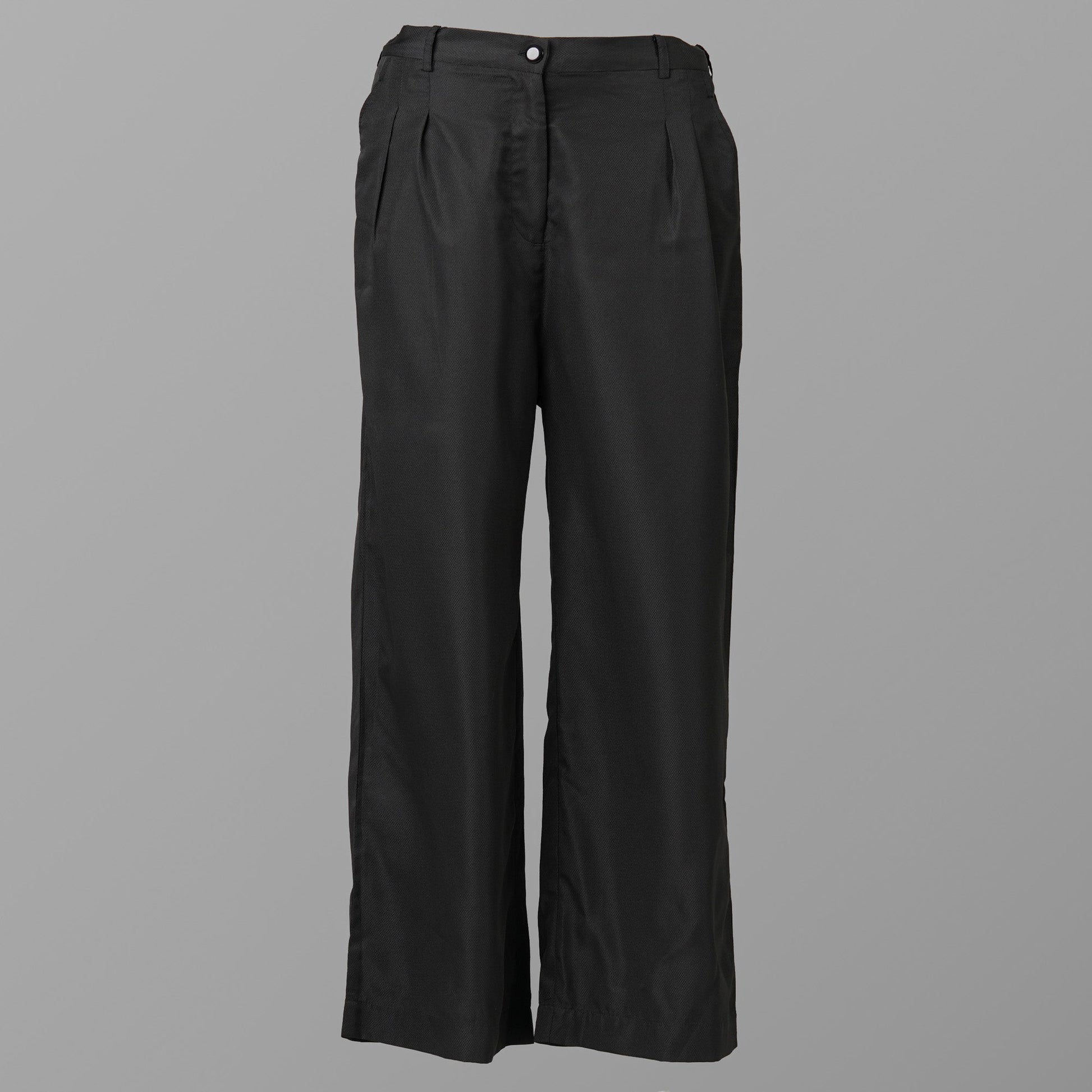 These womens black pants feature a formal design with a shank button for a polished look. Made from a cotton-polyester blend, they offer a regular fit that ensures comfort and sophistication, making them ideal for professional or formal settings.