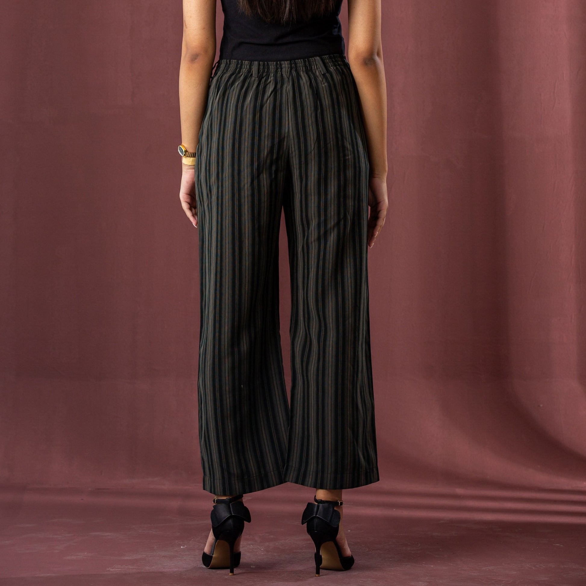 These women's black-brown stripe pants feature a formal design with a shank button for a polished look. Made from a cotton-polyester blend, they offer a regular fit that ensures comfort and sophistication, making them ideal for professional or formal settings.