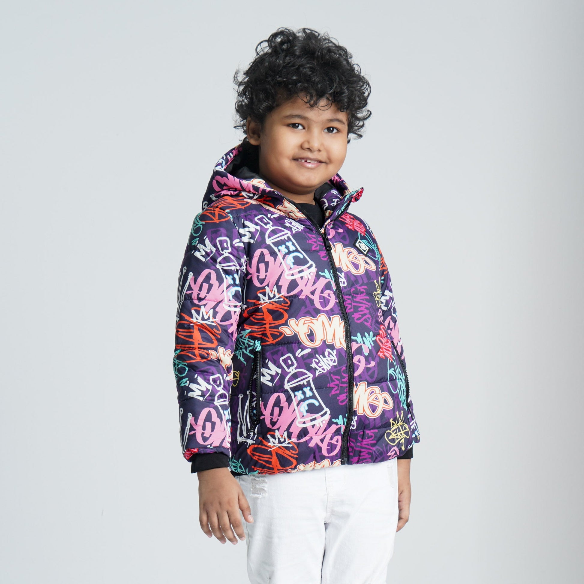 Keep warm and cozy with this baby boys printed padded jacket in purple and yellow. Designed with a soft polyester padded body, it features a hoodie for extra warmth, two functional pockets, and a rubber chest patch for a cute, stylish touch. The zip closure and straight hemline ensure easy wear and a comfortable regular fit. Fully lined for added comfort, this jacket is perfect for chilly winter days.