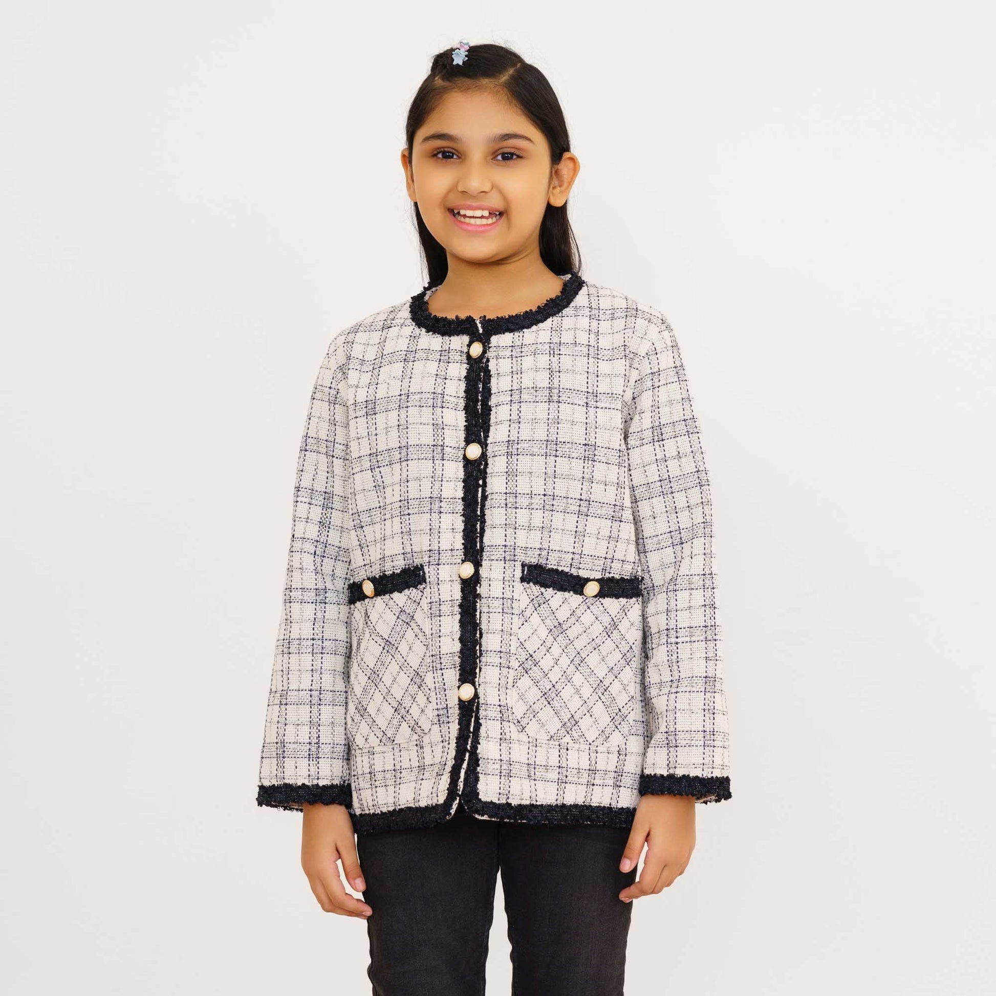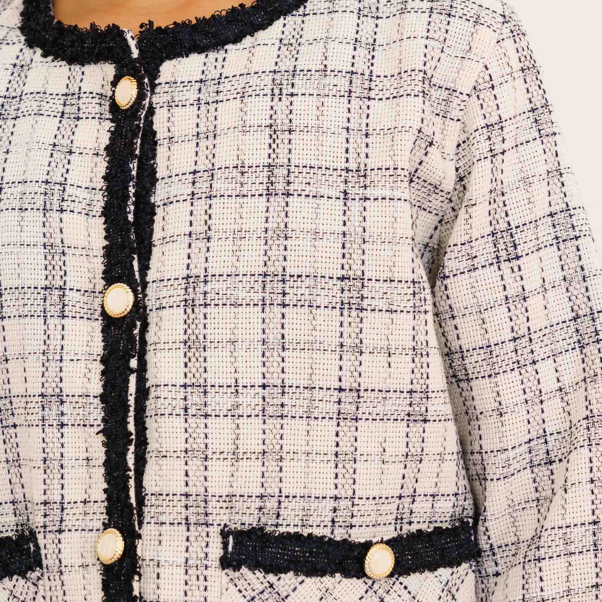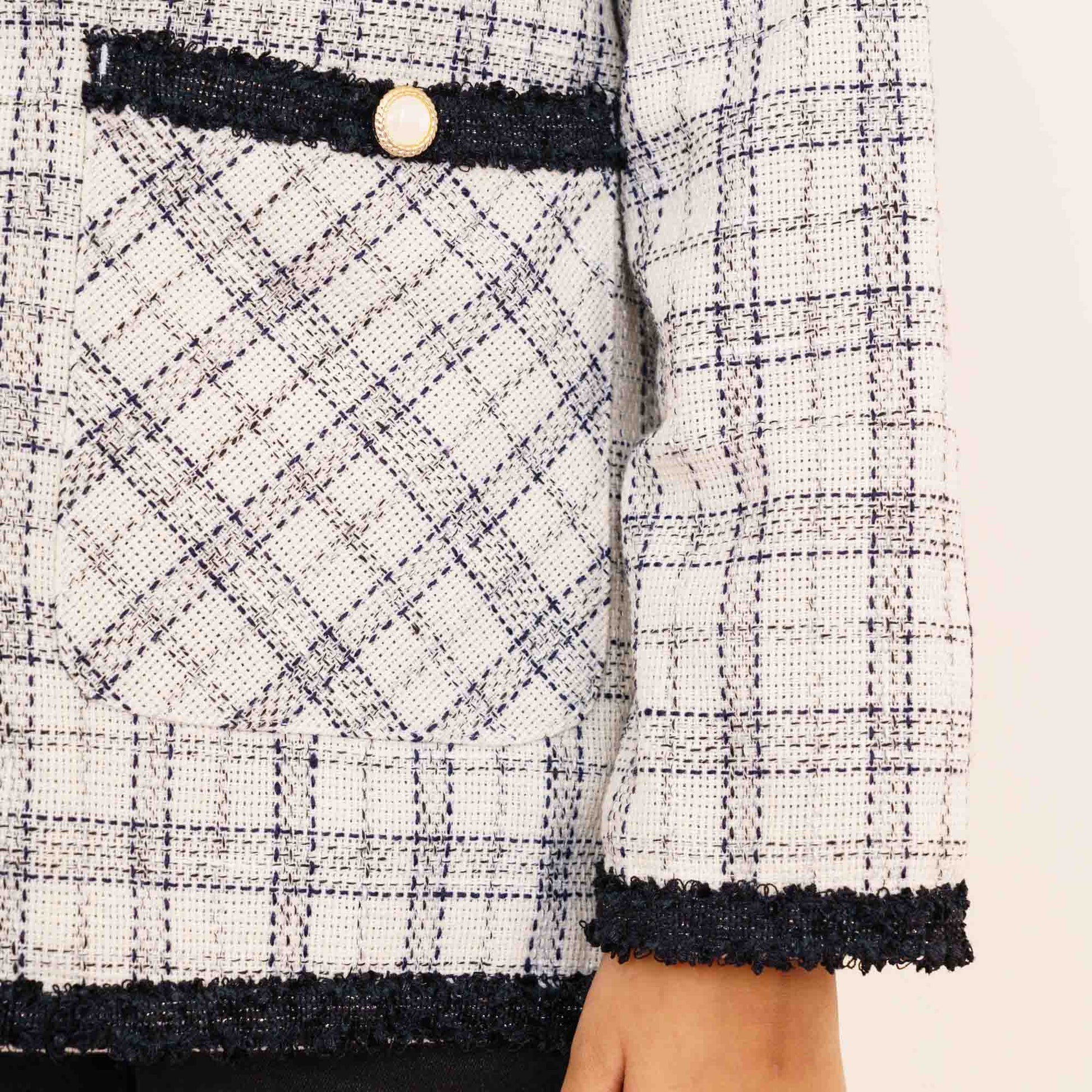 Stay effortlessly stylish with this white and black checked shacket, crafted from check fabric with a smooth taffeta lining. It features a band collar, decorative buttons, a chest pocket with flap, long sleeves, and a straight hem. Perfect for layering, this versatile piece combines comfort and modern style for everyday wear.