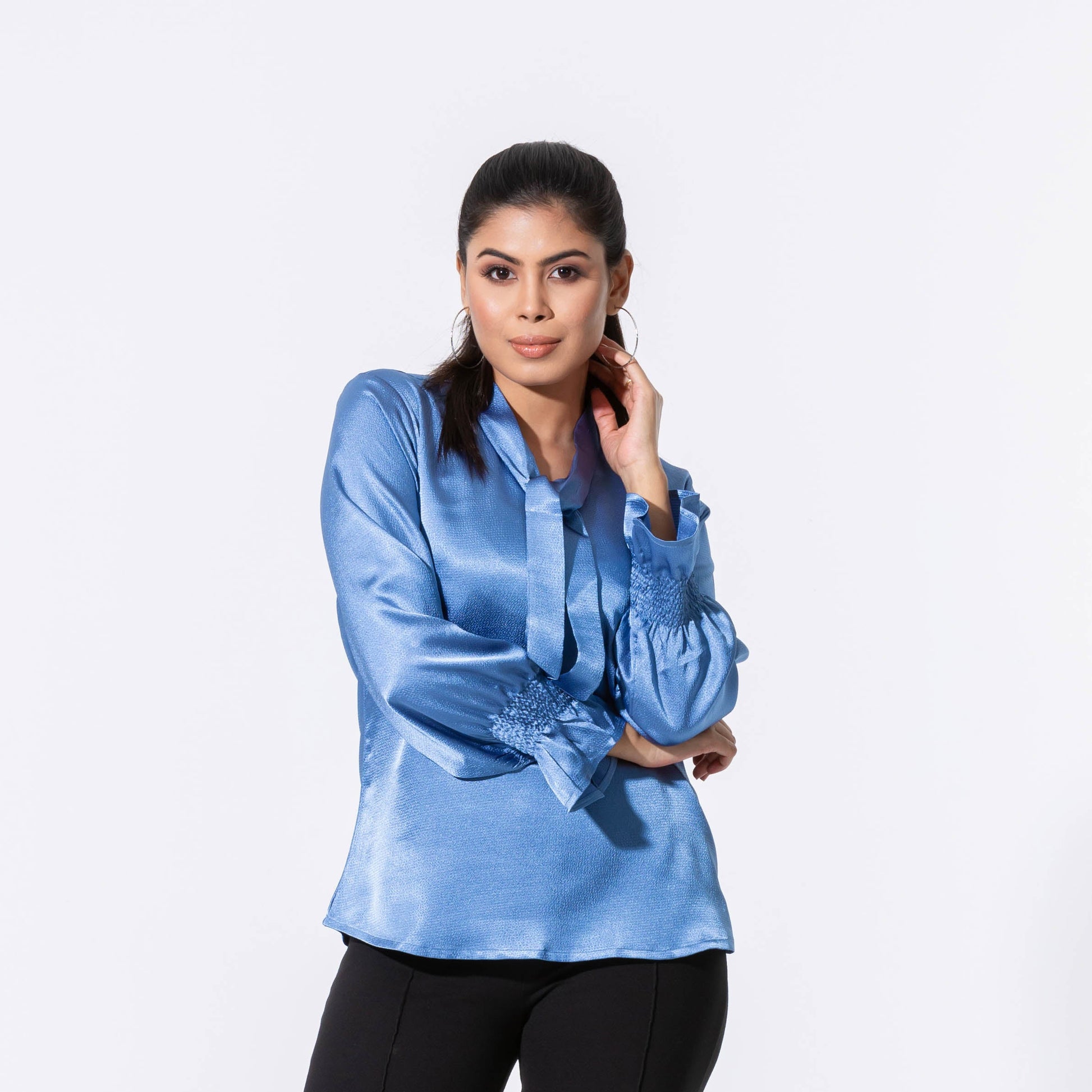 This elegant blue formal top features a soft collar with a stylish knot at the neck opening and sleeves detailed with smocking at the hem. Crafted from luxurious silk, it offers a sophisticated look perfect for office wear or a polished evening outfit.