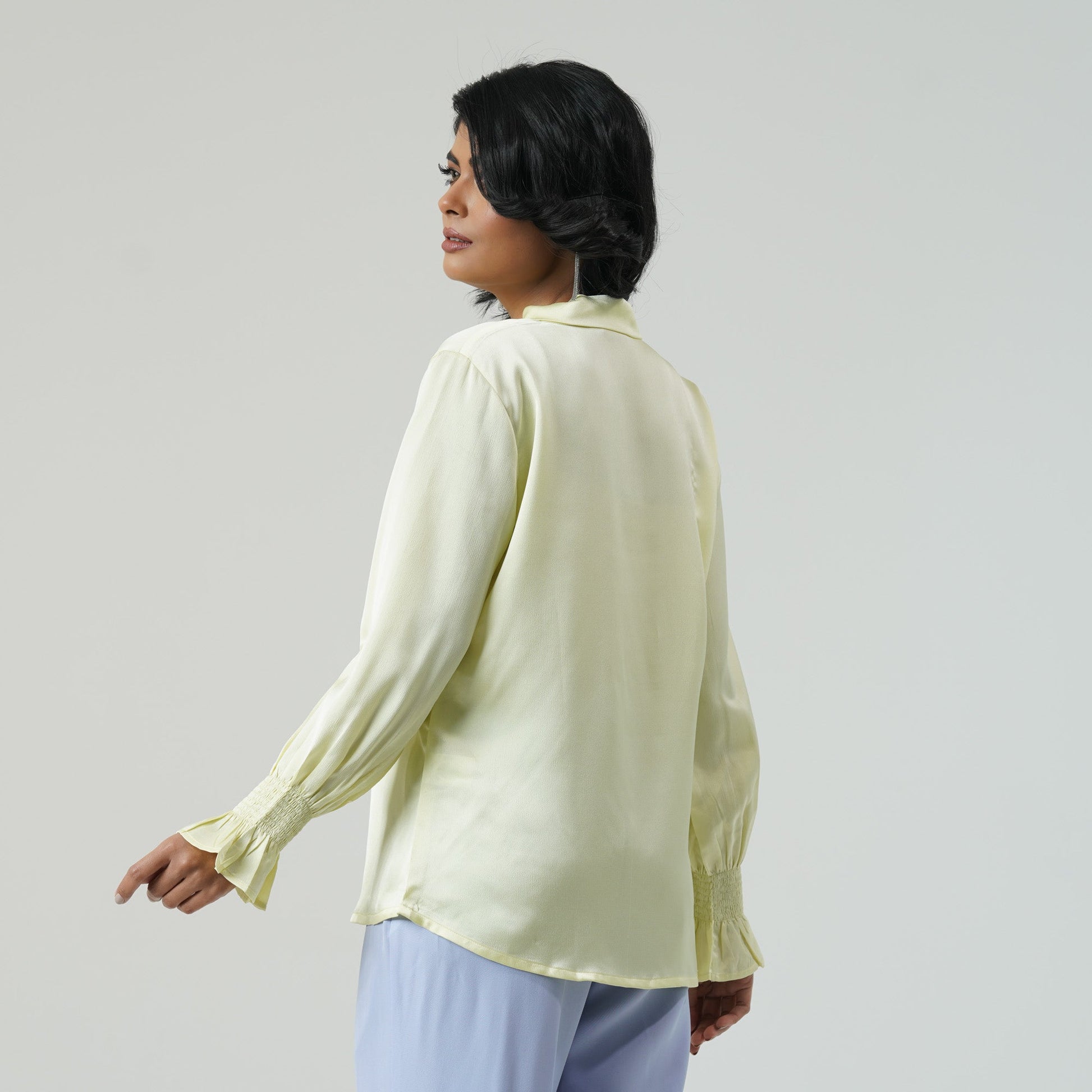 This elegant yellow formal top features a soft collar with a stylish knot at the neck opening and sleeves detailed with smocking at the hem. Crafted from luxurious silk, it offers a sophisticated look perfect for office wear or a polished evening outfit.
