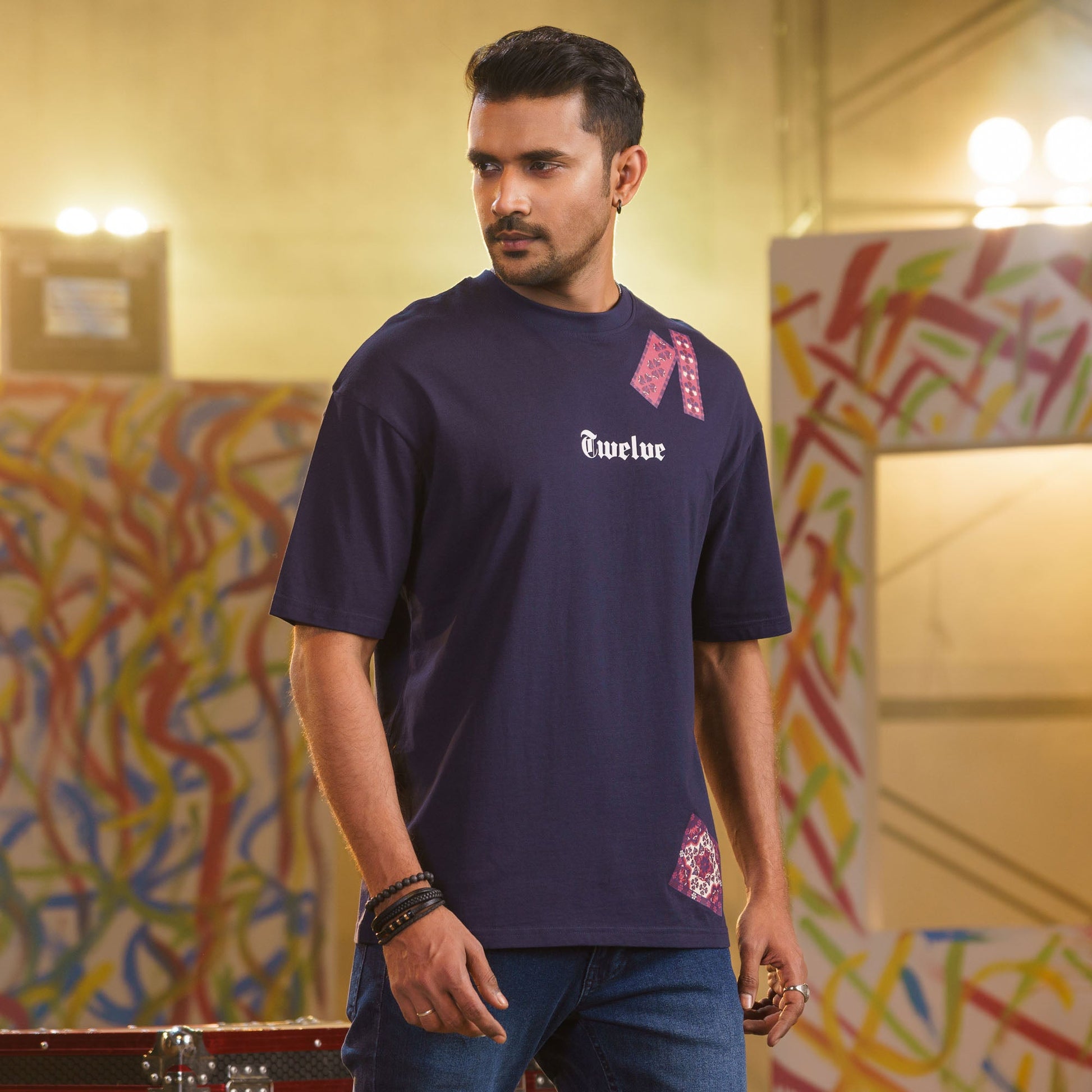 This drop shoulder T-shirt offers a comfortable fit with a bold print and classic crew neck design. Made from 100% cotton, it ensures softness and breathability for everyday wear. The deep navy color adds a refined and versatile touch, perfect for men who want a stylish yet relaxed look in their casual wardrobe.