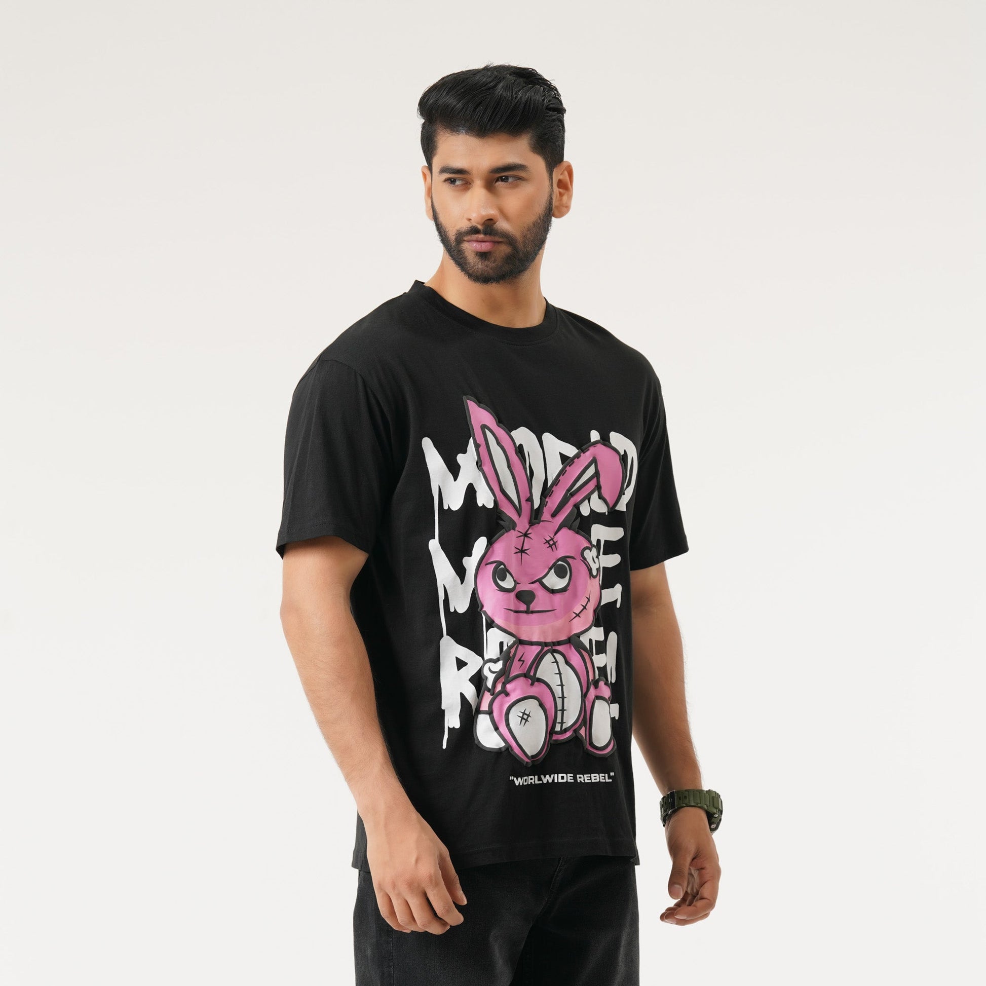 This black mens oversize t-shirt is made from 100% cotton, 220 GSM, ensuring a soft and breathable feel. It features a bold light puff print on the front, combining comfort with standout style perfect for casual, everyday wear.