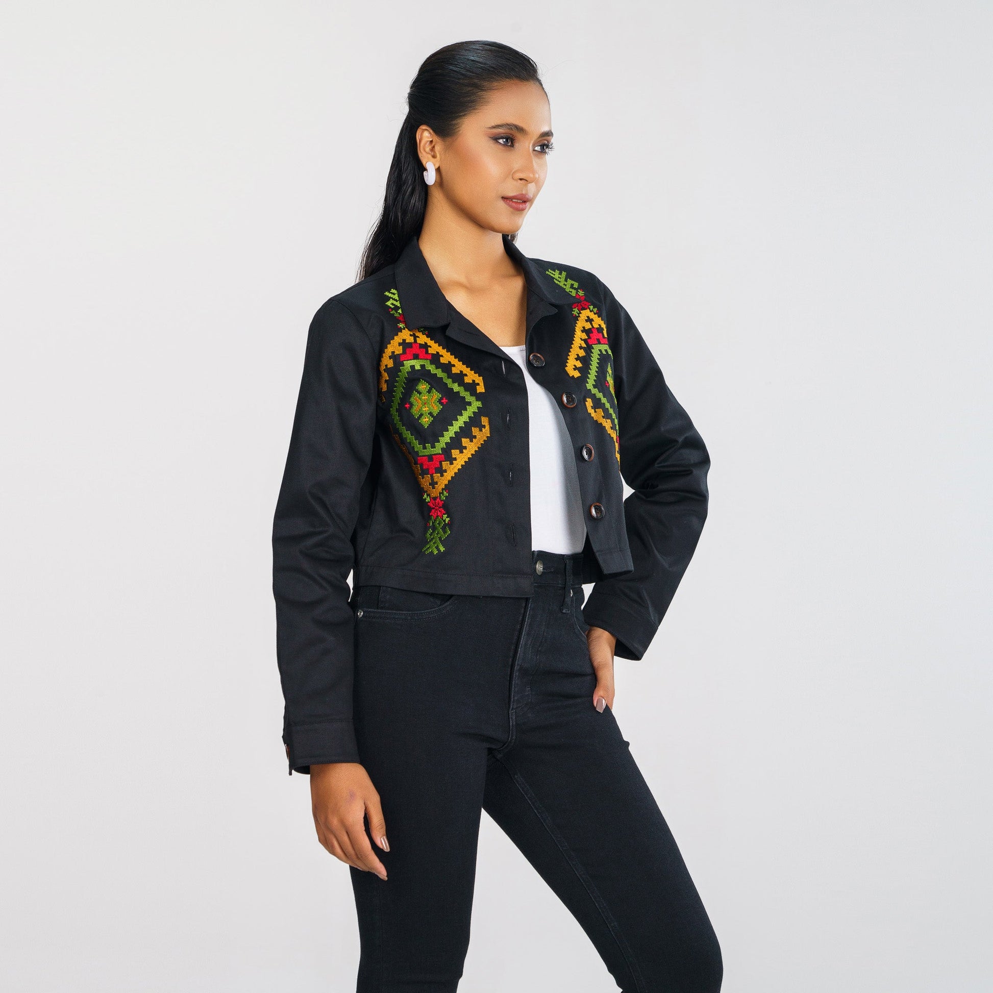 This solid black twill jacket is designed for effortless elegance. It features a one-piece collar, front button closure, and intricate embroidery detailing for a stylish accent. The straight hemline adds a polished finish, while the lightweight, unlined 100% polyester fabric ensures comfort and easy layering.