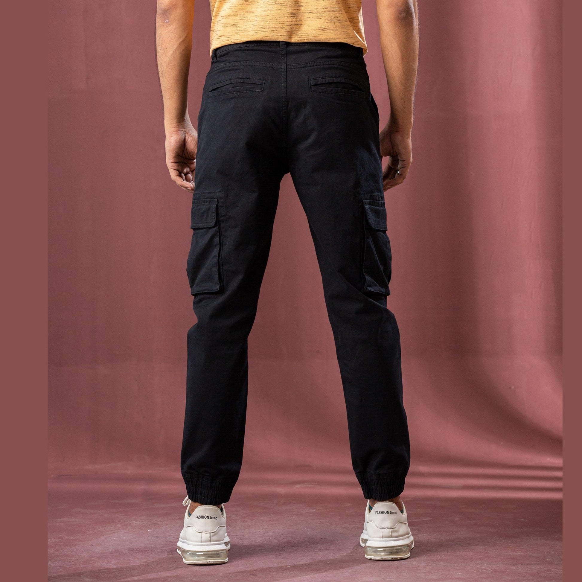 These men's black cargo pants are designed with a lightweight and soft hand feel, featuring multiple pockets and an elastic hem for added comfort. Made from a cotton-spandex blend, they offer a relaxed fit, making them both practical and stylish for everyday wear.
