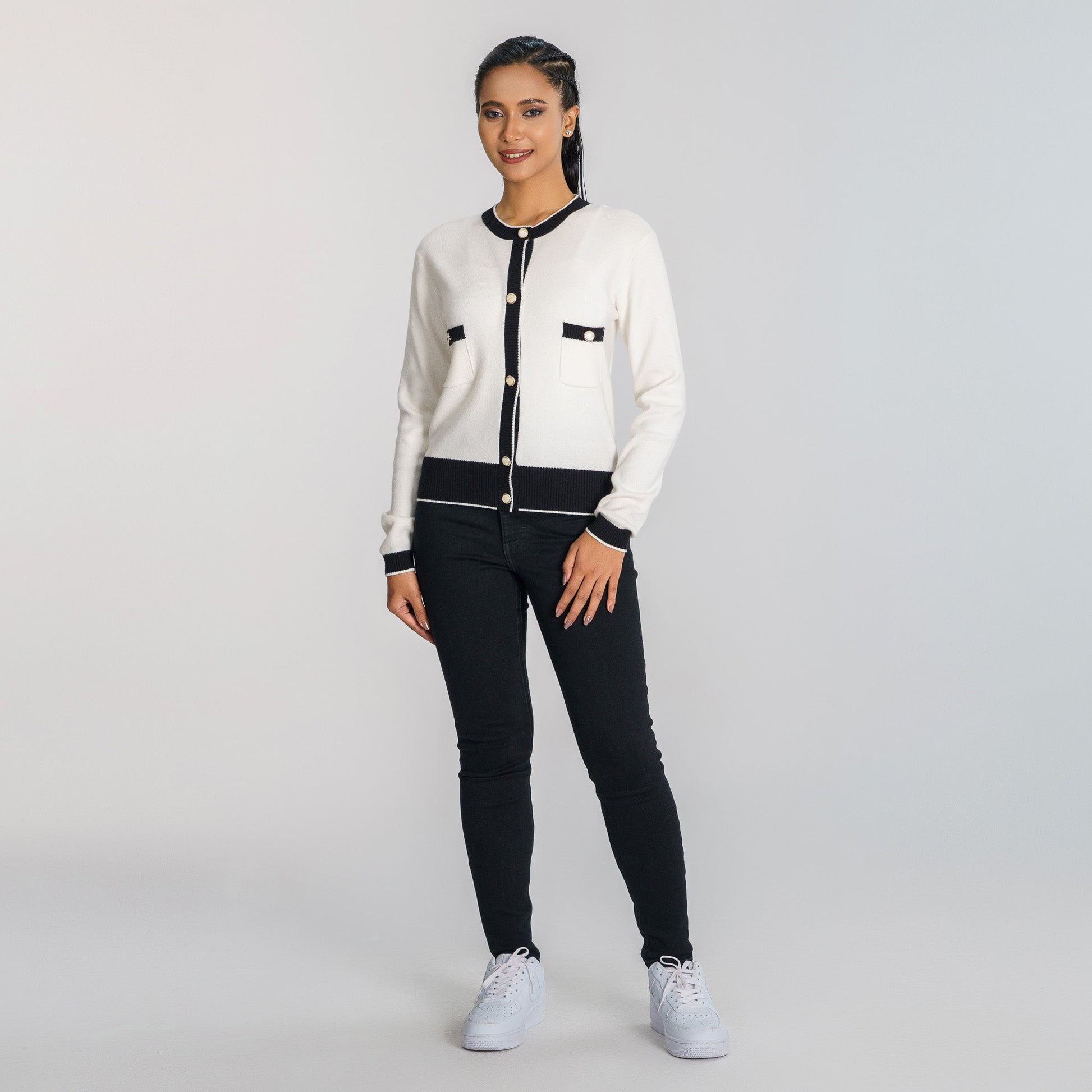 This women's black and white cardigan combines timeless style and comfort. Crafted from a soft viscose-nylon blend, it features classic decorative buttons and convenient pockets. Perfect for layering, it adds a touch of elegance to any outfit.
