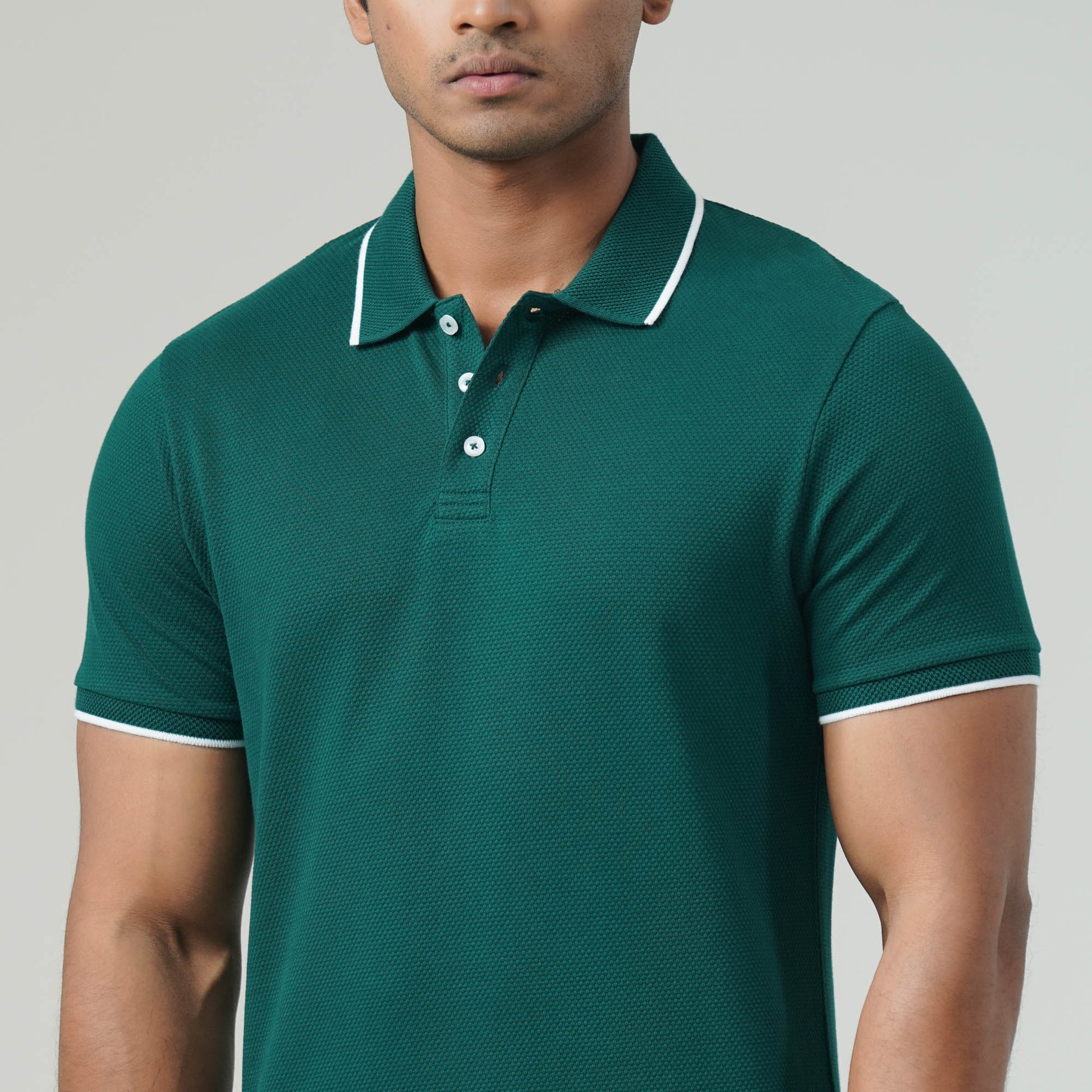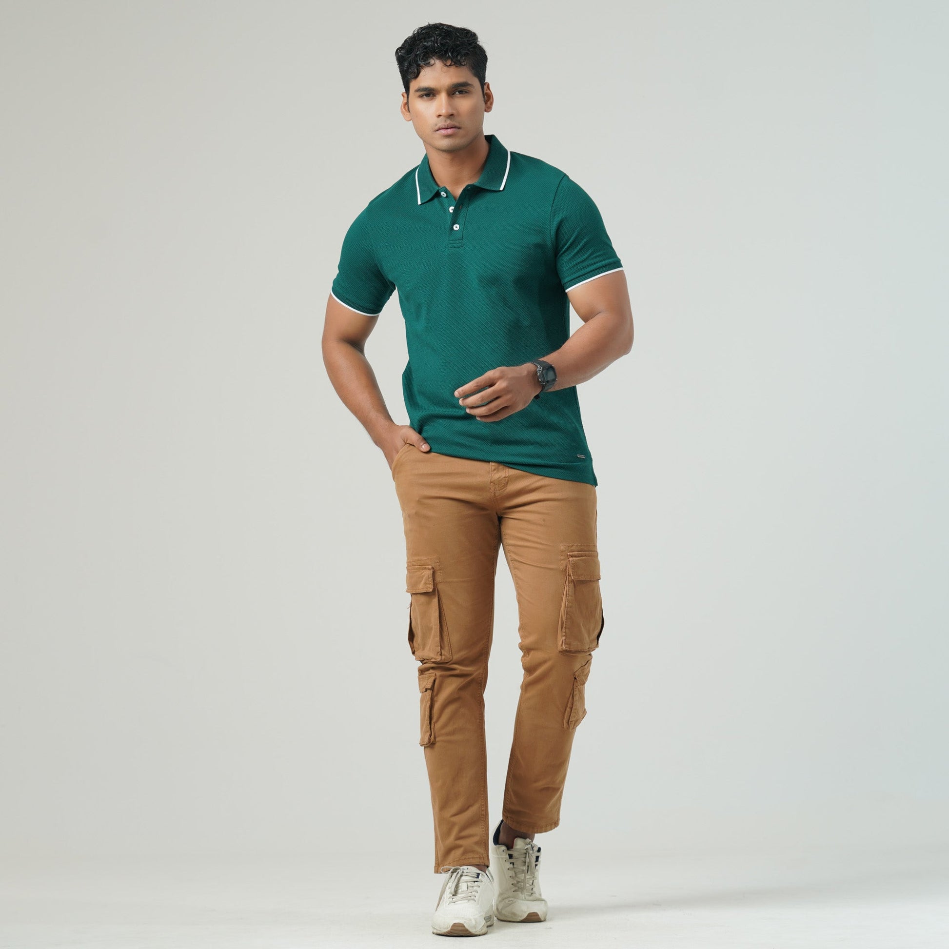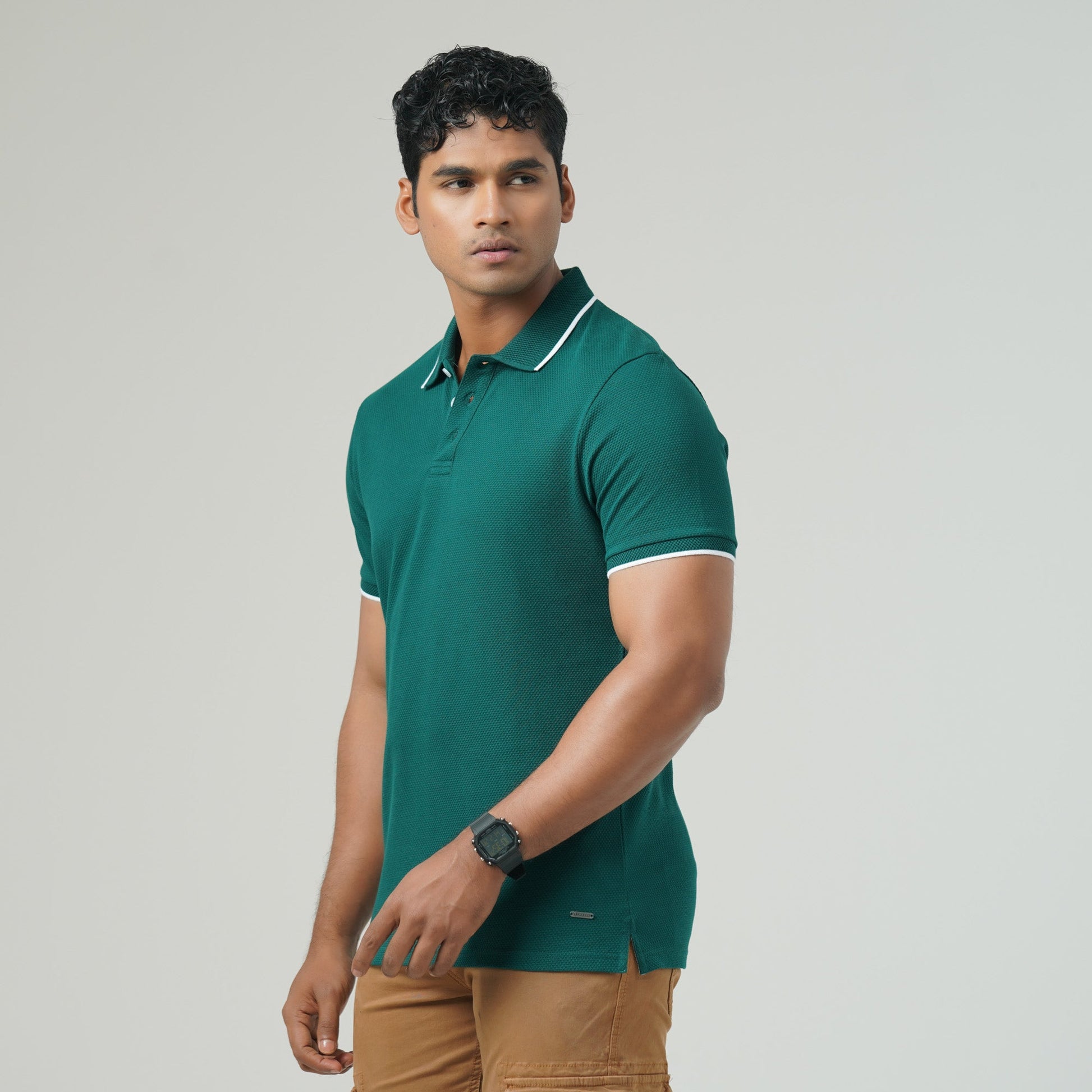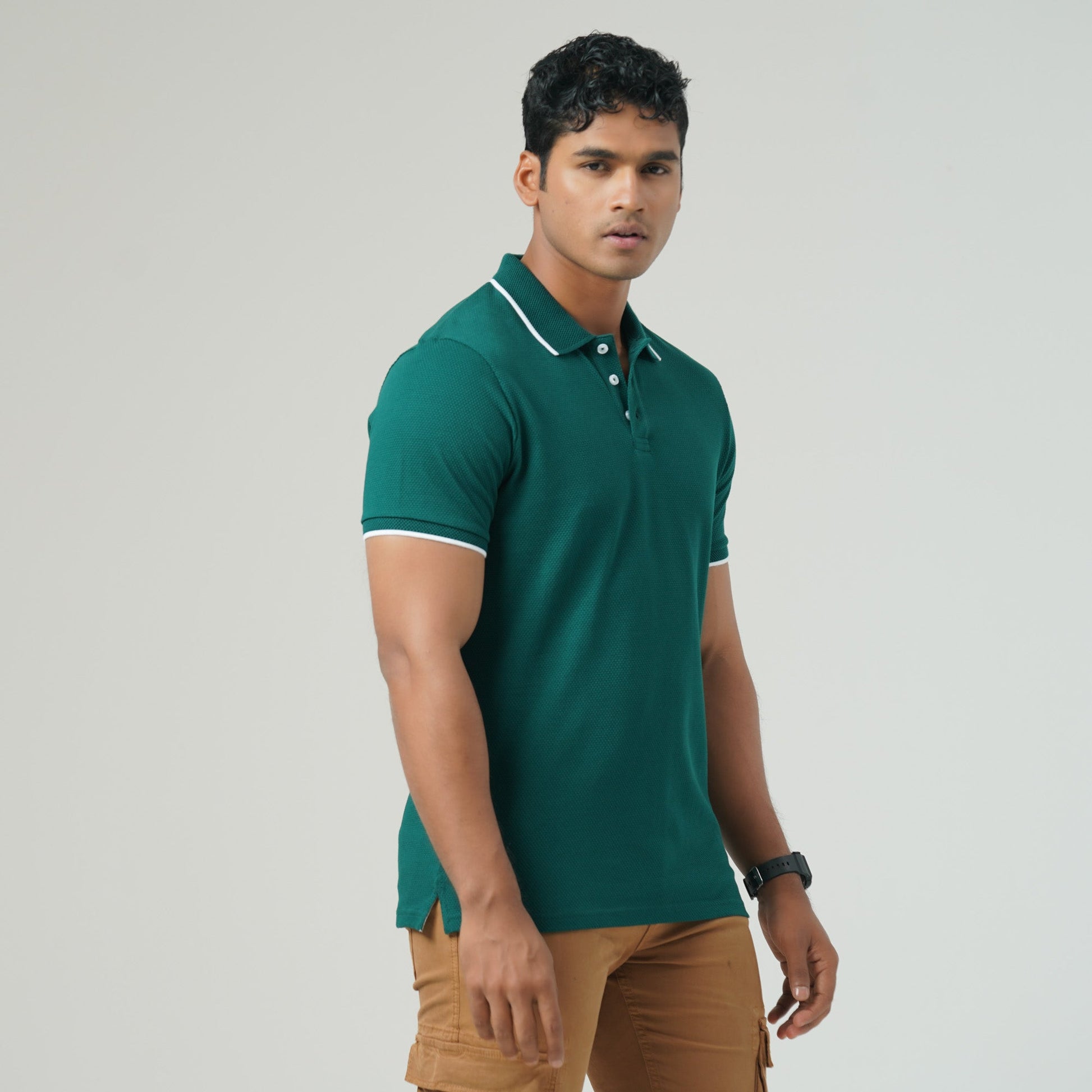 This men’s slim-fit polo shirt is crafted from premium cotton bubble knit fabric for a sophisticated look and breathable comfort. Designed with a jacquard collar and a sleek metal badge at the bottom, it adds a refined touch to your casual wardrobe. With a durable 220 GSM fabric weight, this polo is perfect for both casual and semi-formal occasions.