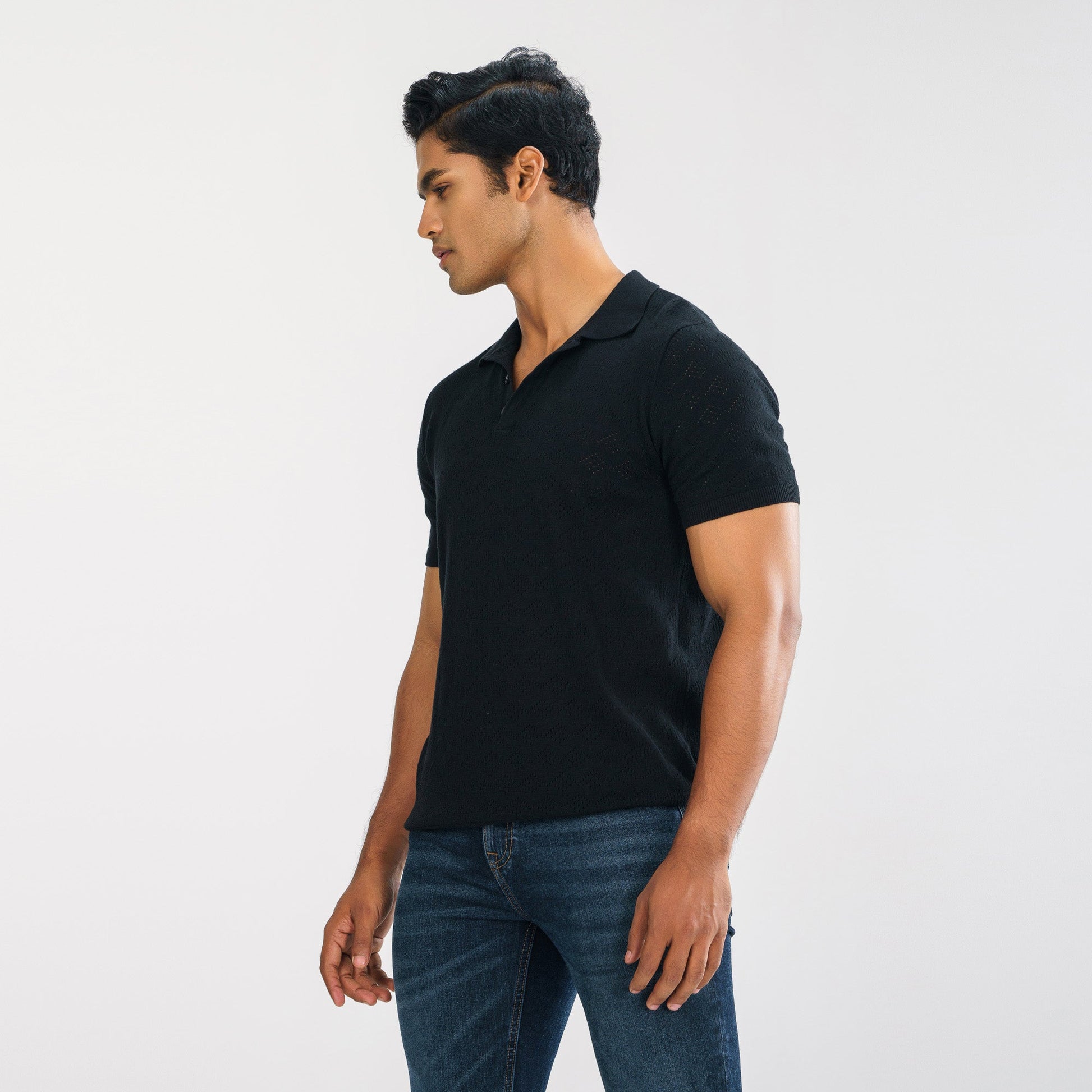 This black sweater polo shirt features a refined textured design, crafted from high-quality 100% cotton yarn for maximum comfort. With a regular fit, it offers a stylish and versatile look, perfect for layering during cooler days. A wardrobe essential for any modern man.