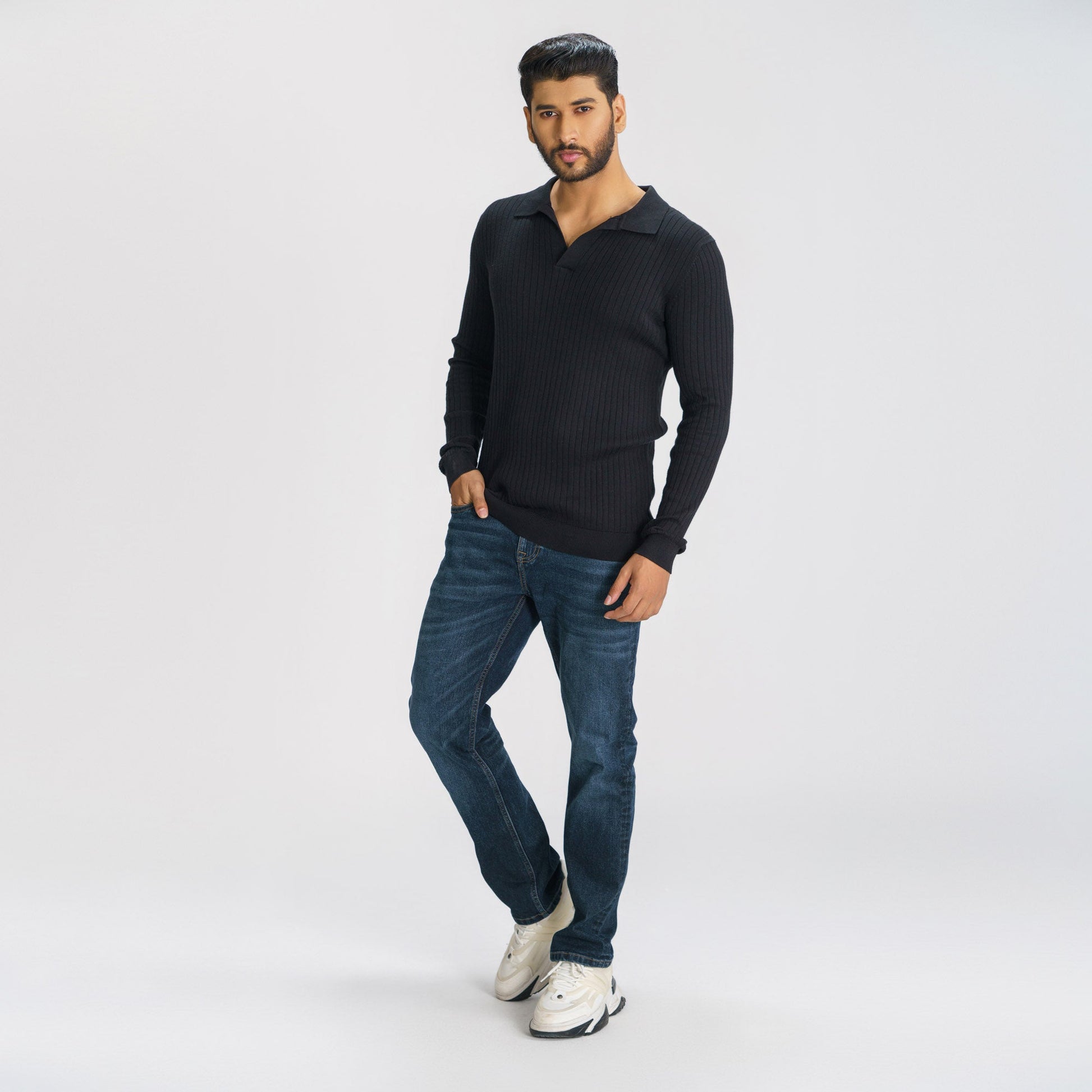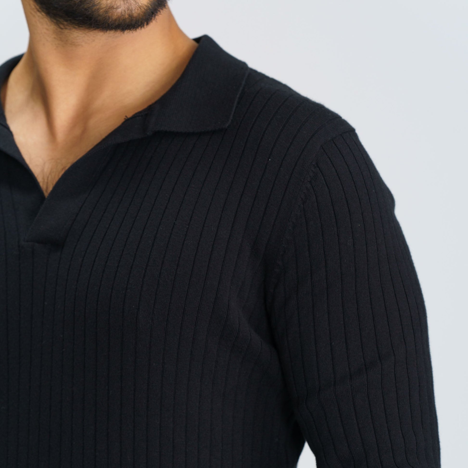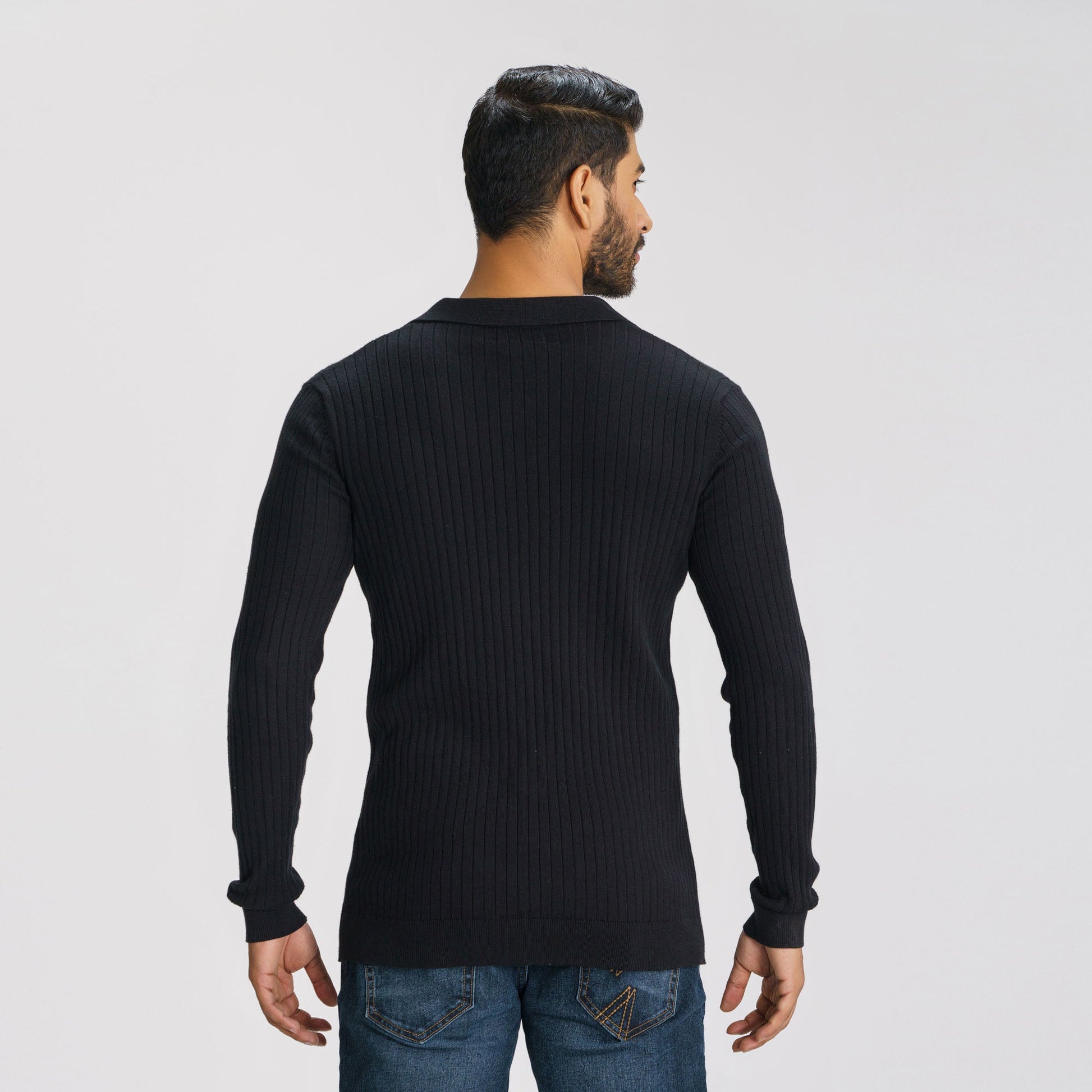 This men’s black textured polo sweater combines classic style with cozy comfort. Crafted from a high-quality cotton-nylon blend, it offers a soft feel and a durable finish. Designed with no front fastening for a clean look, this regular-fit sweater is perfect for both casual and semi-formal occasions.