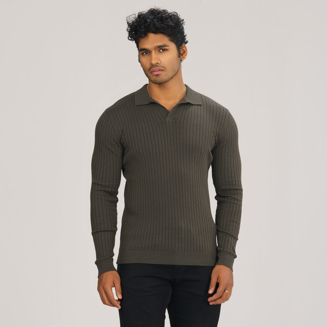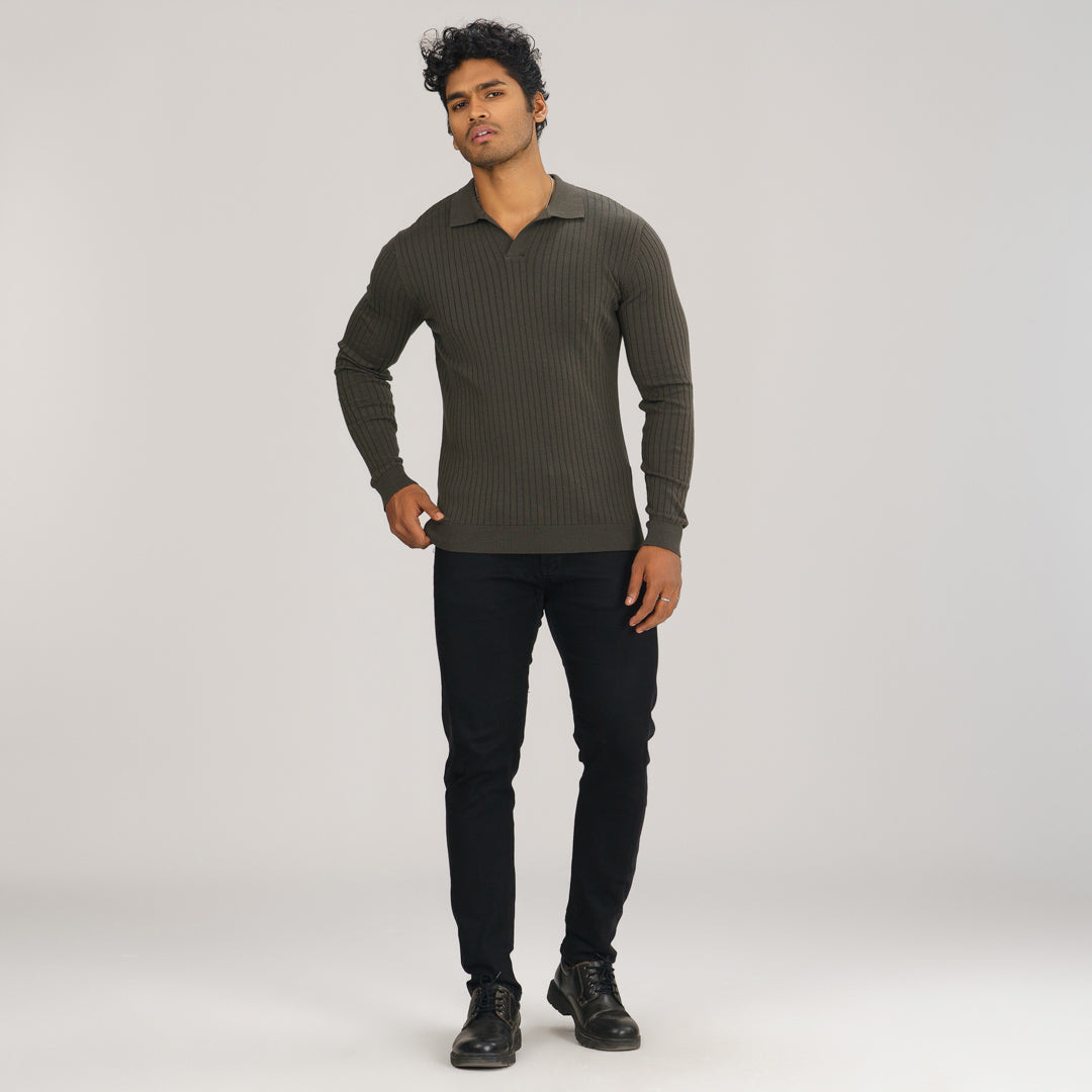 This men’s grey textured polo sweater combines classic style with cozy comfort. Crafted from a high-quality cotton-nylon blend, it offers a soft feel and a durable finish. Designed with no front fastening for a clean look, this regular-fit sweater is perfect for both casual and semi-formal occasions.