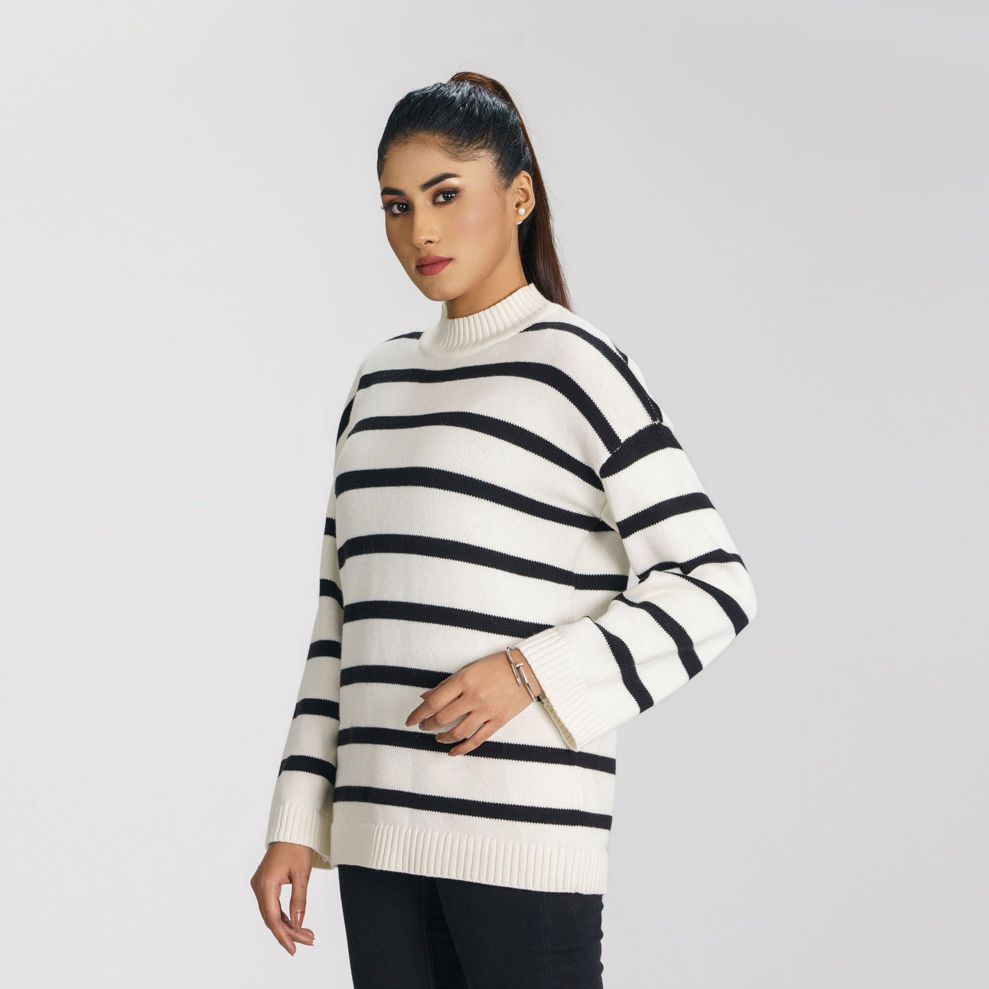 This black and white pullover combines a soft handfeel with stylish stripes, offering a modern yet comfortable look. Made from a cotton-acrylic blend, it provides warmth and breathability, perfect for layering during cooler days. A versatile piece to complement any casual outfit.
