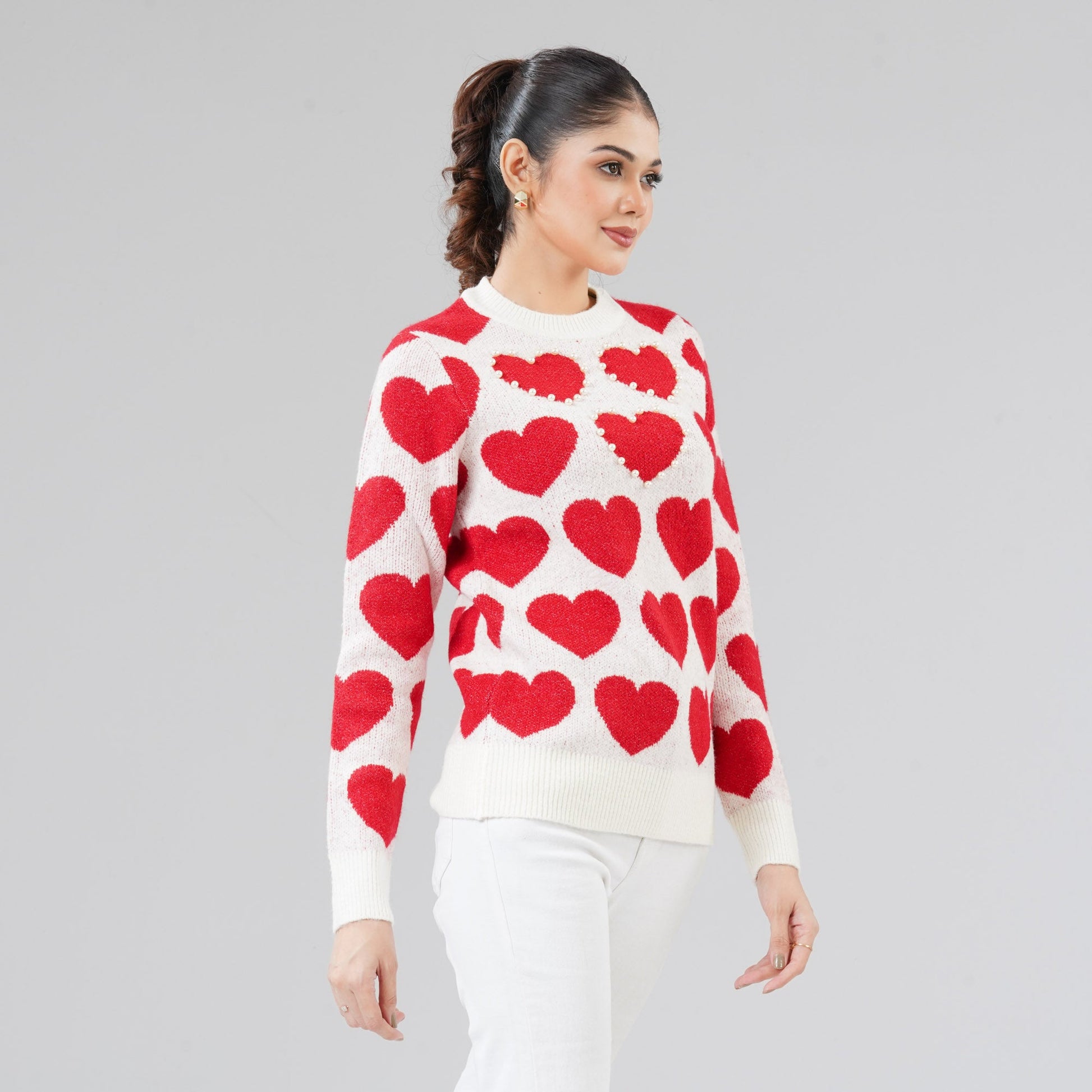 Brighten her winter look with this women's white pullover, featuring red love prints all over and delicate pearl work on the chest. Crafted from soft mossy fabric for warmth and comfort, it offers a regular fit that’s perfect for everyday wear. Stylish and cozy for the season.