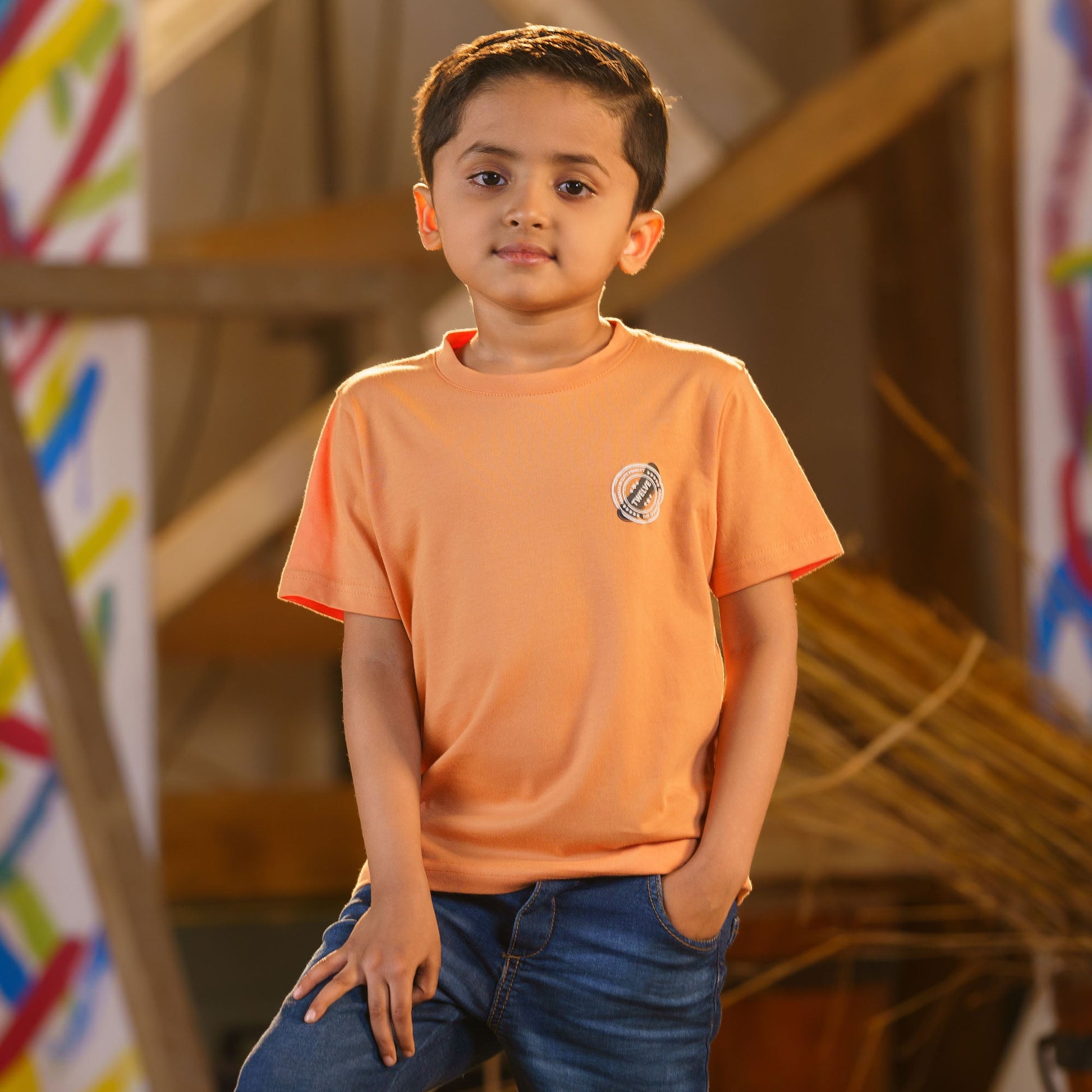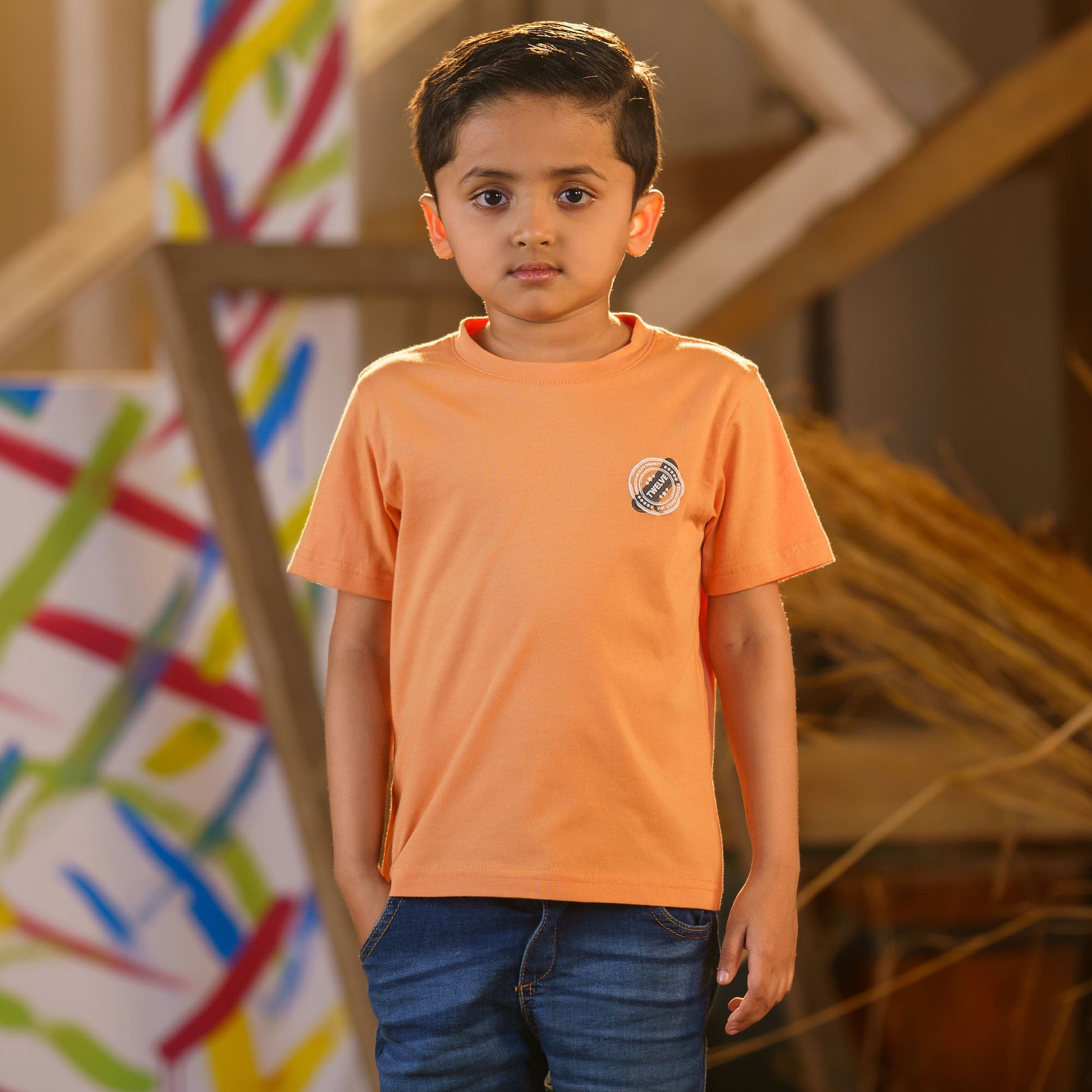 This baby boys' orange t-shirt features a stylish back print with a small chest print for added charm. Made from 100% cotton, it offers a comfortable regular fit that's perfect for everyday wear. The soft and breathable material ensures your little one stays comfortable all day long.