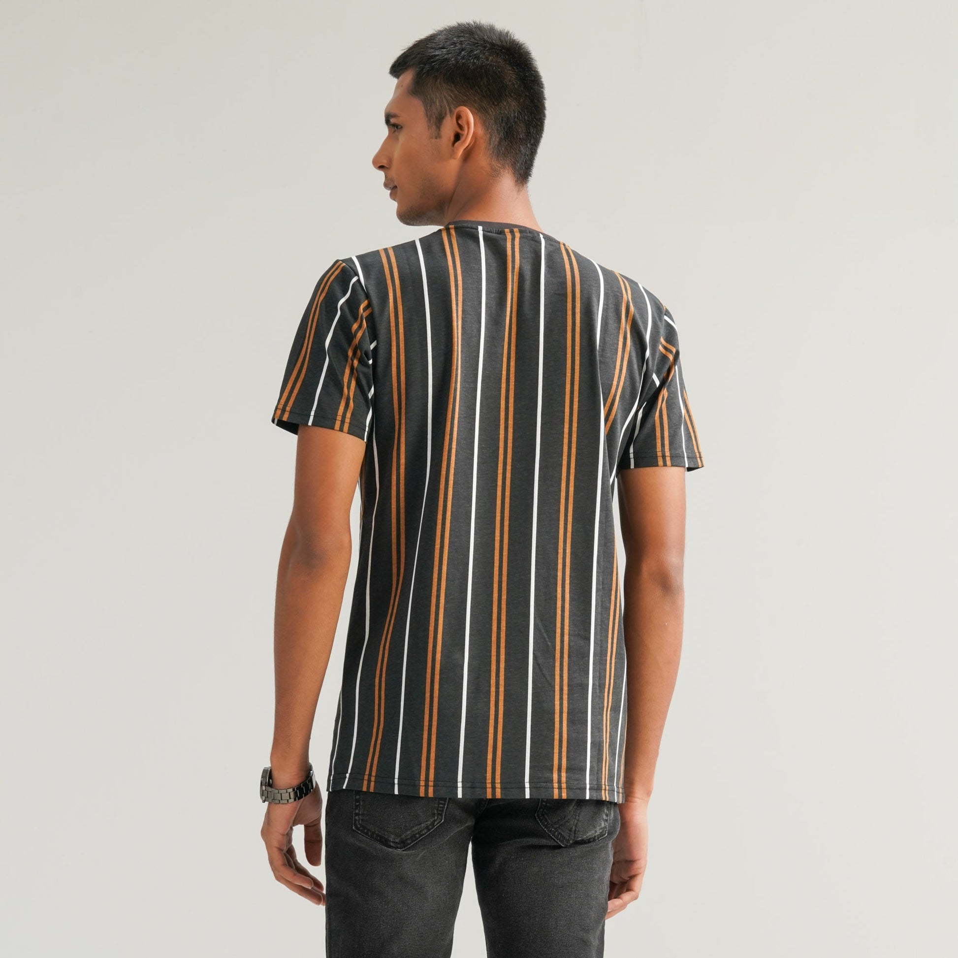 Slim-fit mens t-shirt in bleck, crafted from 100% cotton compact single jersey (160 GSM) for a soft and breathable feel. Designed with vertical stripe all-over print and typo embroidery at the chest, it blends comfort with a trendy, modern style. Perfect for casual everyday wear.