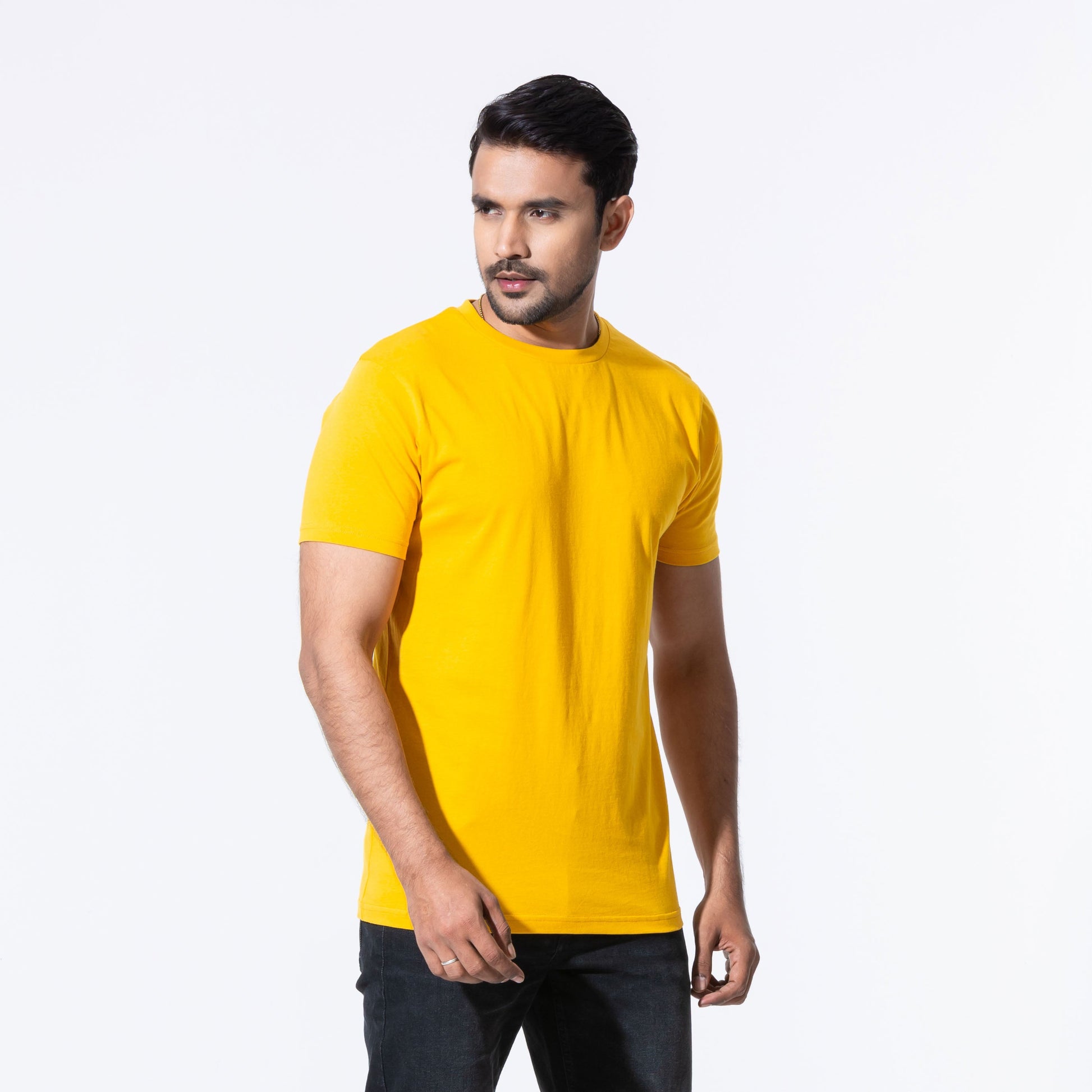 This slim-fit mens mustard t-shirt offers a classic look with a round neck and a minimal design. Made from 100% combed cotton, it provides a soft hand feel and exceptional comfort for all-day wear. The flag label at the side seam adds a subtle touch of detail, making it a perfect staple for any casual wardrobe.