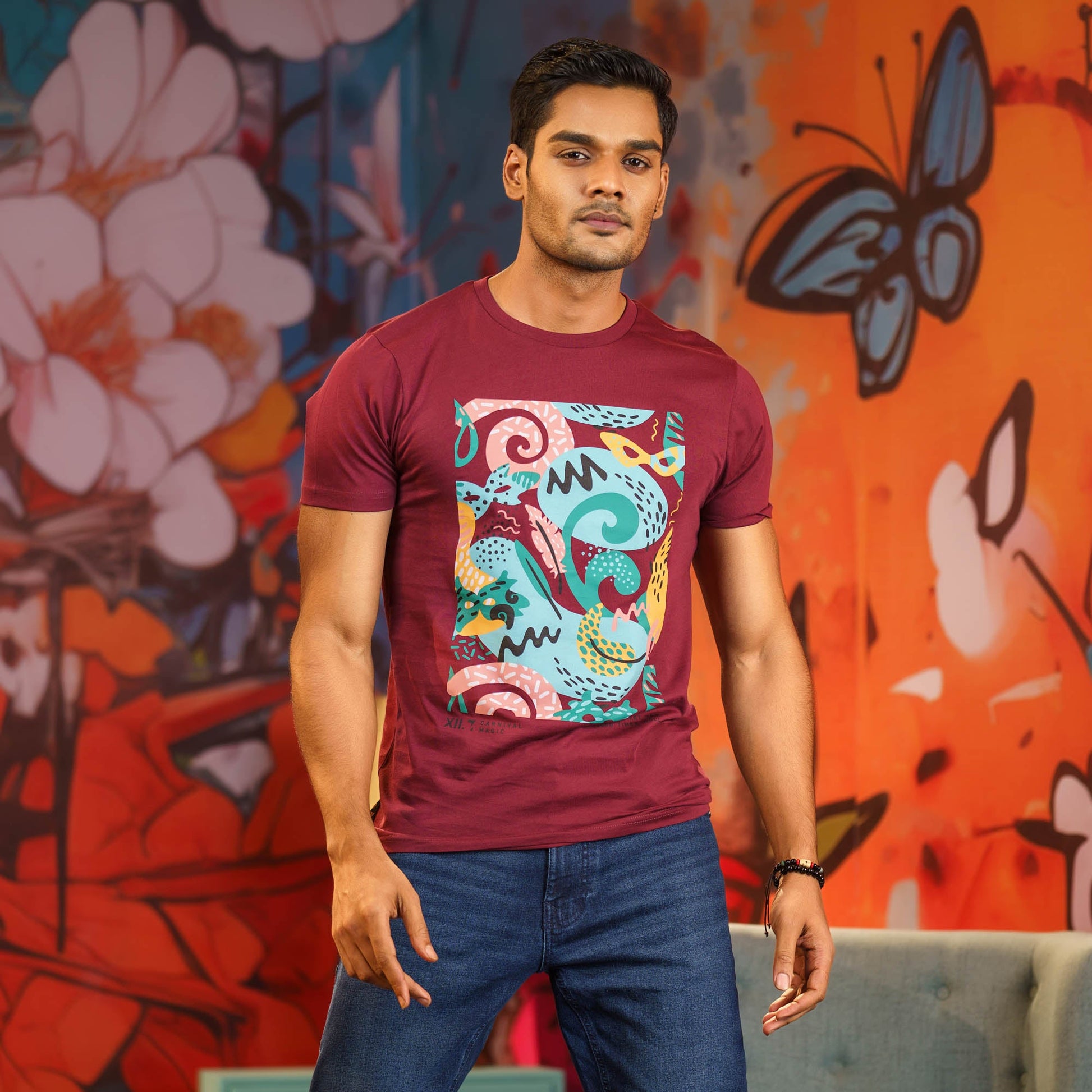 This maroon t-shirt features a colorful graphic at the front, offering a bold look with a comfortable fit. Made from 100% cotton and tailored in a slim fit, it’s perfect for adding a vibrant touch to your casual wardrobe.