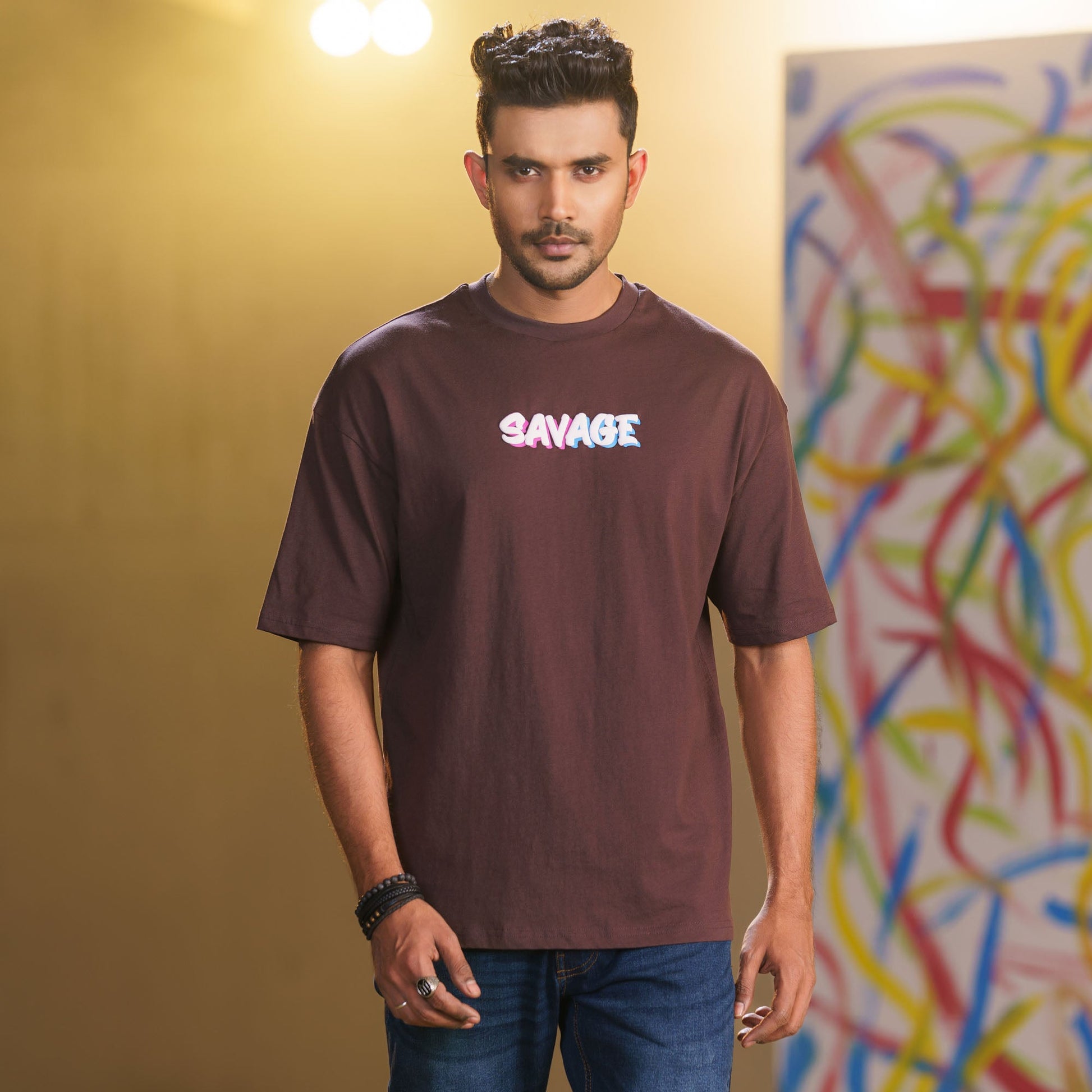 This oversized drop shoulder T-shirt features bold graphics on both the back and chest, creating a standout and fashionable look. Made from 100% cotton, it ensures a comfortable and breathable fit. The rich brown color adds a distinctive and stylish touch, making it a perfect choice for men who want a relaxed yet bold addition to their casual wardrobe.