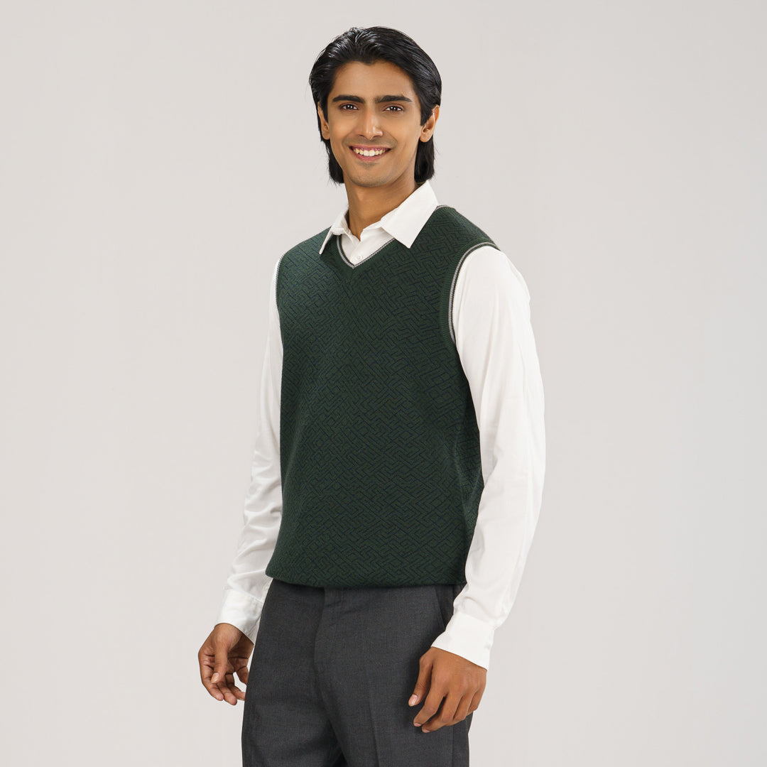 Stay cozy and stylish with this olive sweater vest for men. Designed with a classic V-neck and accented by contrast tipping at the armholes, neck, and waist, this vest brings a refined touch to your wardrobe. Made from a comfortable wool-acrylic blend, it offers warmth and durability while maintaining a lightweight feel. Perfect for layering over shirts or wearing on its own for a polished, versatile look.