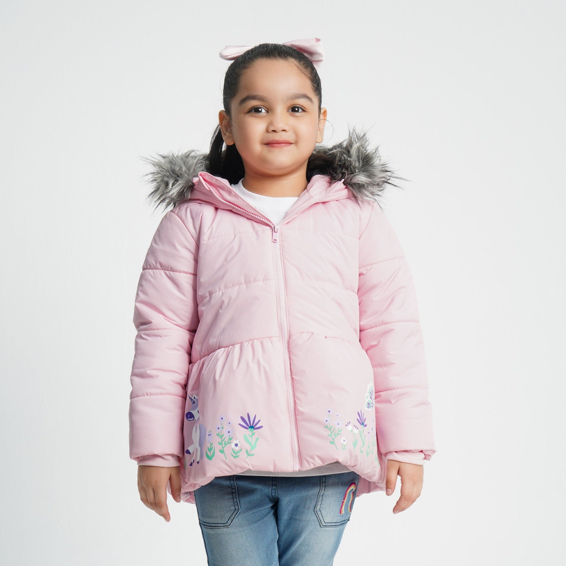 This baby girl's pink quilted jacket is designed with padded warmth and a cozy hoodie for extra comfort. It features a placement print at the hem, adding a cute and playful touch. The jacket has a zip closure and a straight hemline for a clean look. Finished with soft lining, perfect for chilly weather.