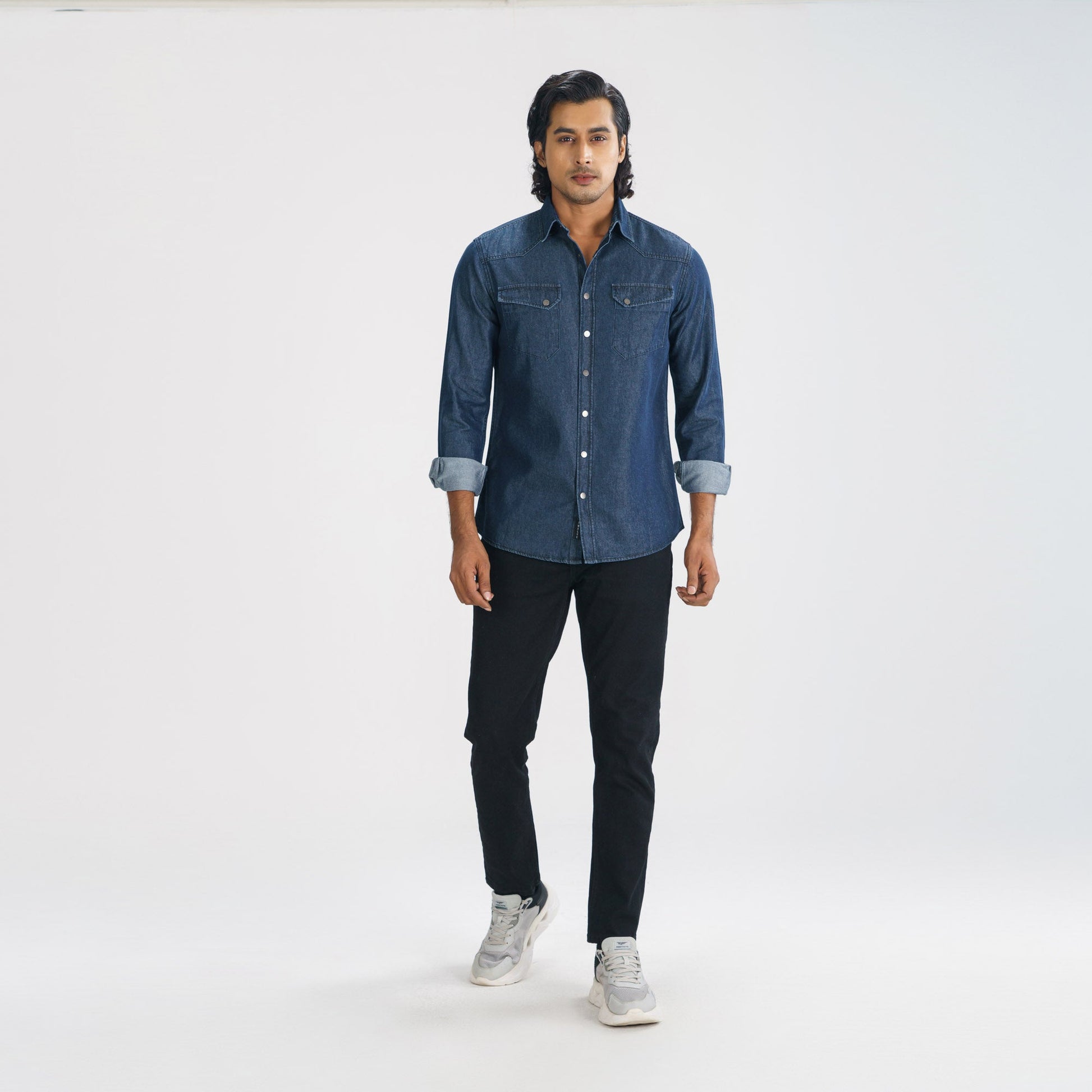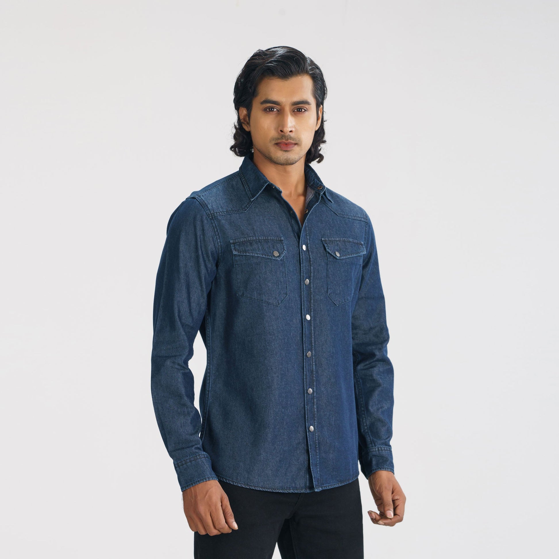 This men’s black denim shirt brings rugged style to any wardrobe. Made from cotton, it features a slim fit, front patch chest pocket, and sturdy metal snap buttons. Perfect for casual wear, this shirt offers both comfort and a timeless denim look.