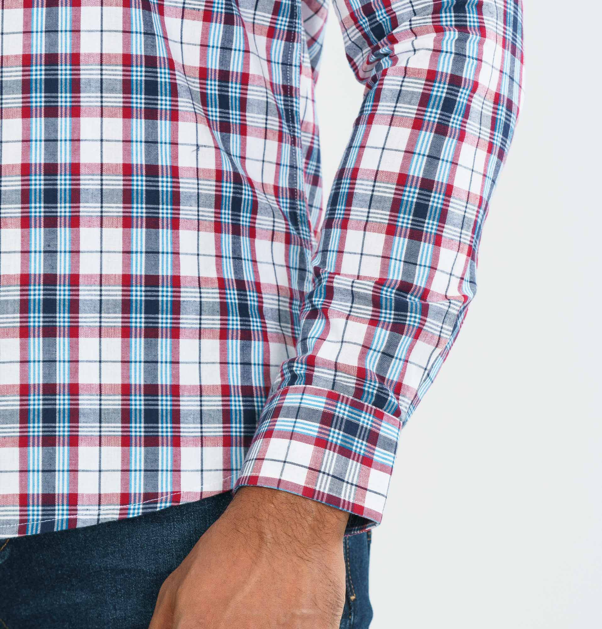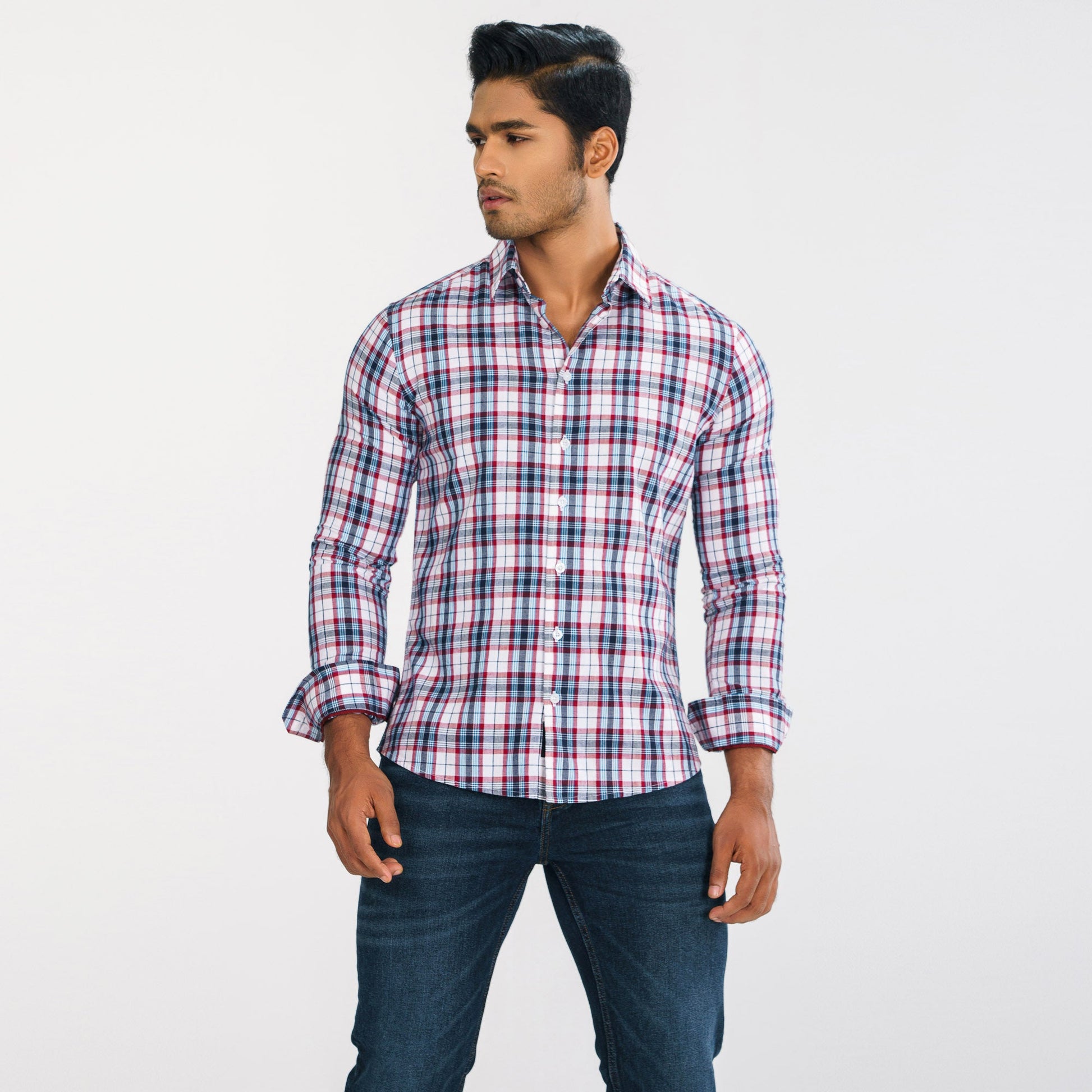 Upgrade your wardrobe with this stylish red check shirt for men, crafted from premium cotton for unmatched comfort. Perfect for light winter or everyday wear, it features a classic French placket and a refined placement twill tape detail for a modern touch. The slim-fit design offers a sleek and tailored appearance, making it ideal for both casual outings and semi-formal occasions. A versatile choice for year-round style.