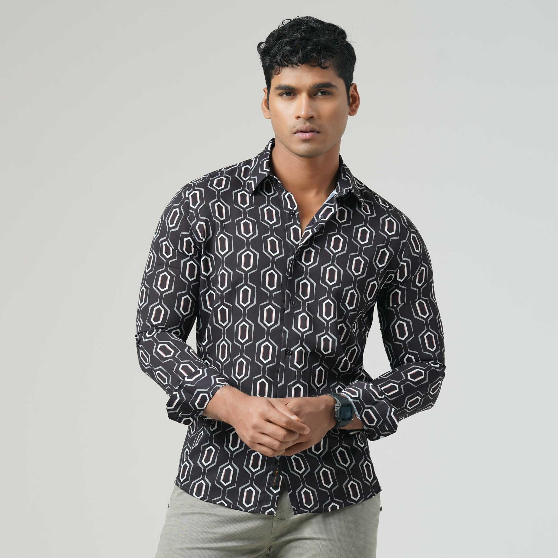 Stay stylish and comfortable with this black AOP long-sleeve shirt. Designed with a sleek French placket, a regular collar, and DTM body plastic buttons, it offers a polished yet effortless look. Made from 100% polyester, the lightweight fabric ensures breathability, making it perfect for regular summer wear.