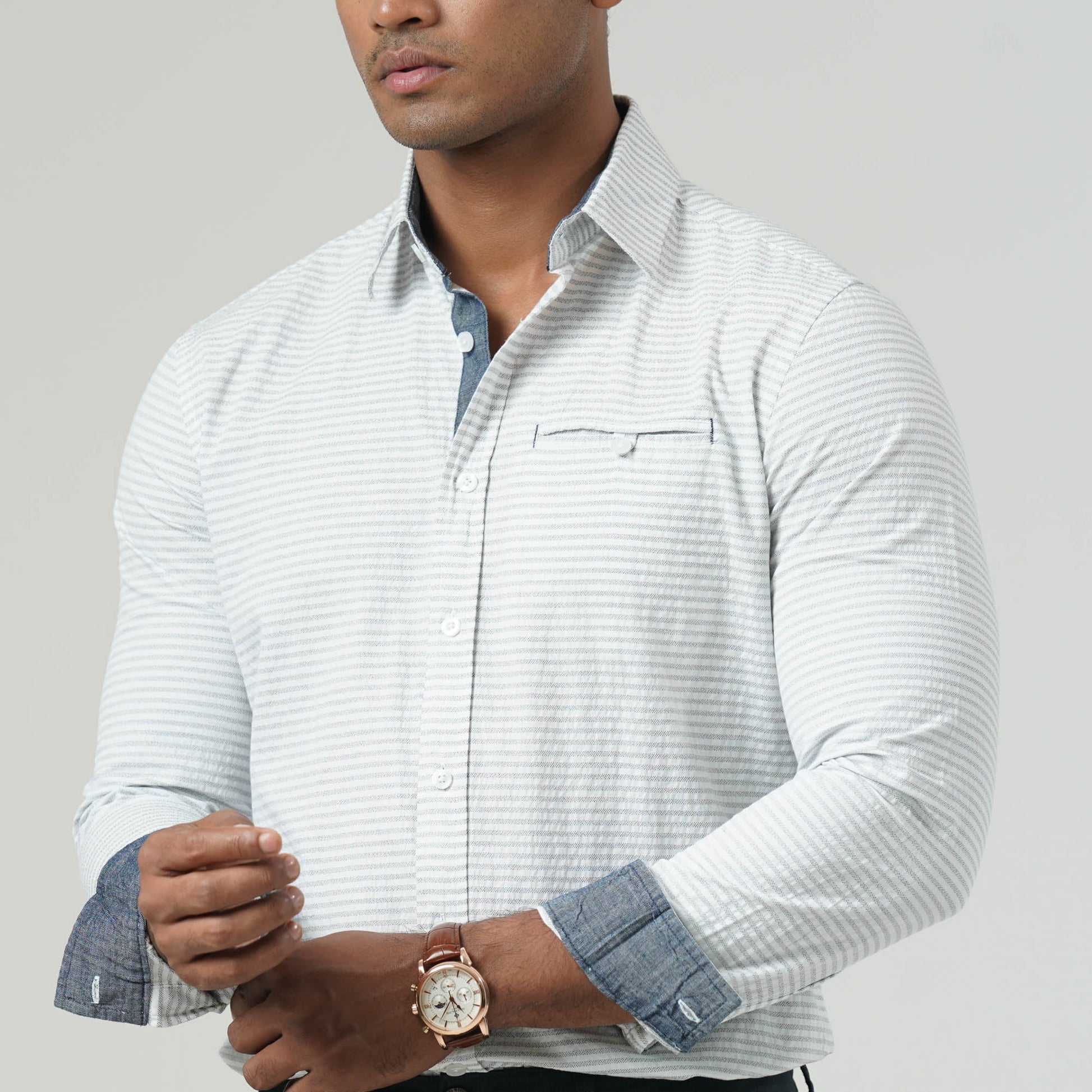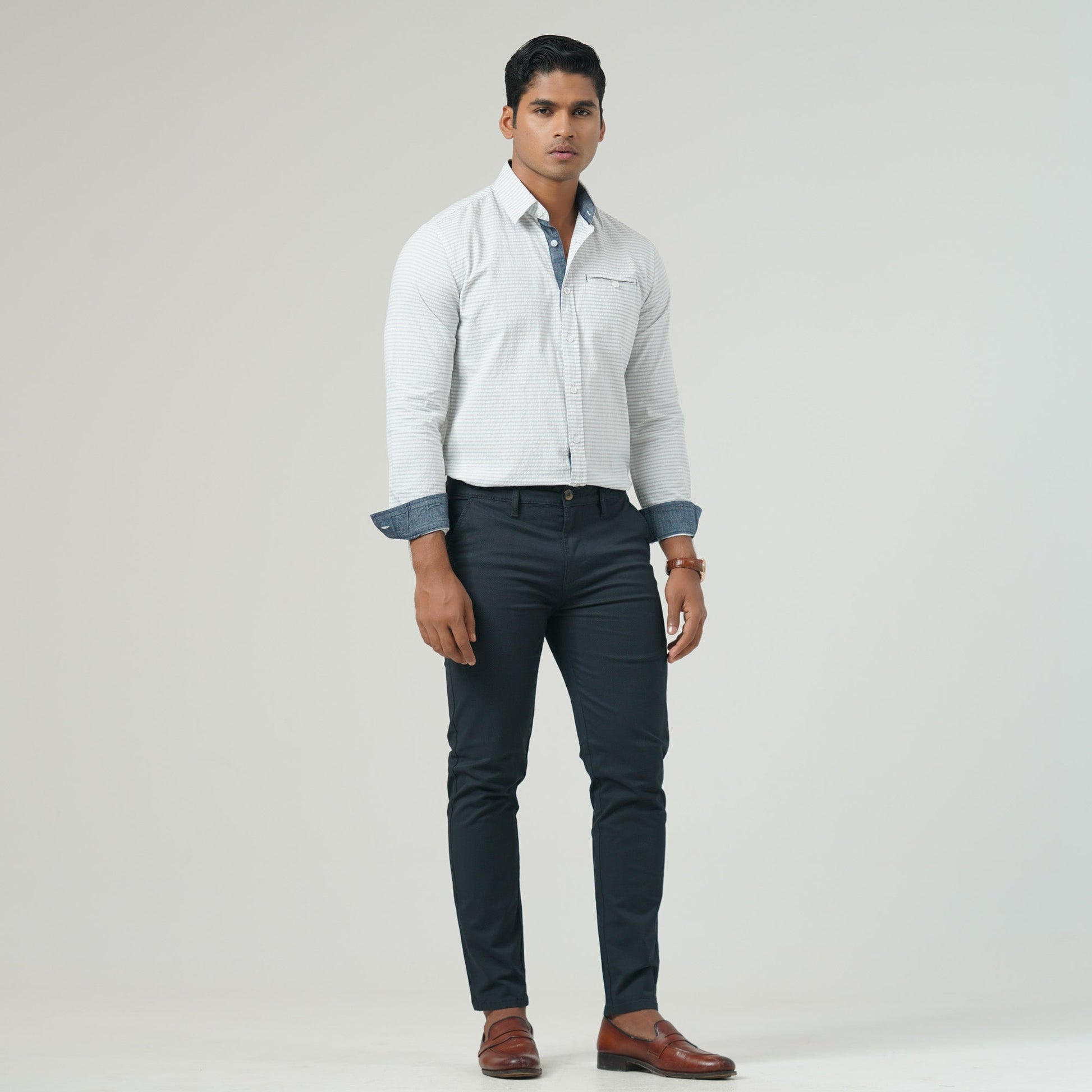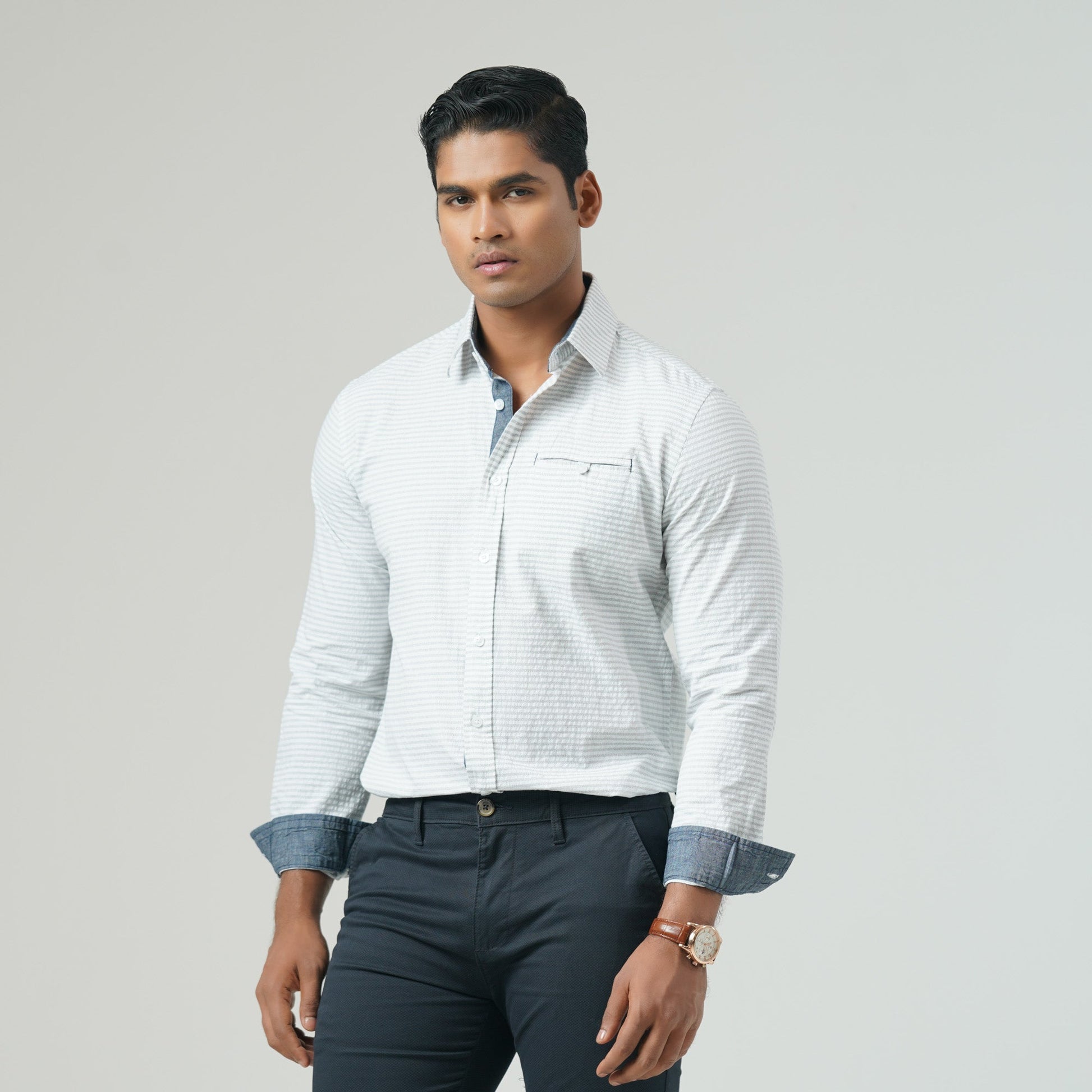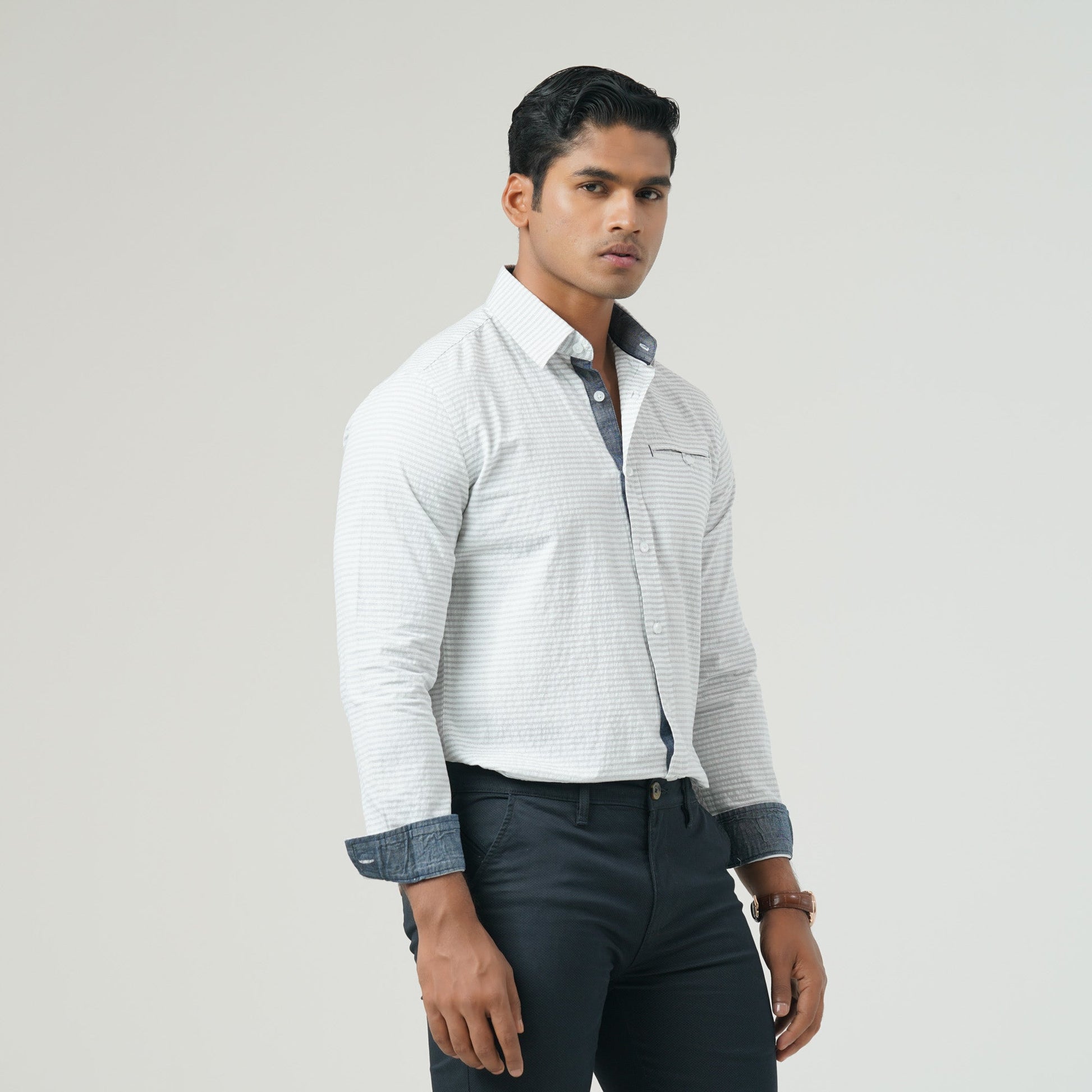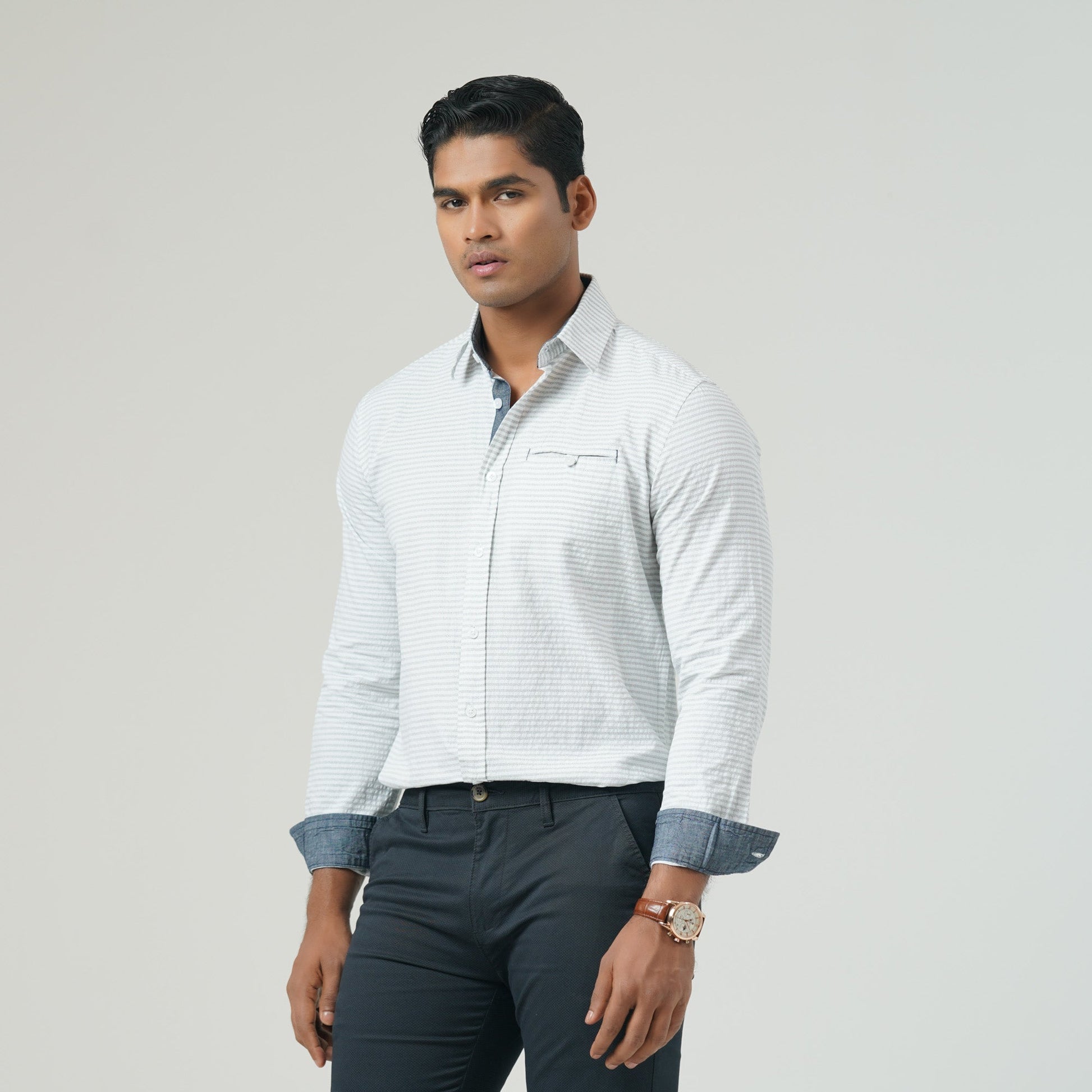 This slim-fit long-sleeve shirt features a timeless white and black stripe pattern, enhanced with a contrast button and a classic box placket. Designed for both style and functionality, it includes a chest pocket and is crafted from cotton for superior comfort. Perfect for both formal and casual wear.