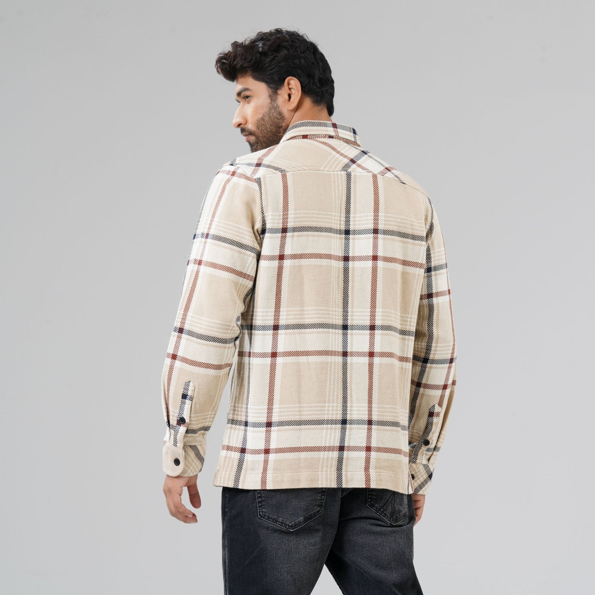 This men’s golden check shacket brings a stylish twist to casual layering. Designed with a classic check pattern, it features a front chest pocket with a flap for added detail. Made from a soft blended fabric, it offers warmth and comfort, making it perfect for versatile everyday wear.