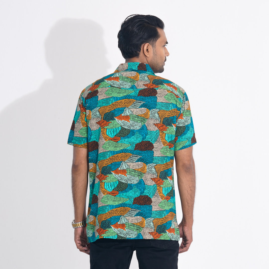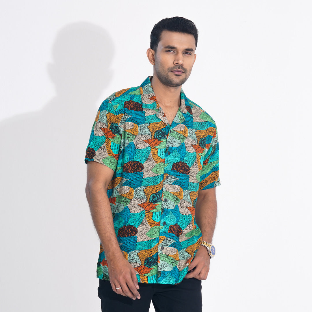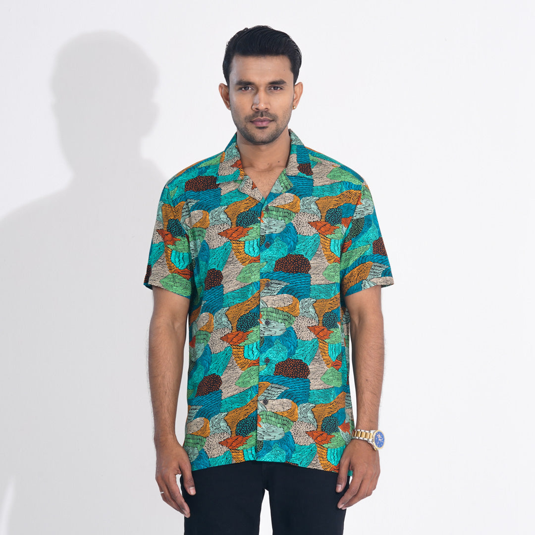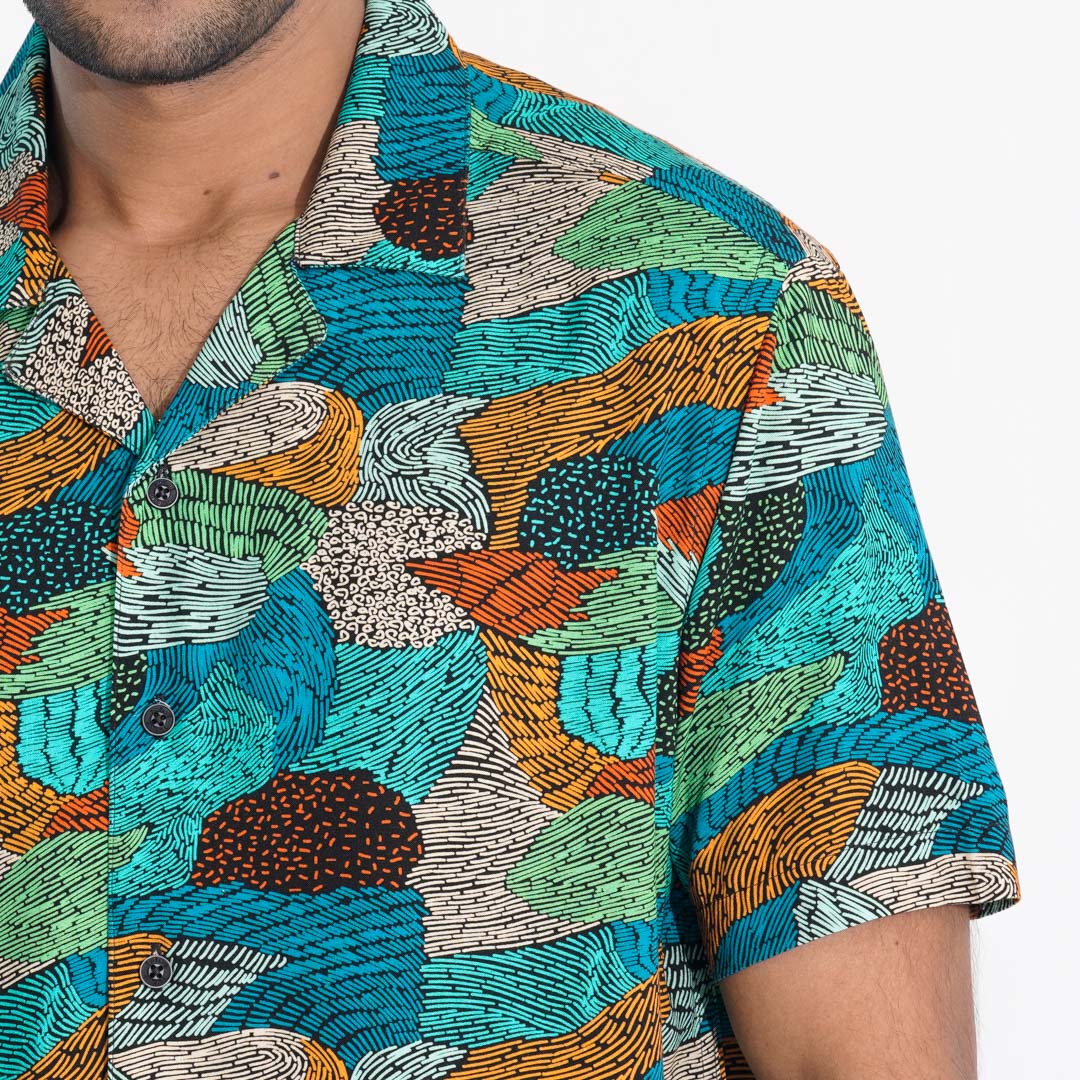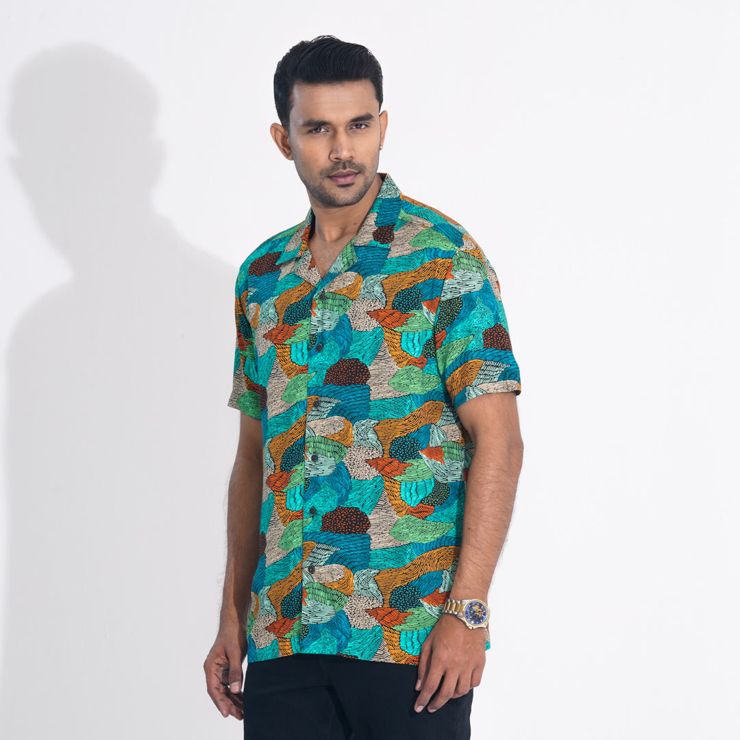 Stay effortlessly stylish with this green all-over printed lapel shirt. Crafted from breathable viscose slub fabric, it features a lapel collar, side slits, and DTM body plastic buttons for a refined touch. Designed for both resort and regular summer wear, this shirt ensures comfort and elegance in every setting.