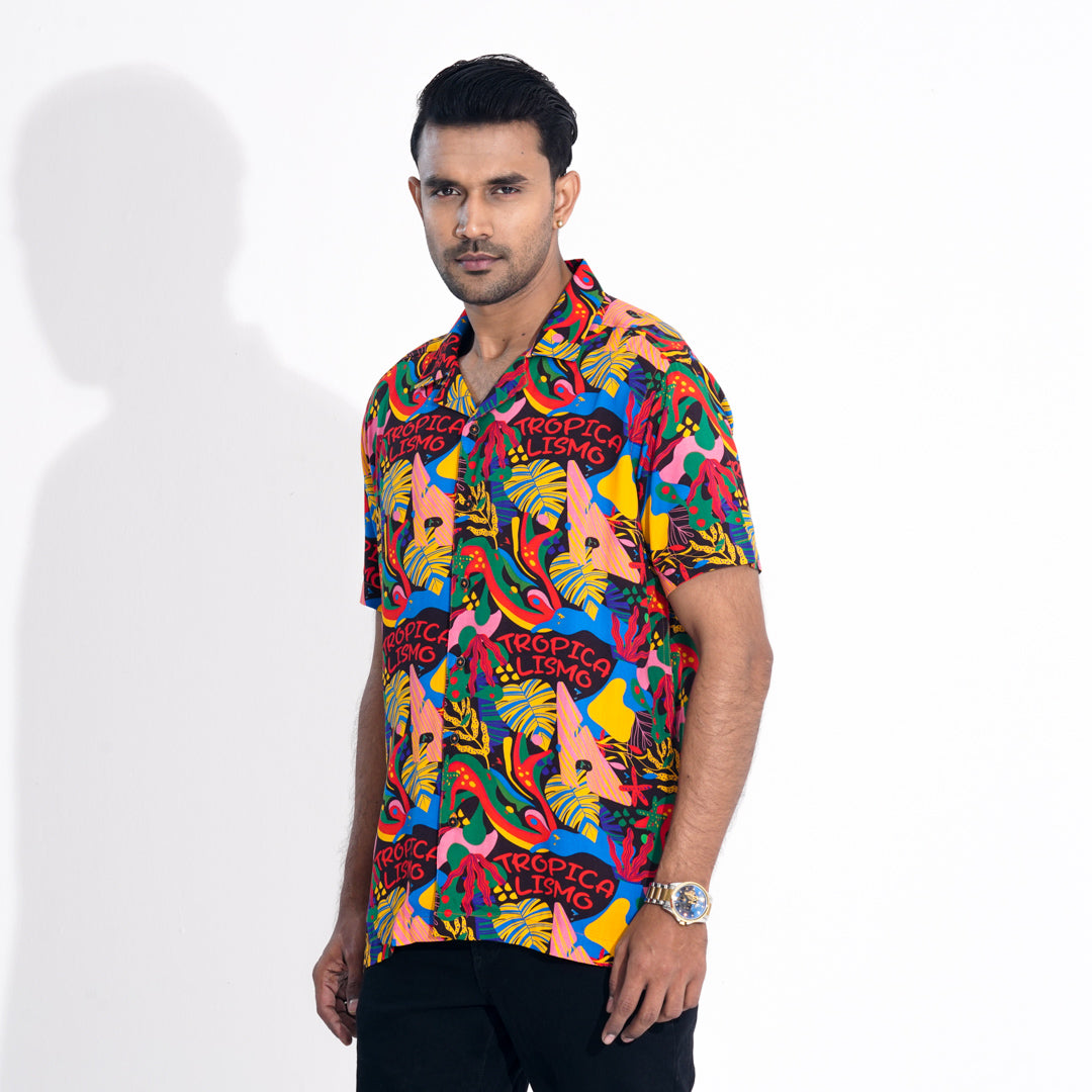 Stay effortlessly stylish with this multi color all-over printed lapel shirt. Crafted from breathable viscose slub fabric, it features a lapel collar, side slits, and DTM body plastic buttons for a refined touch. Designed for both resort and regular summer wear, this shirt ensures comfort and elegance in every setting.