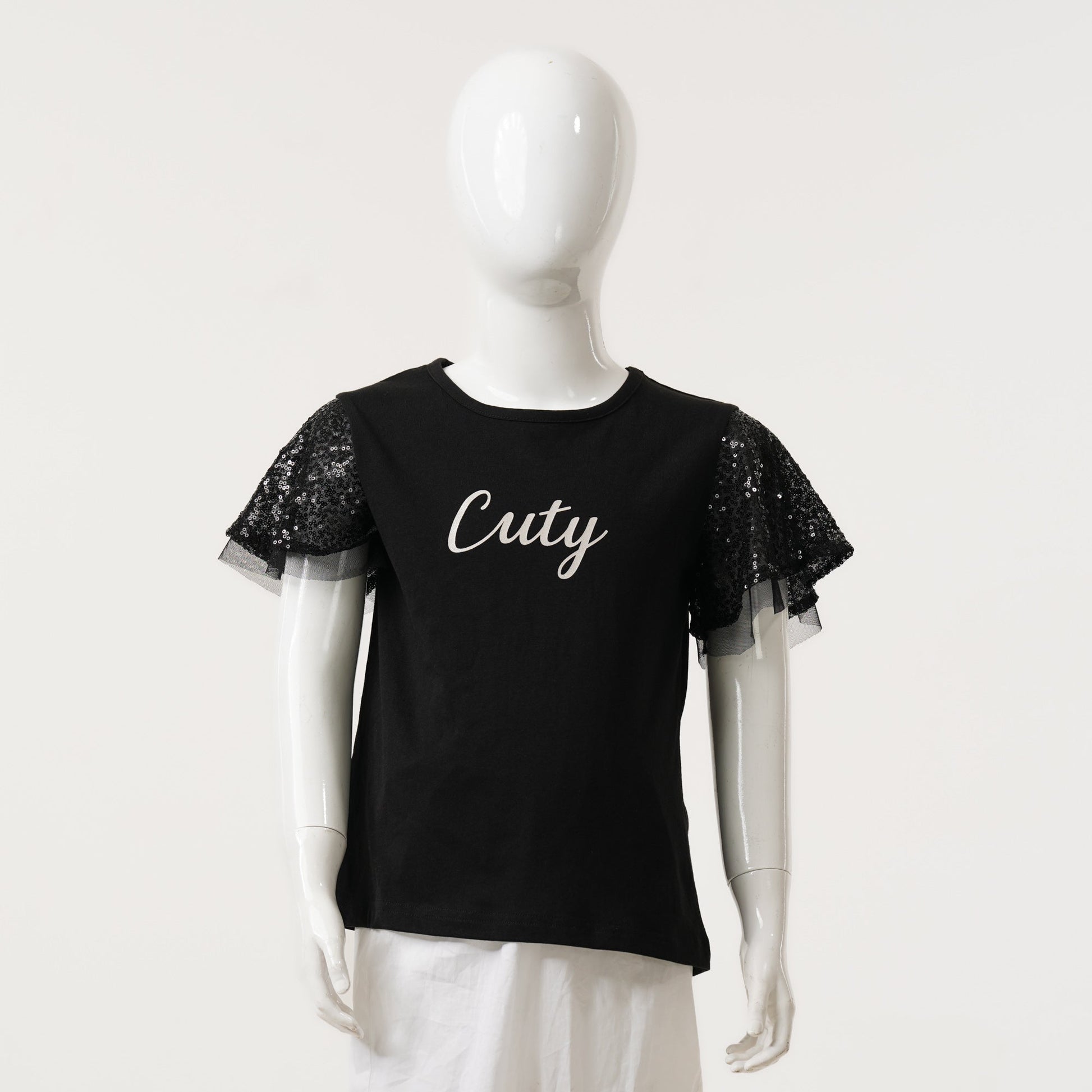 Trendy girls black top crafted from 100% cotton, 160 GSM for soft comfort and breathability. Designed in a boxy fit with sequin fabric flare sleeves and a glitter print at the chest for a stylish touch. Perfect for casual outings or special occasions.