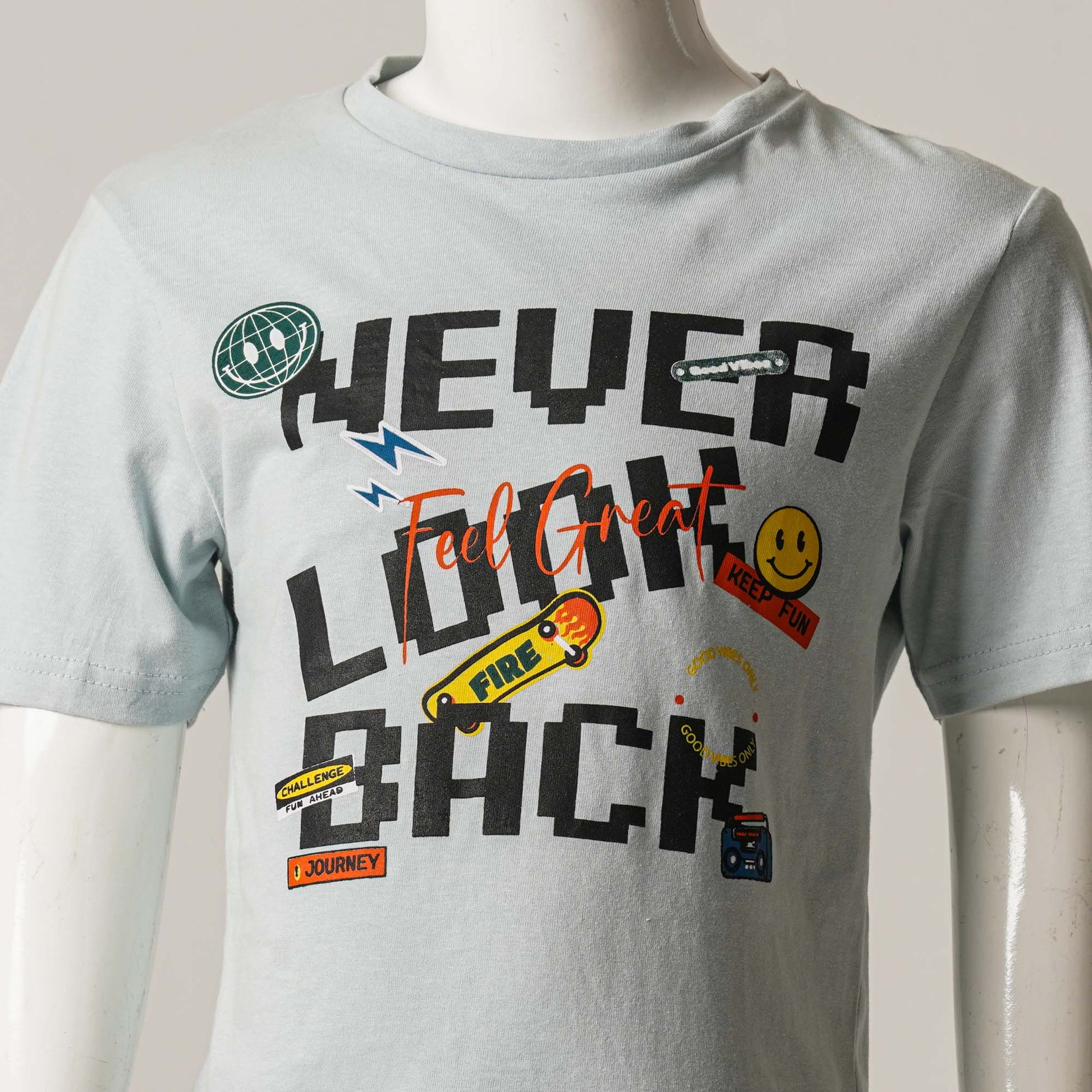 Boys sky blue t-shirt made from 100% cotton for a soft, breathable, and comfortable fit. Features a classic round neck and playful chest print, making it perfect for casual outings, school days, or everyday wear.