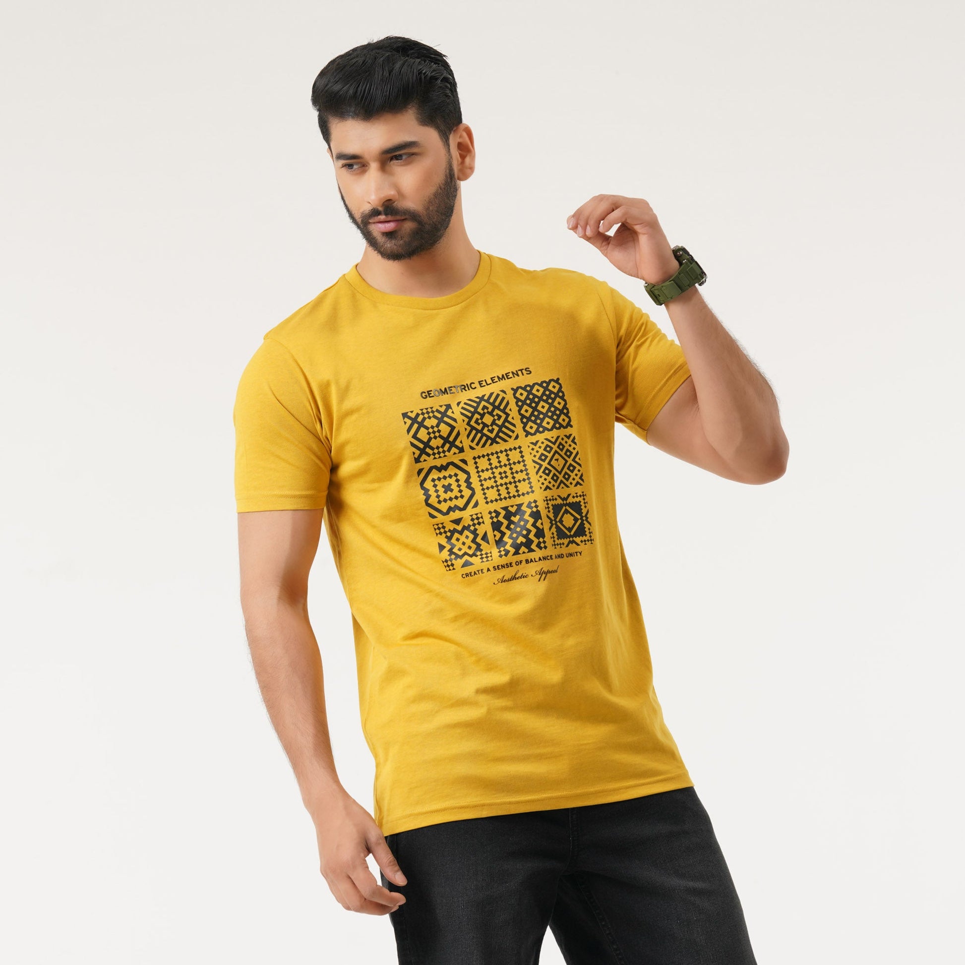Crafted from a high-quality blended, cotton & polyester mixed this slim-fit T-shirt offers both comfort and durability. The geometric graphic at the front adds a modern and stylish touch, making it perfect for casual outings. With a soft 180 GSM fabric, this T-shirt ensures breathability and ease of wear throughout the day.