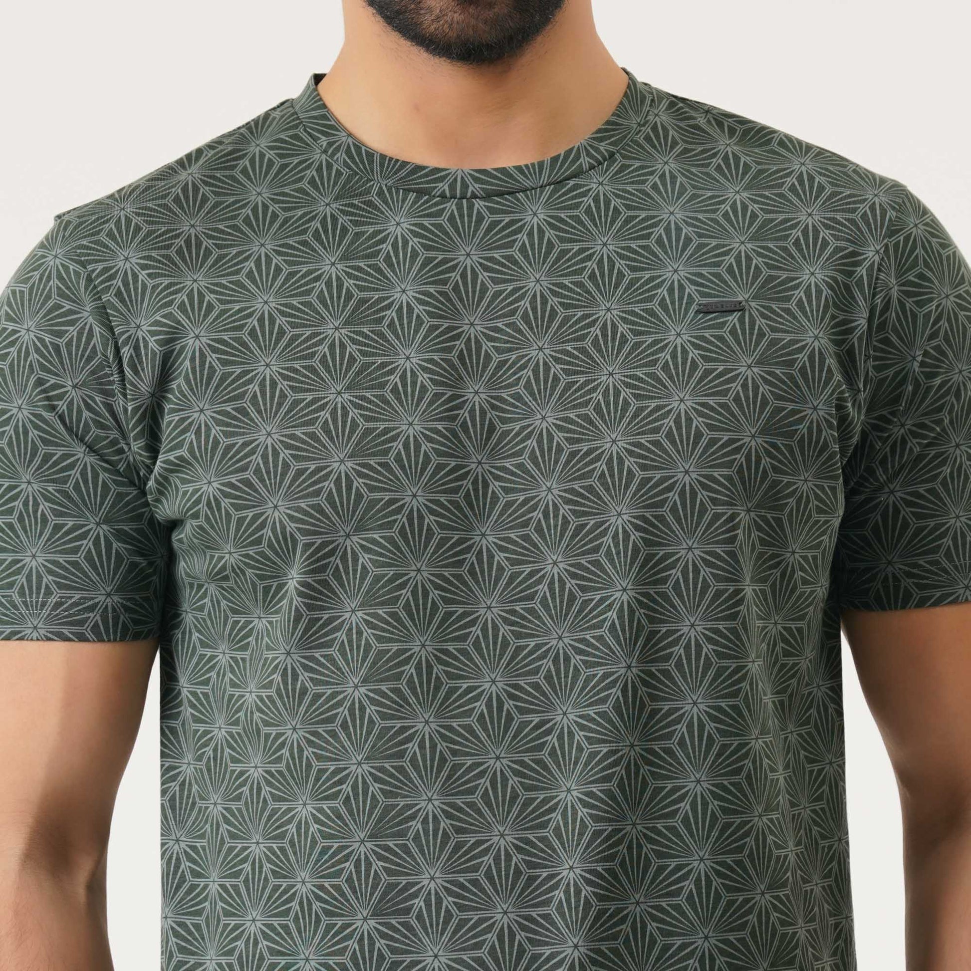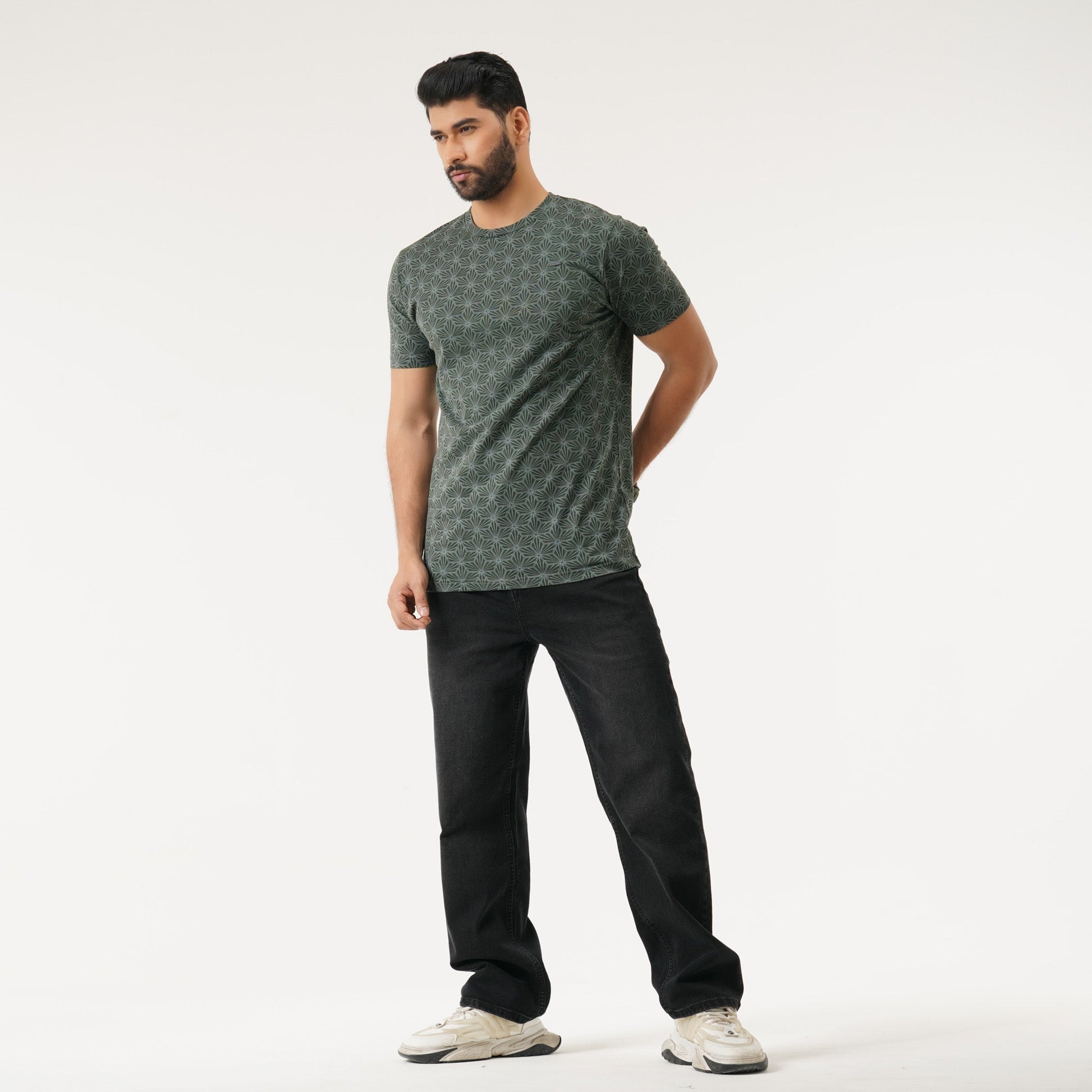 This charcoal green slim fit t-shirt is made from a high-quality 80% cotton and 20% polyester blend, 180 GSM. It features an all-over print with a metal badge at the chest, offering a stylish and comfortable option for everyday wear.