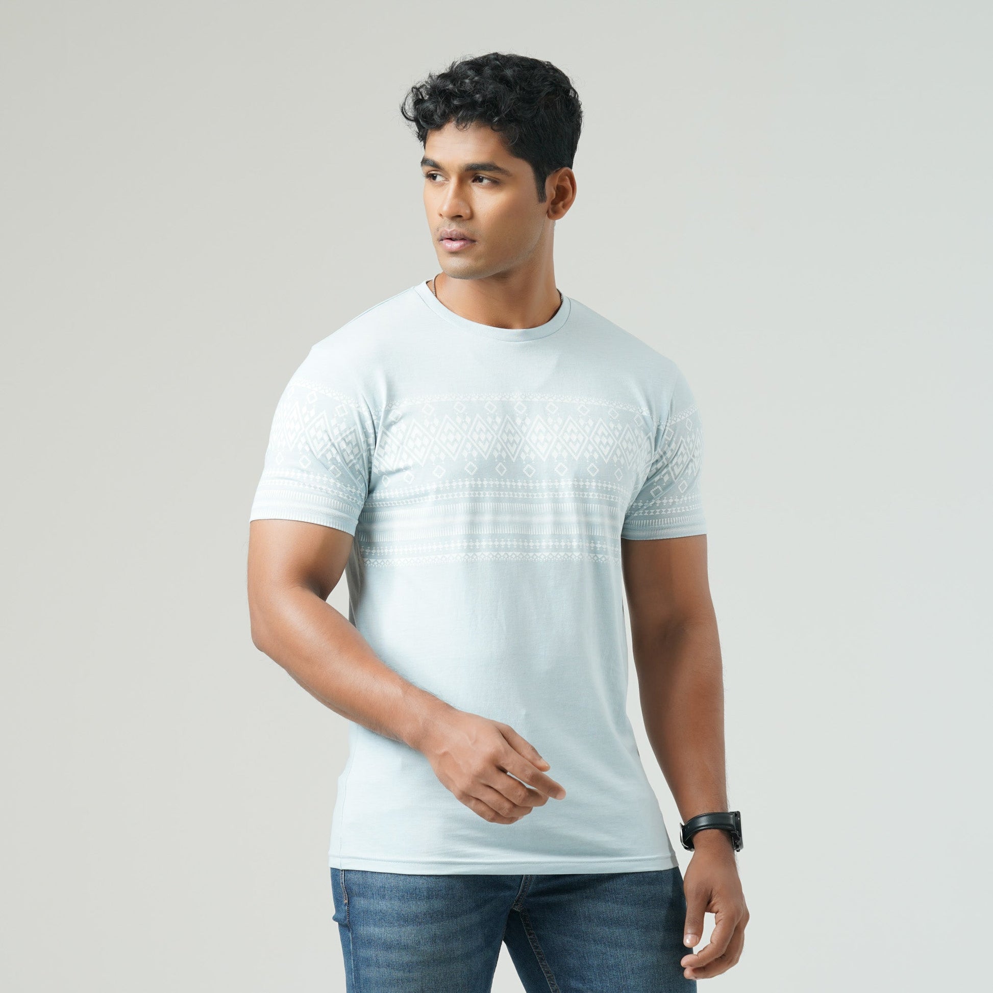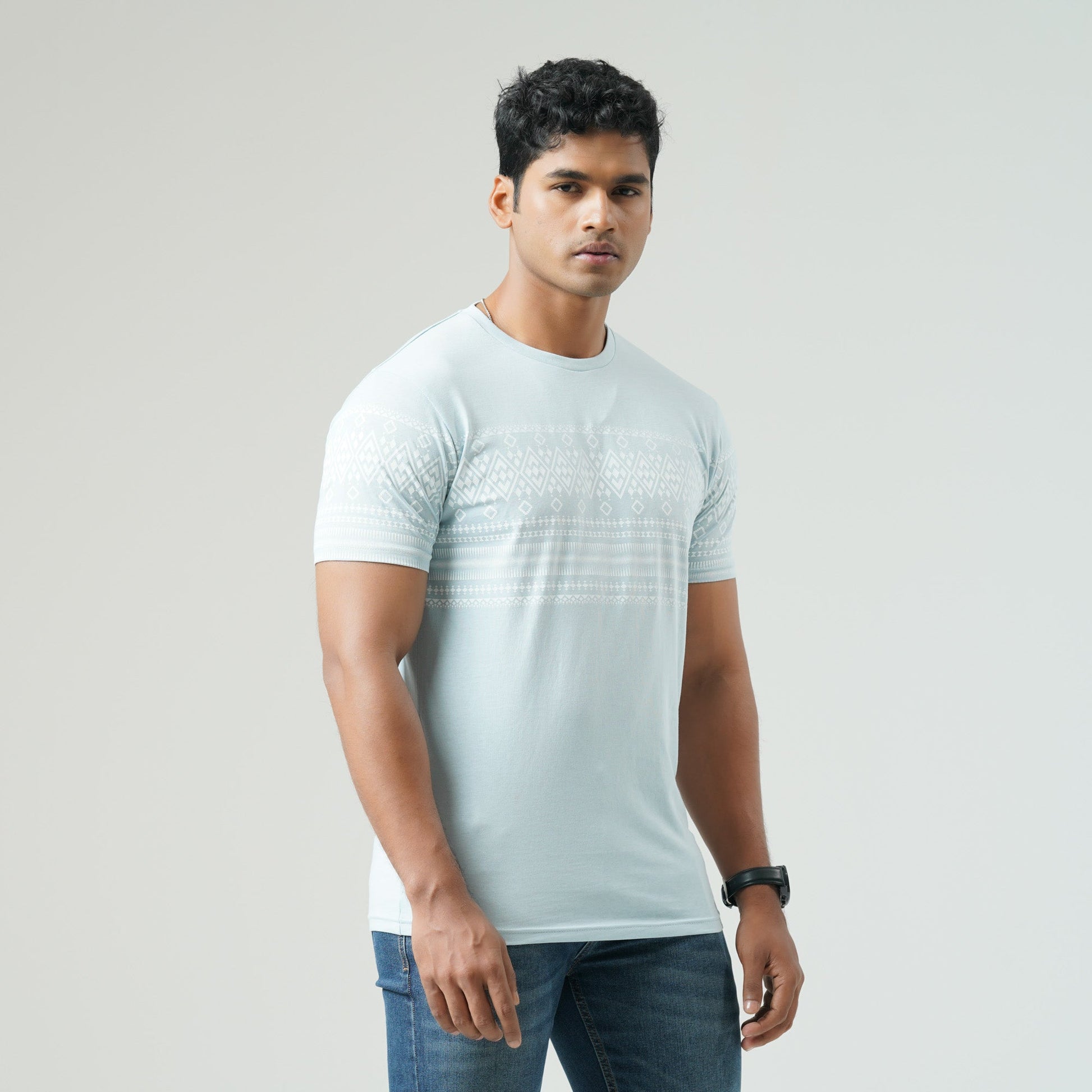 This stylish slim-fit T-shirt is made from a soft and durable 80% cotton, 20% polyester blend. Featuring a bold geometric graphic on the front and sleeve, it offers a modern look with a comfortable 180 GSM fabric. Perfect for casual outings or layering.