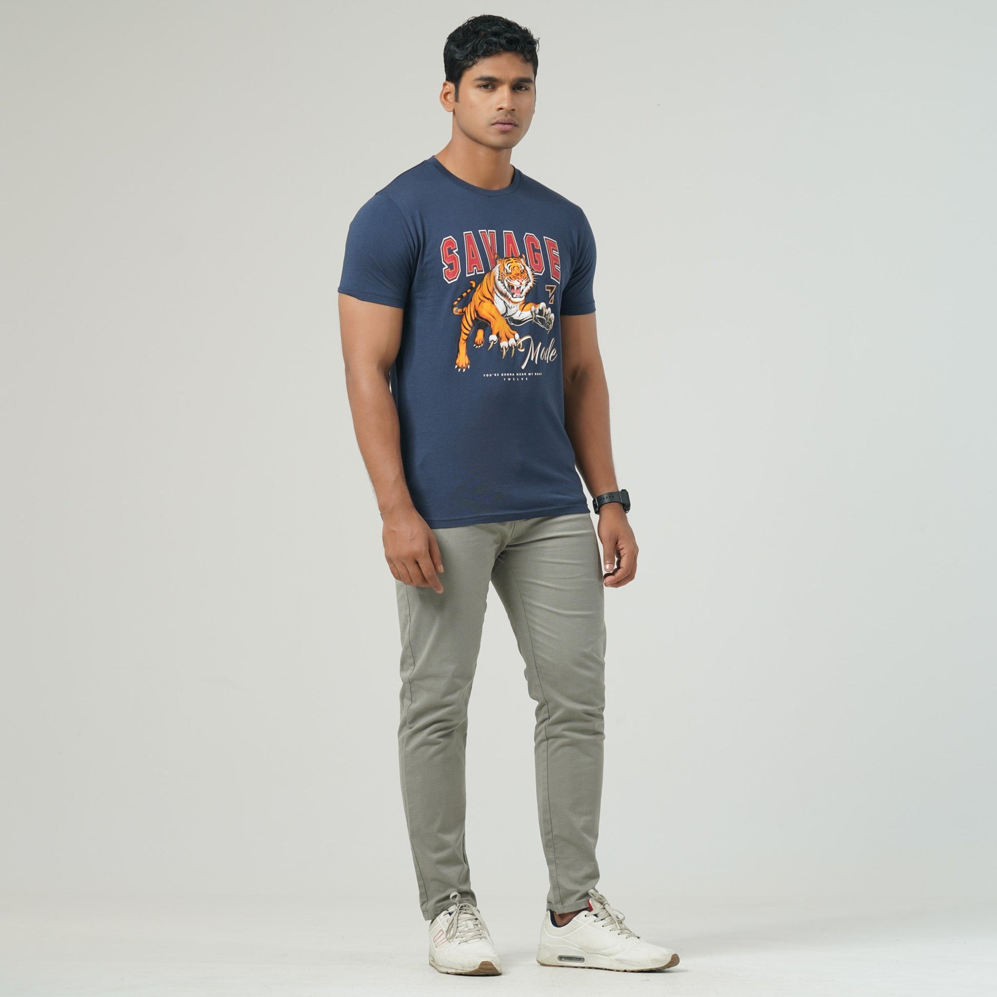Stay stylish with this slim-fit T-shirt crafted from a soft 80% cotton, 20% polyester blend (180 GSM). Featuring a bold tiger graphic on the front, this tee offers both comfort and a statement look for casual outings.