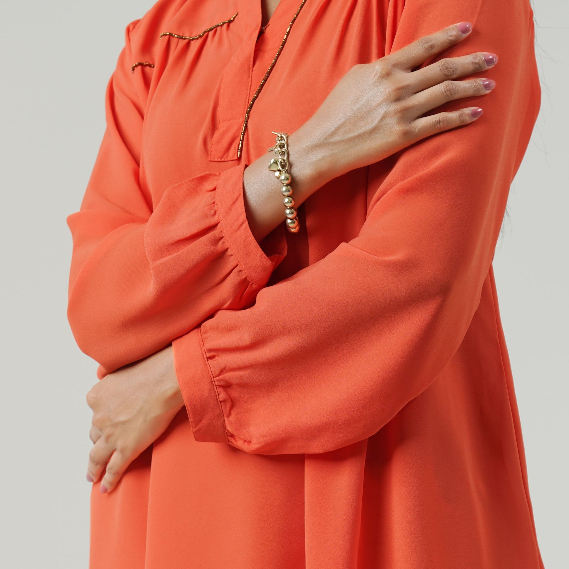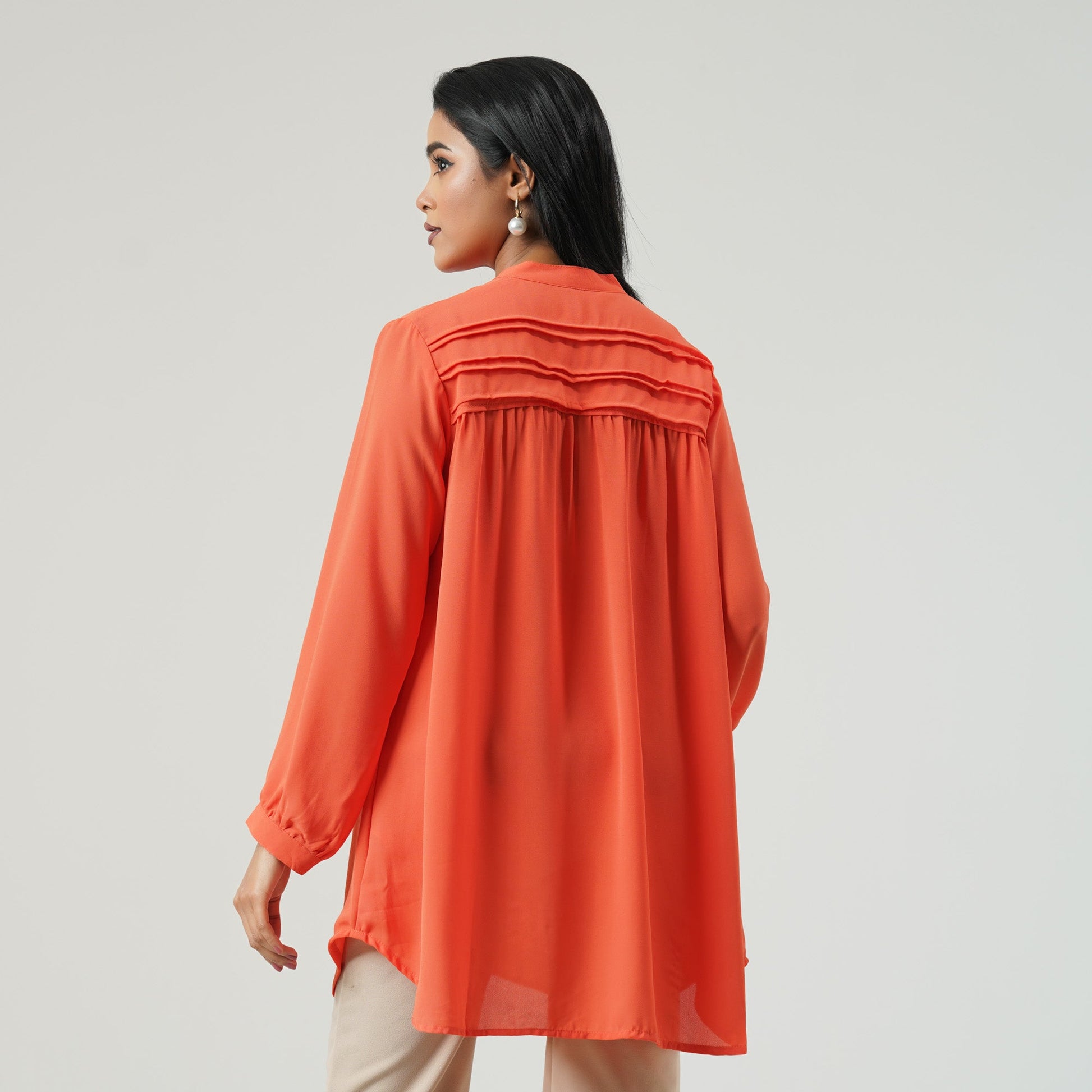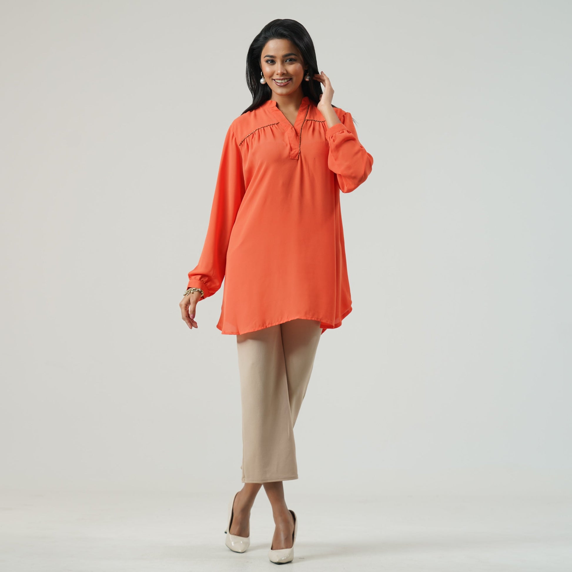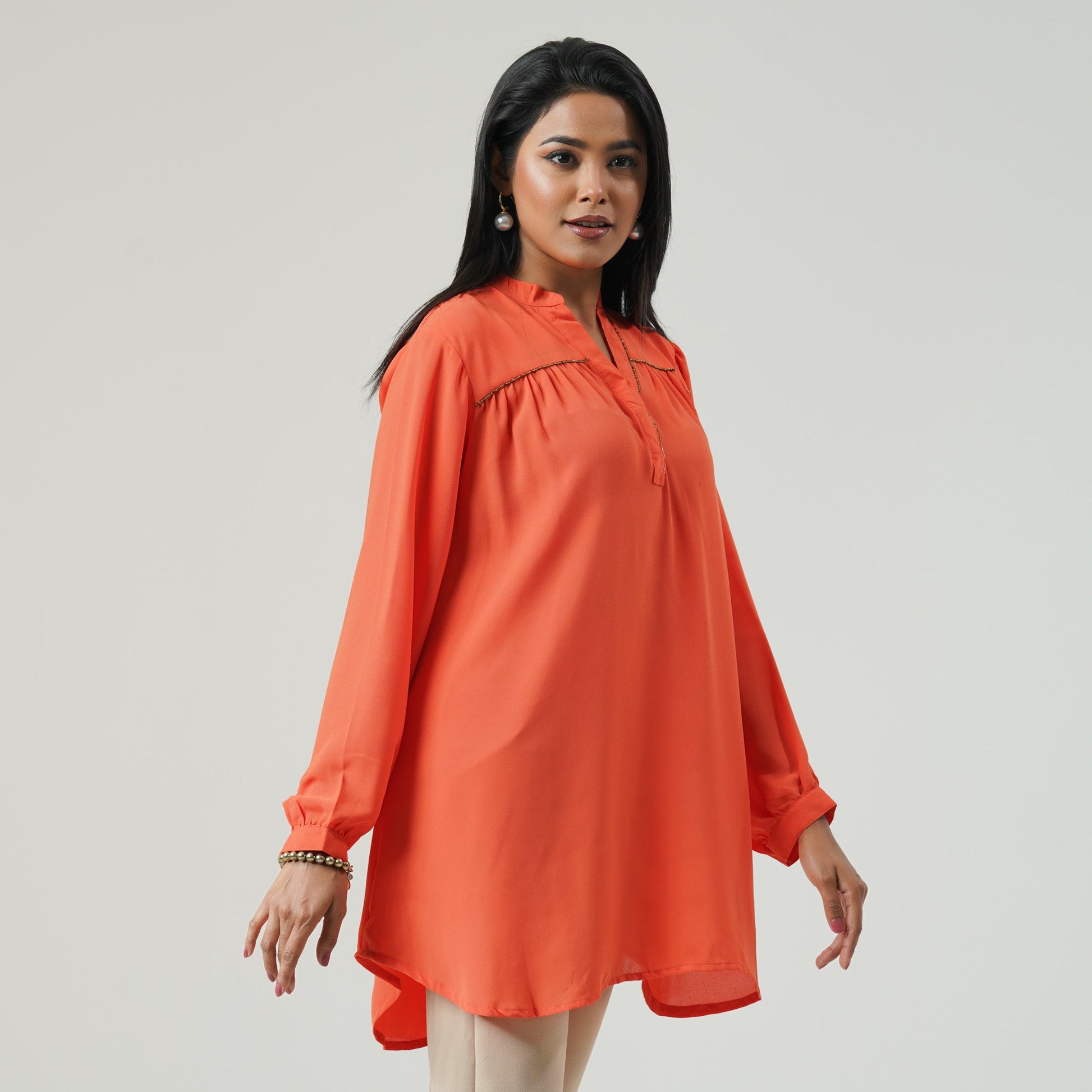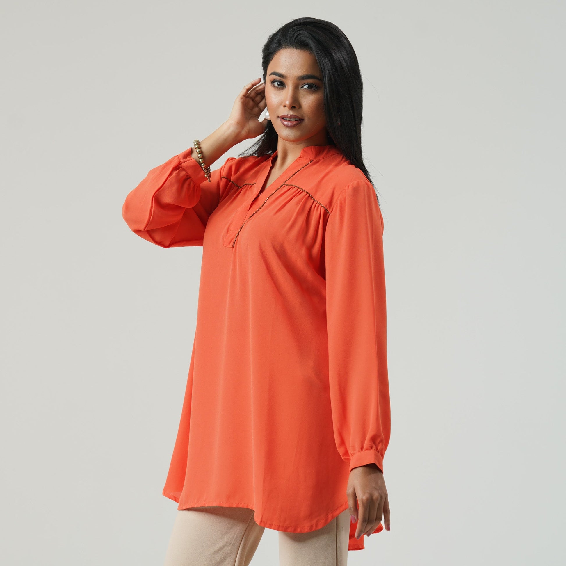 Elevate your wardrobe with this top in luxurious cotton blended fabric. The intricate design and vibrant orange color exude elegance and exclusivity, making it a perfect addition to any fashion-forward collection. Embrace your unique style.