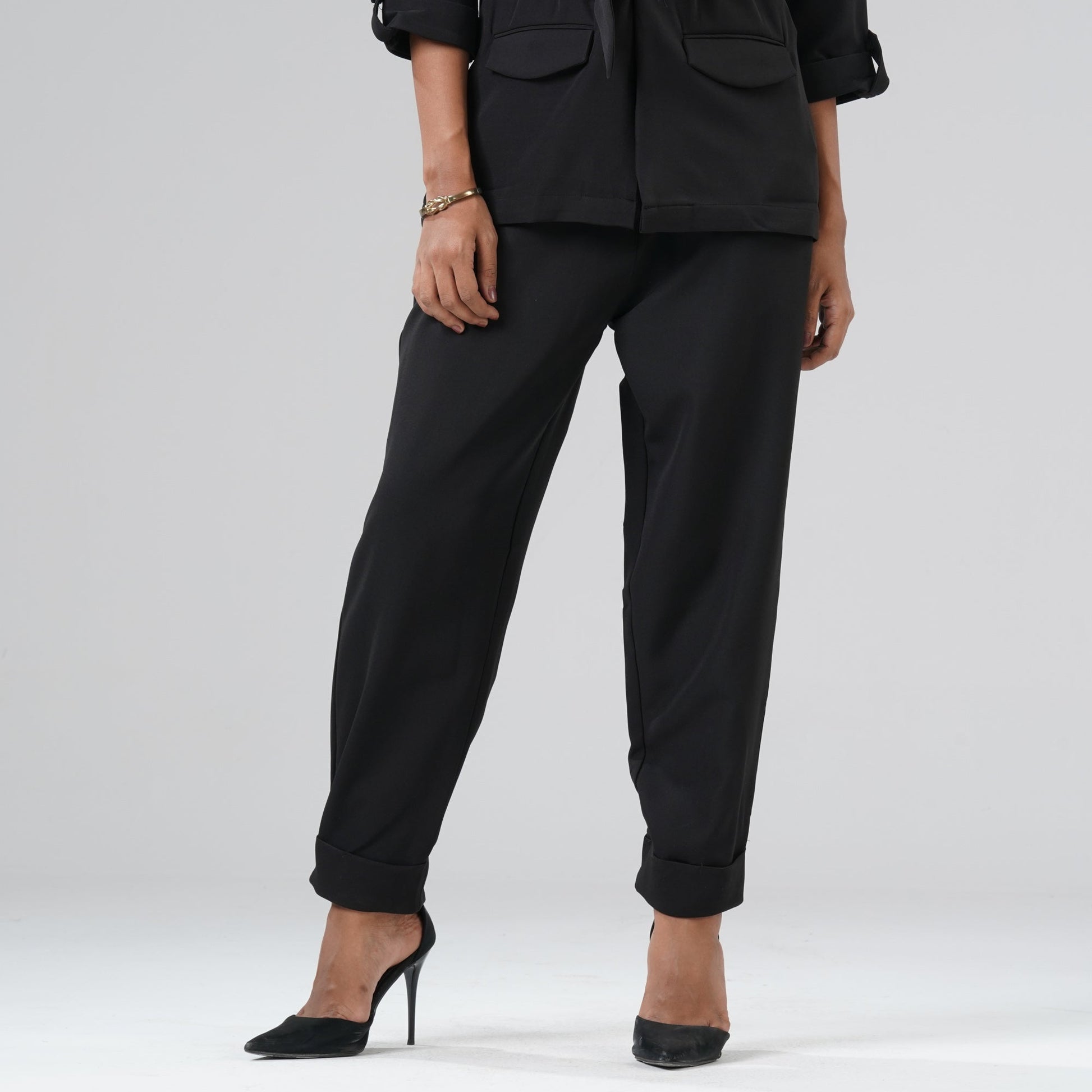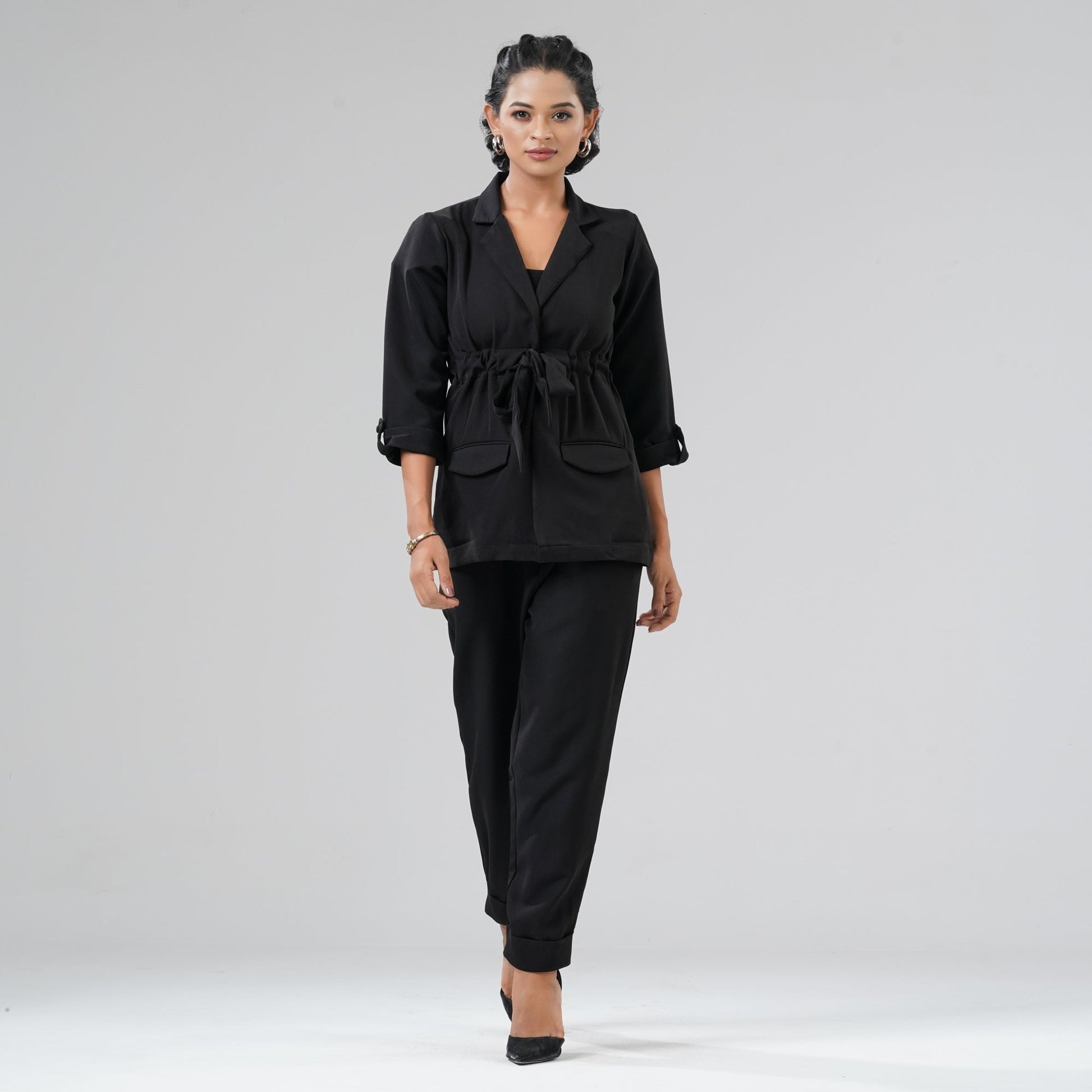 Redefine winter elegance with this women's black blazer set, featuring a solid open-front design with a notched lapel and long sleeves. Crafted with an inner waist channel and adjustable strap for a flattering fit, it includes two functional pockets and a waist belt at the bottom. Perfect for a polished and stylish winter look.