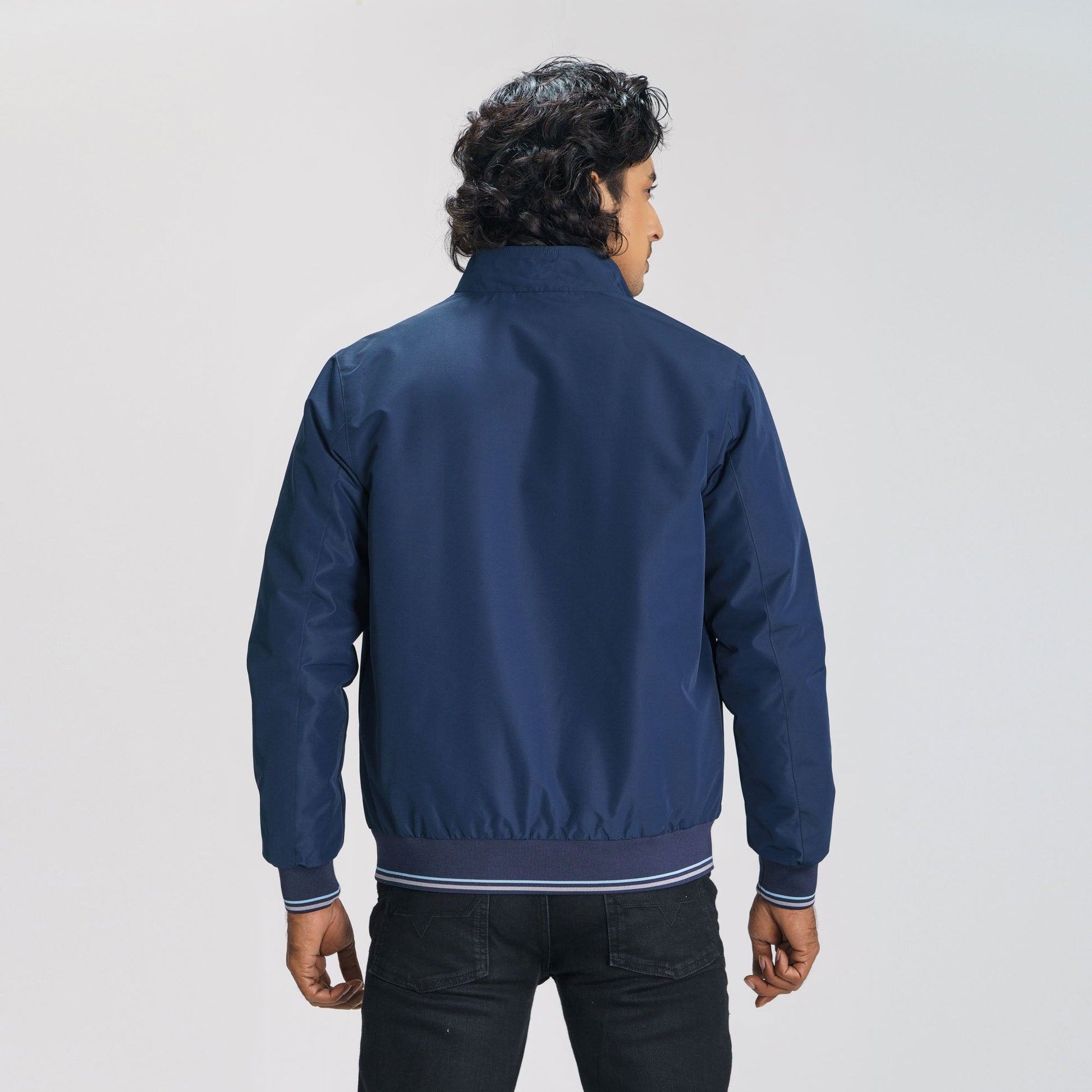 This navy bomber jacket features a sleek, non-padded design with a mock collar and tipping rib for a sporty look. It includes two practical pockets, long sleeves, and a straight hemline for a comfortable fit. Crafted from 100% polyester with a solid lining, it’s a versatile addition to your wardrobe, perfect for casual outings.