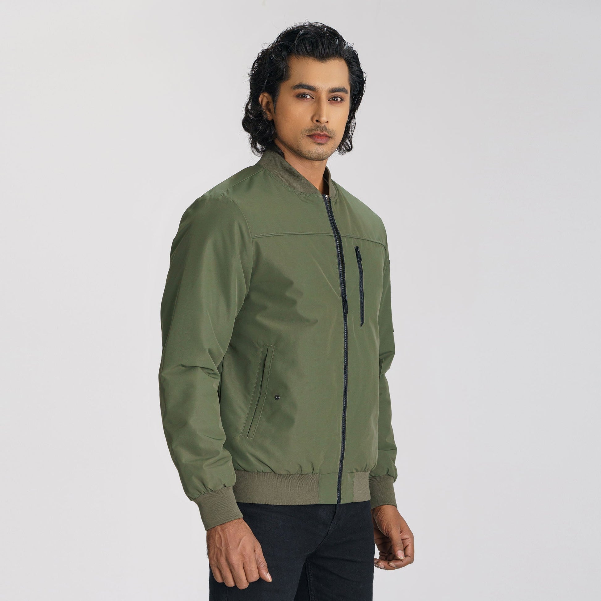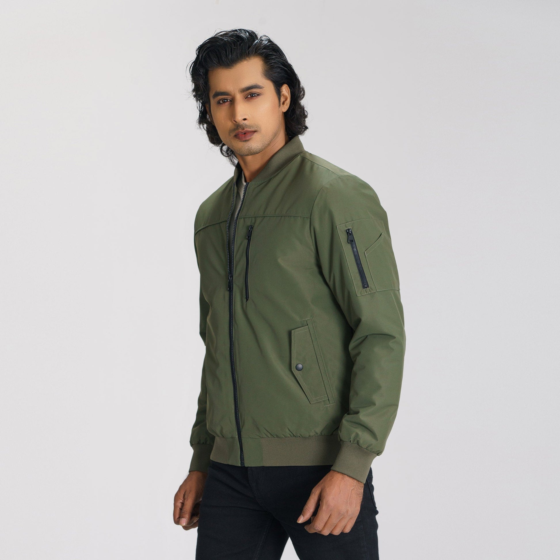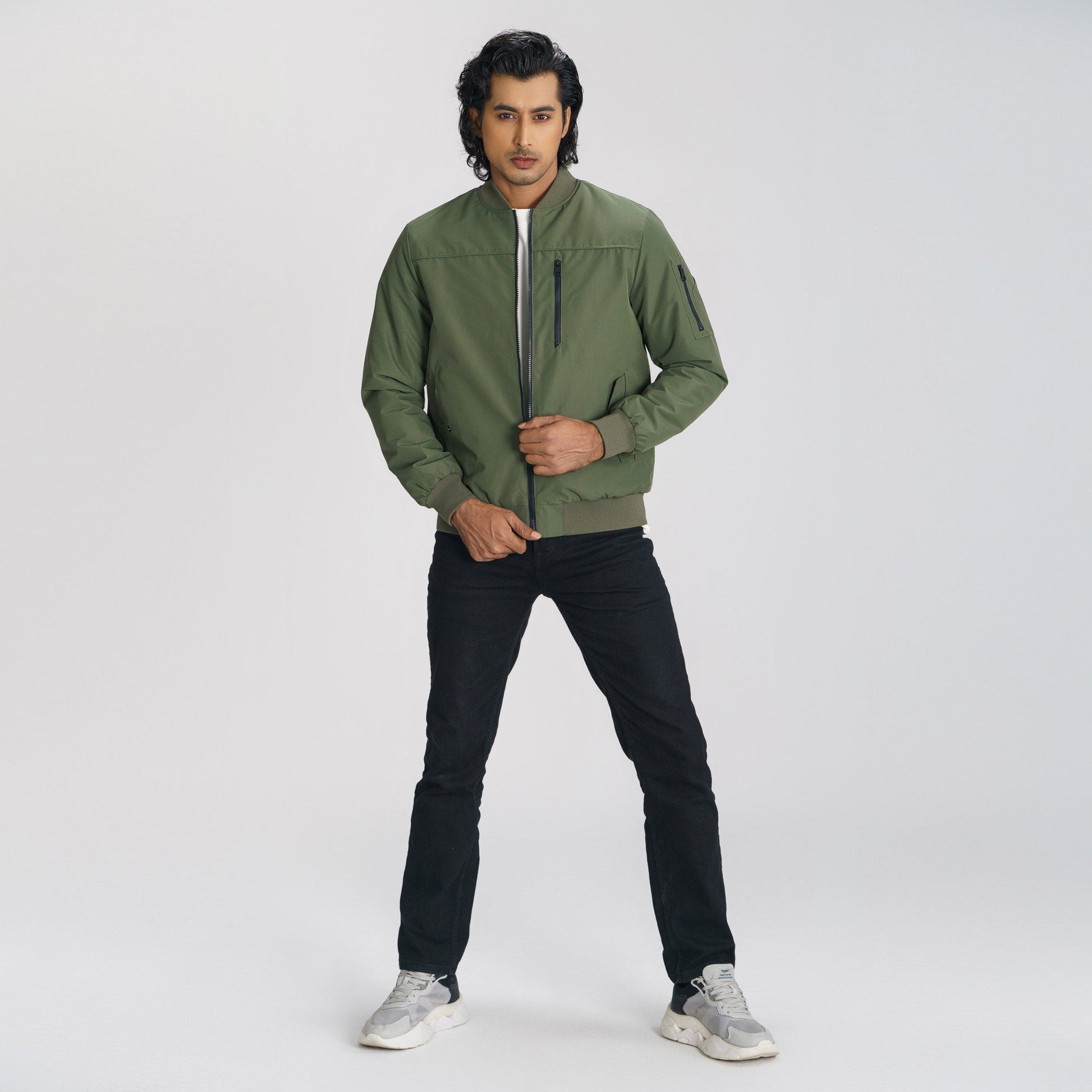 Stay stylish and warm with this olive bomber jacket. Featuring a stand collar, two flap pockets, and a straight hemline, it blends functionality with fashion. Made from 100% polyester with a solid lining, it offers a comfortable regular fit. Perfect for casual outings and cool weather.