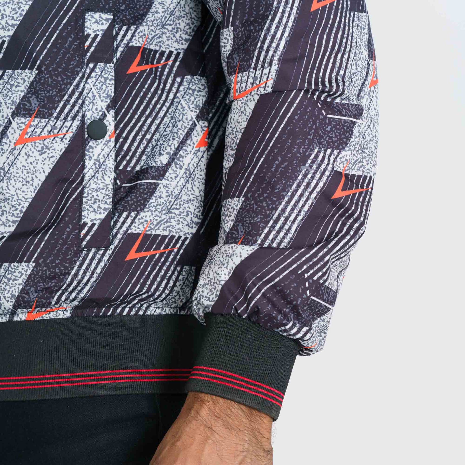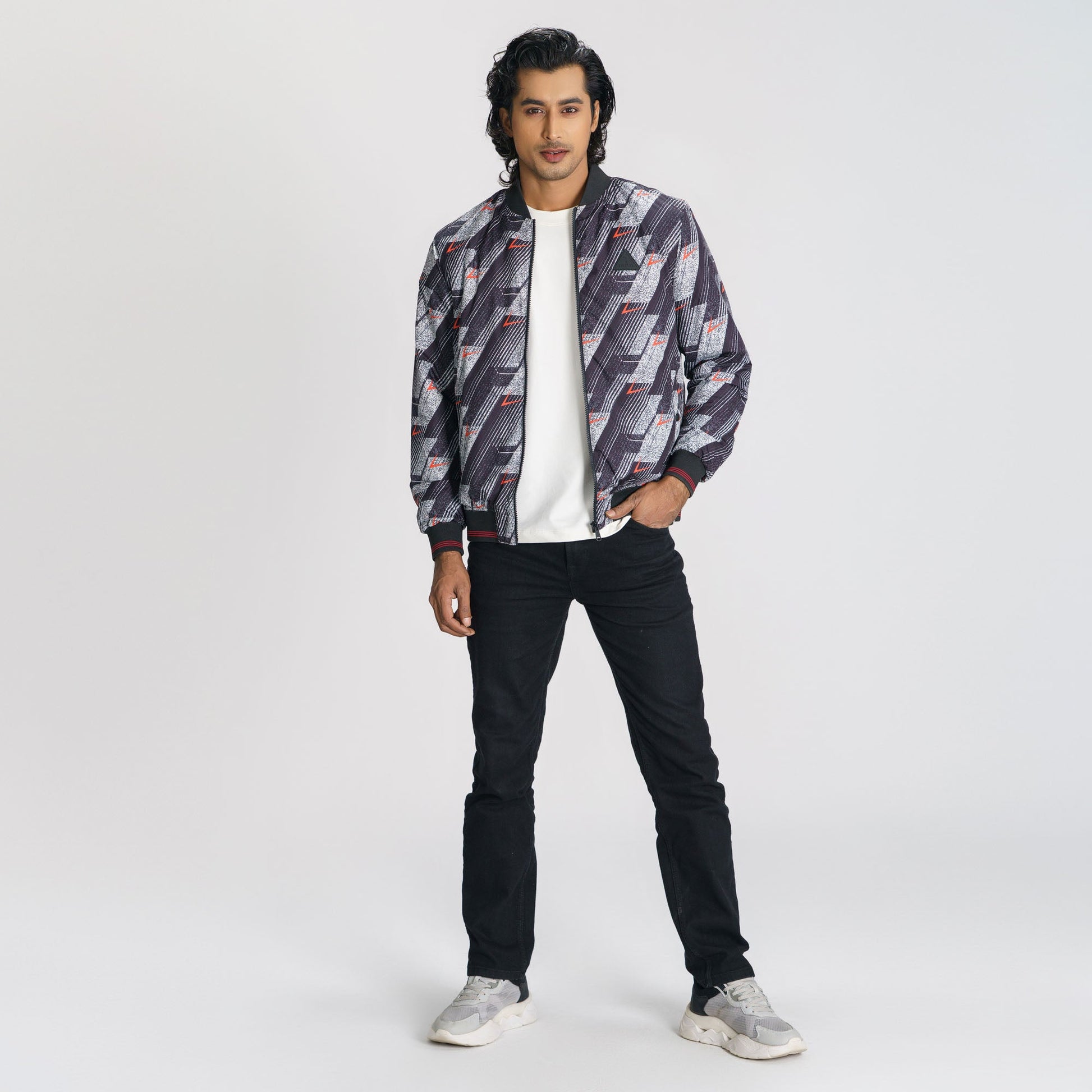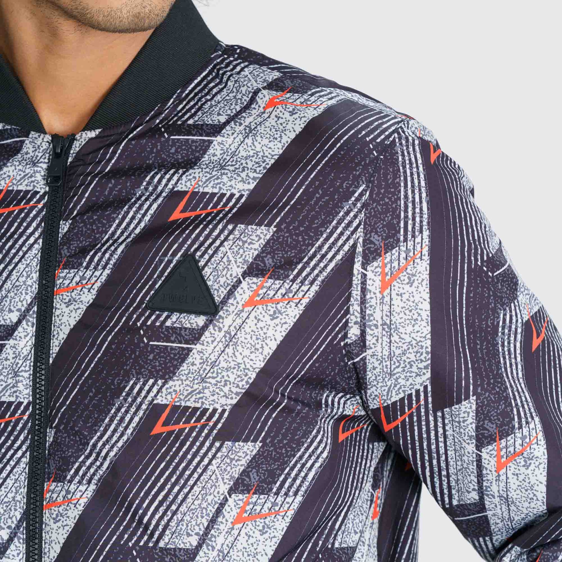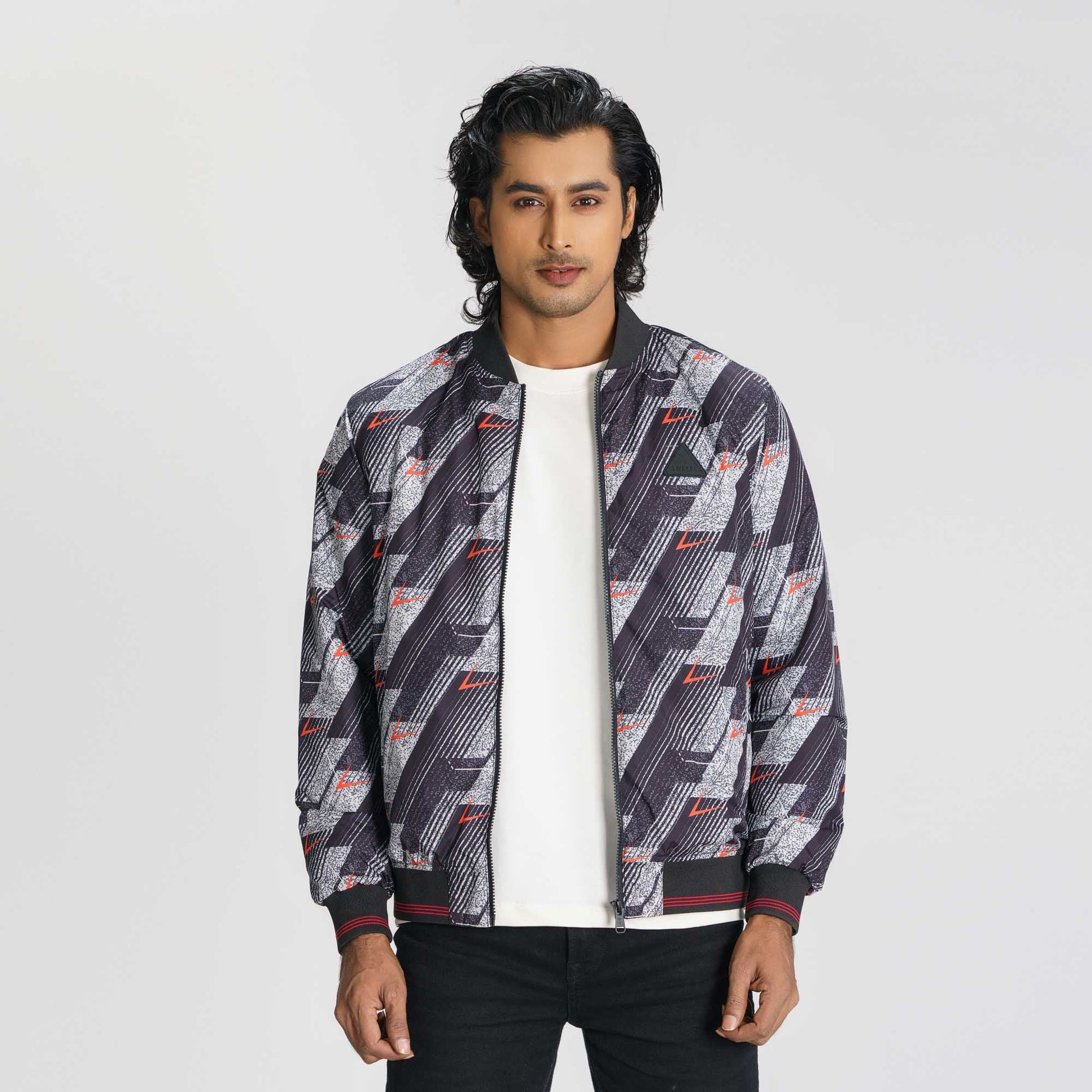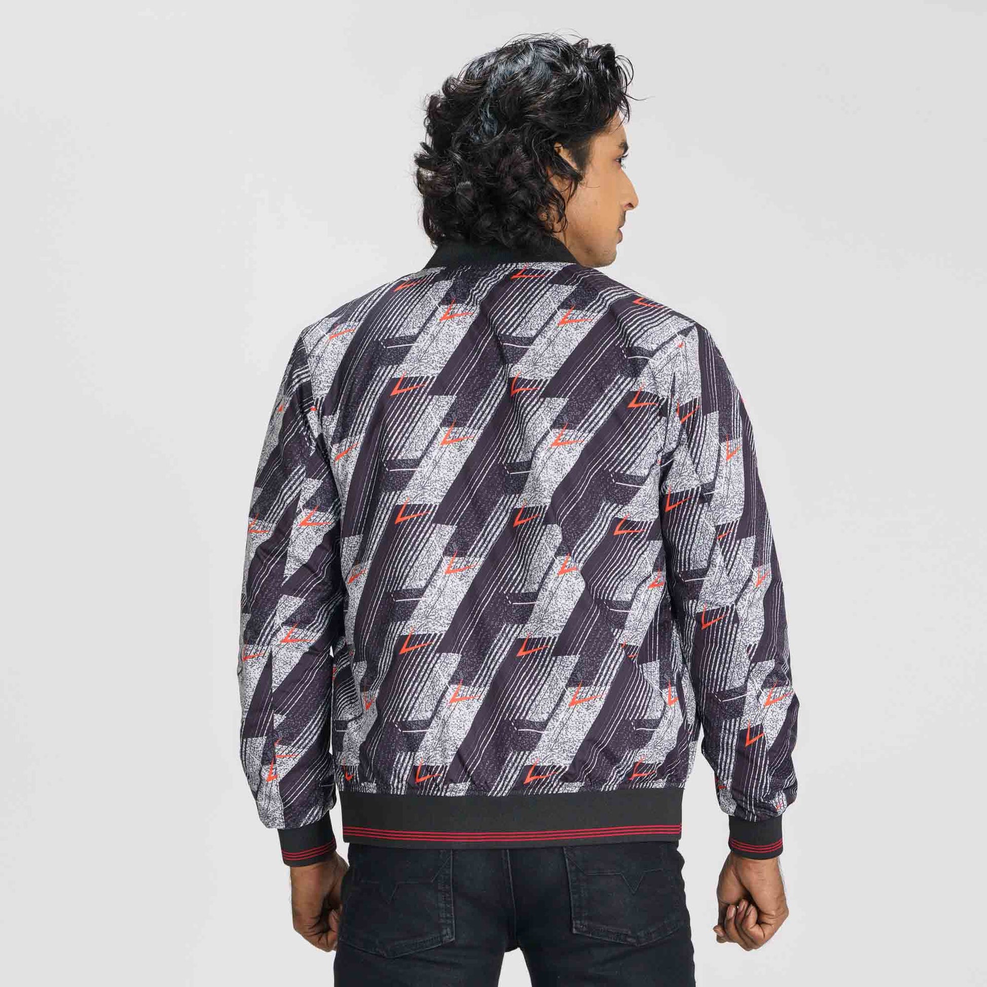Stand out with this men’s black and red printed bomber jacket. Designed with a stand collar, tipping rib details, and a straight hemline, it delivers a bold and stylish look. Featuring two convenient pockets and long sleeves, this regular-fit jacket is crafted from durable polyester with a solid lining, perfect for everyday wear or cooler days.