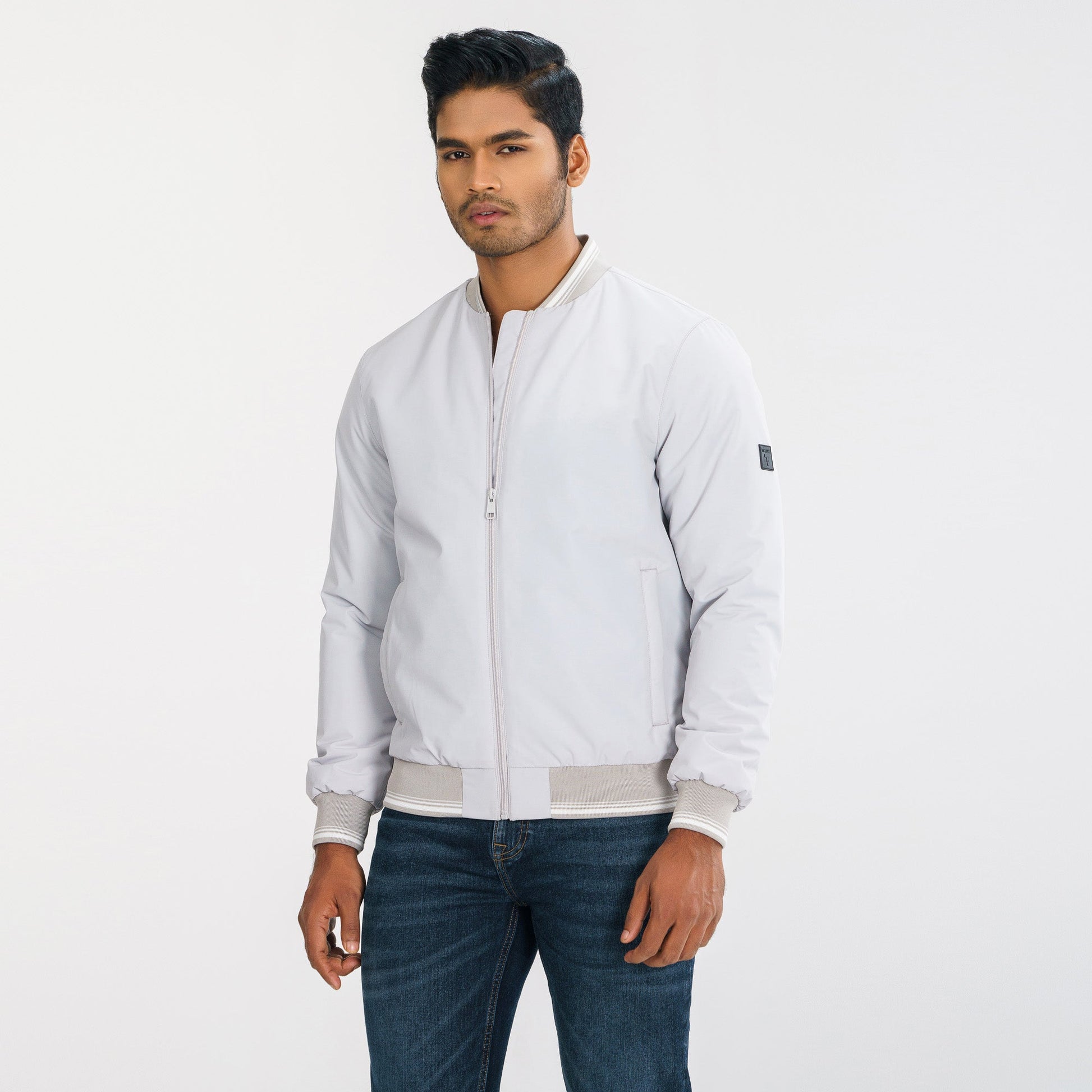 This men’s gray bomber jacket combines style and comfort with its stand collar, tipping rib, and straight hemline. Featuring two pockets and a solid polyester lining, it’s perfect for casual wear. Made from durable polyester in a regular fit, it’s a versatile choice for any occasion.