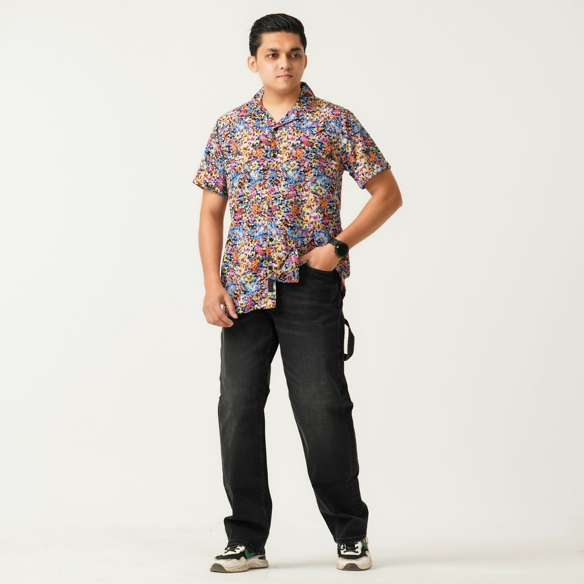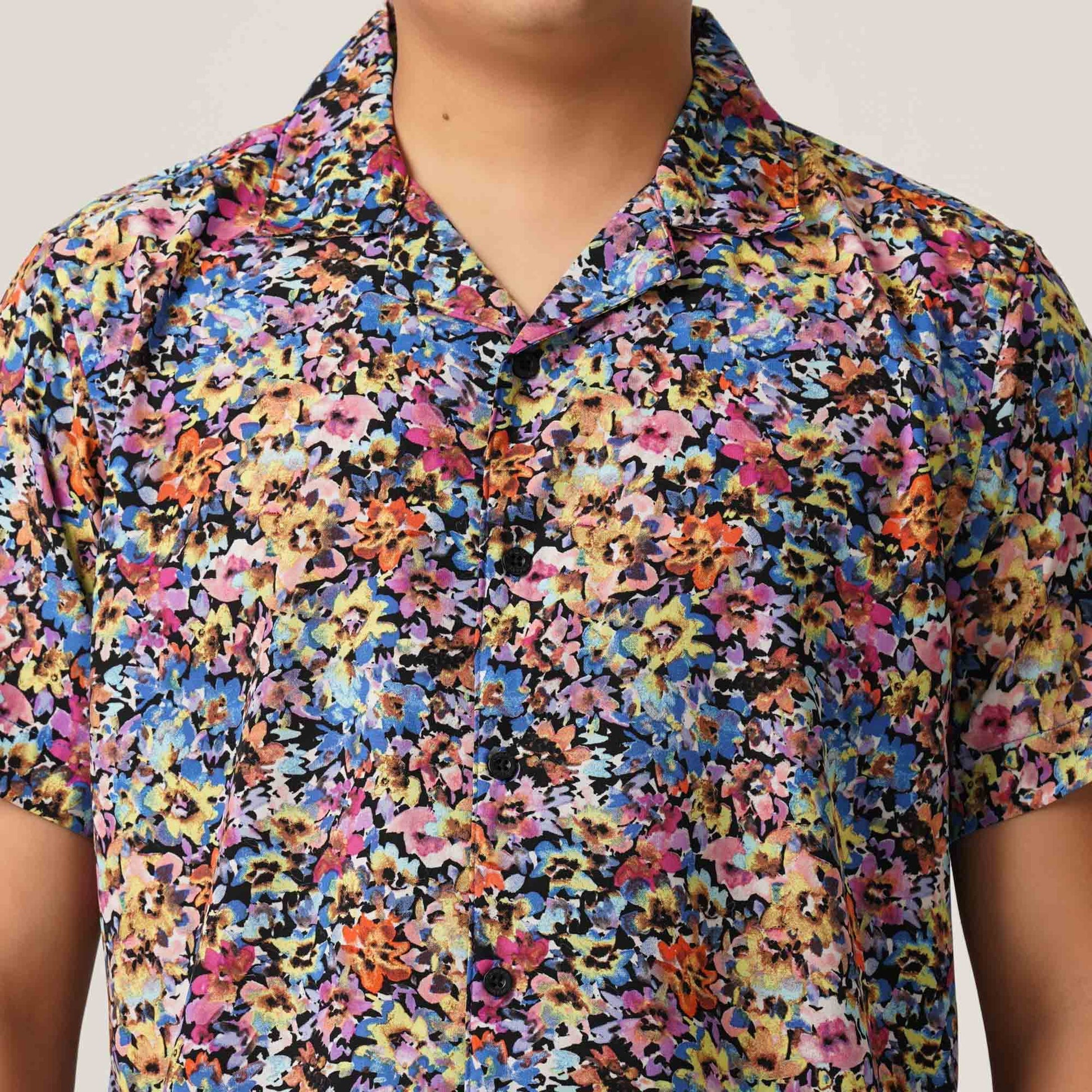 Crafted from smooth viscose fabric, this casual shirt features an all-over navy pattern for a bold, vibrant look. Ideal for relaxed gatherings or weekend outings.