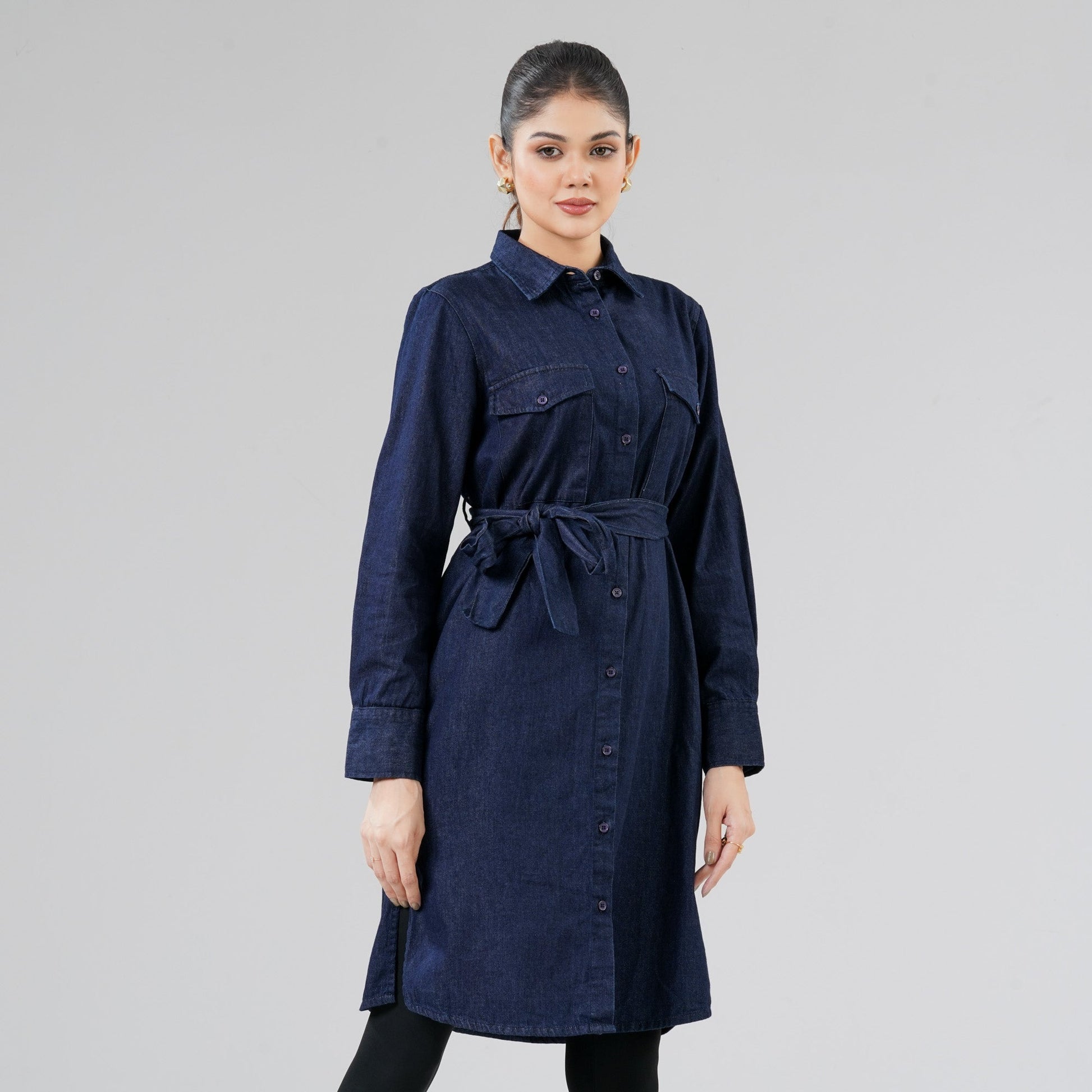 Elevate her casual winter style with this womens indigo denim dress, Designed in a regular fit with long sleeves, it features dual chest pockets with flaps and a waist belt with loops for a flattering shape. The back tail and rounded hemline add a stylish touch, making it perfect for everyday wear.